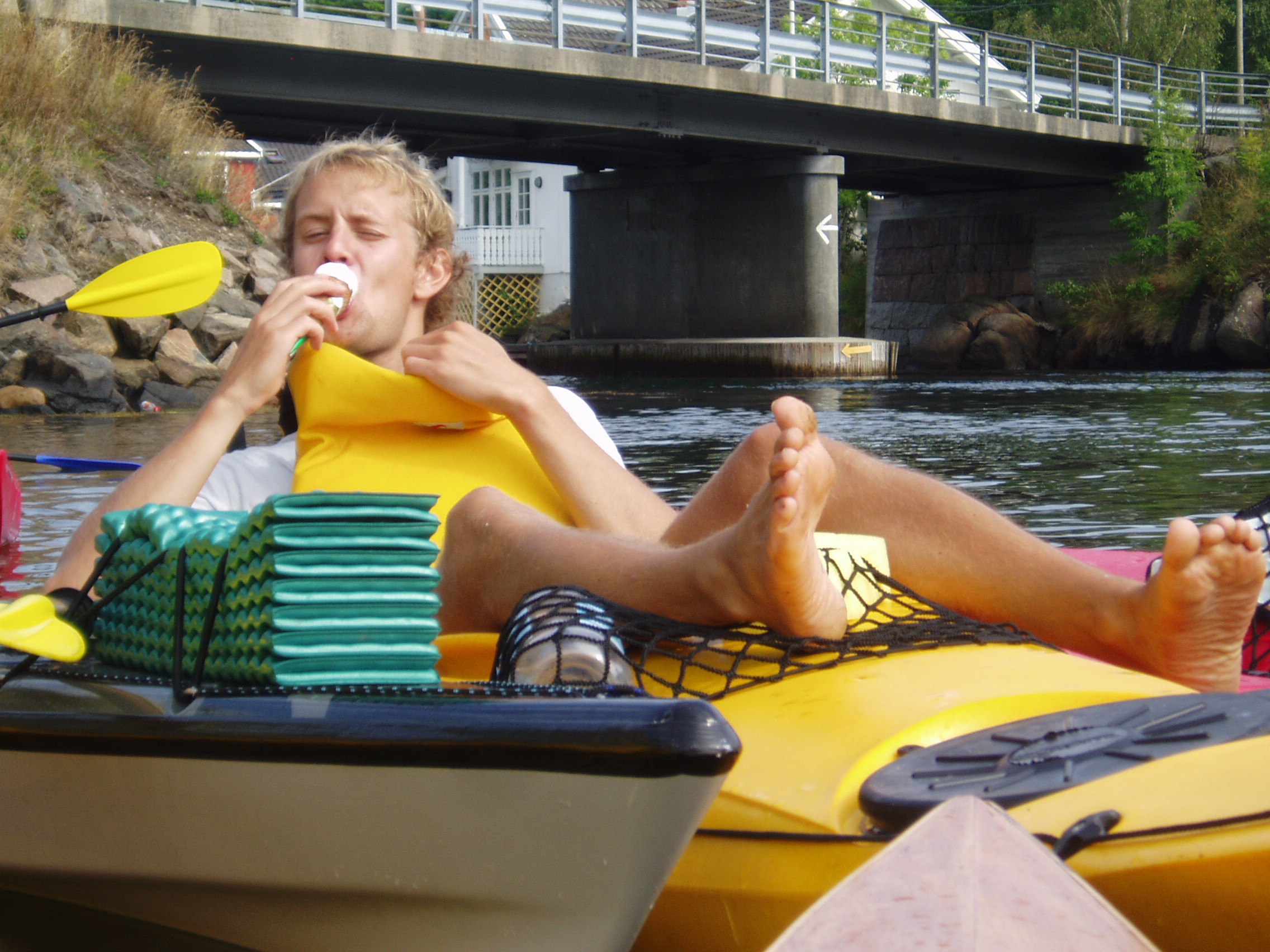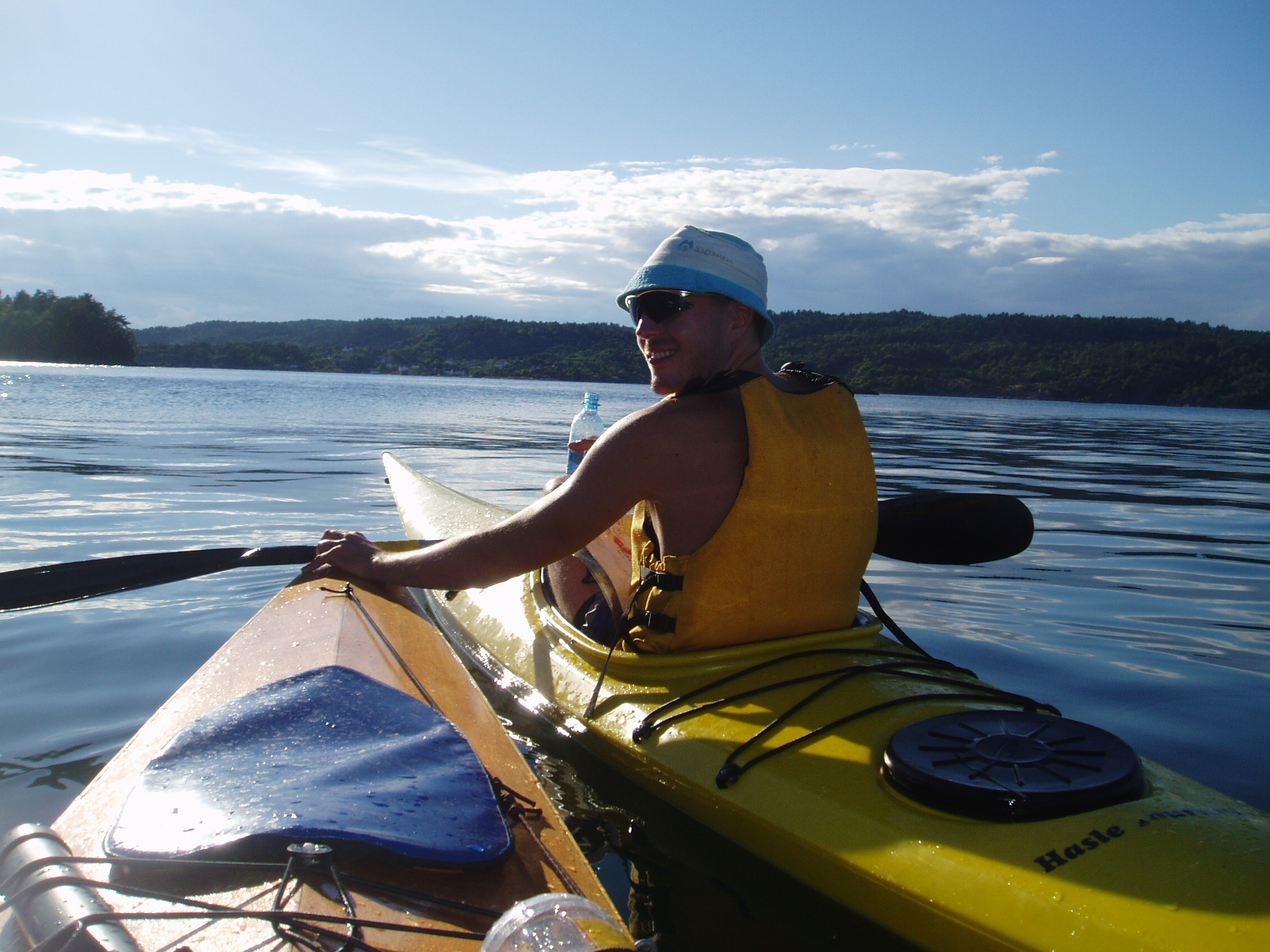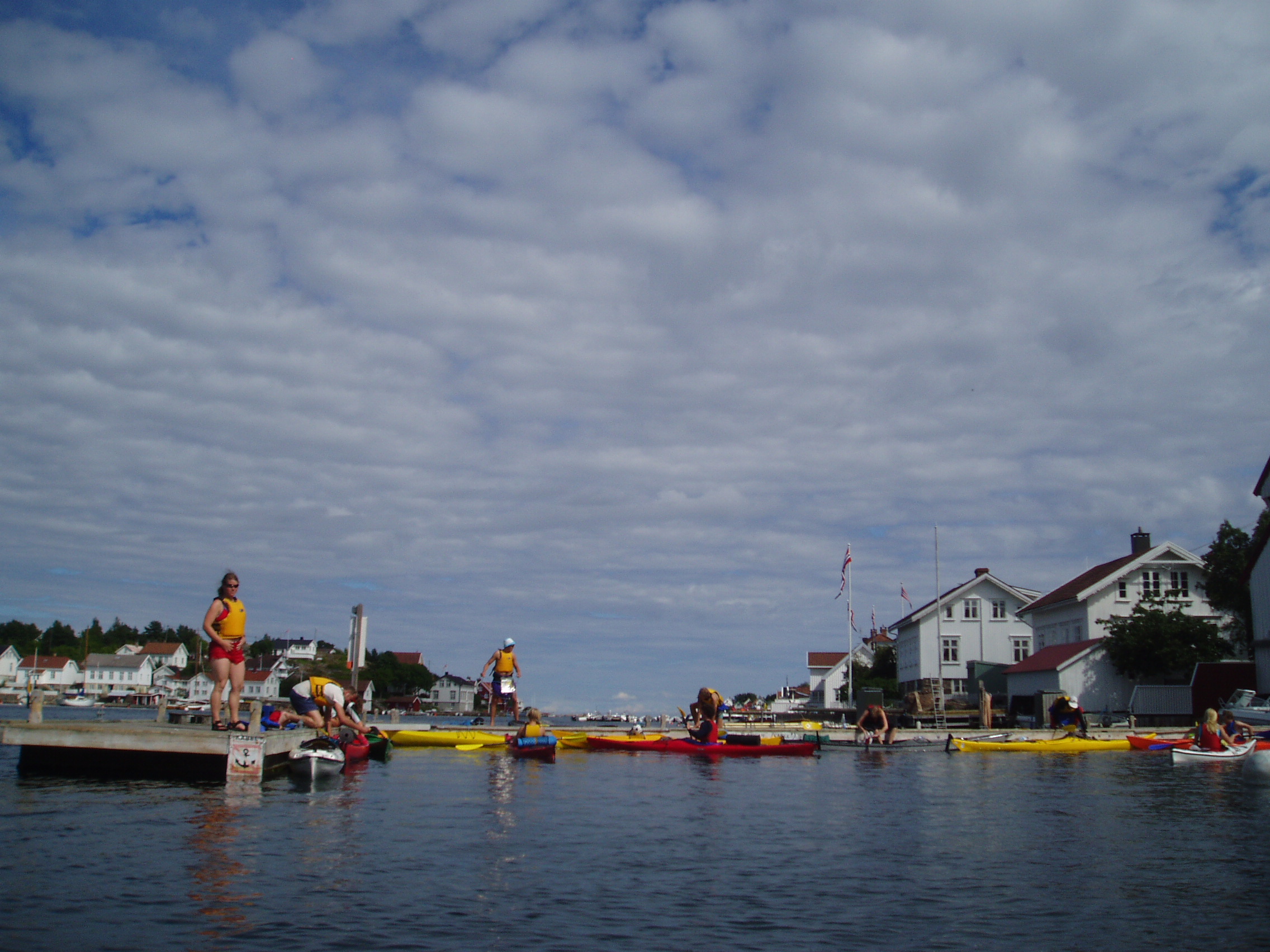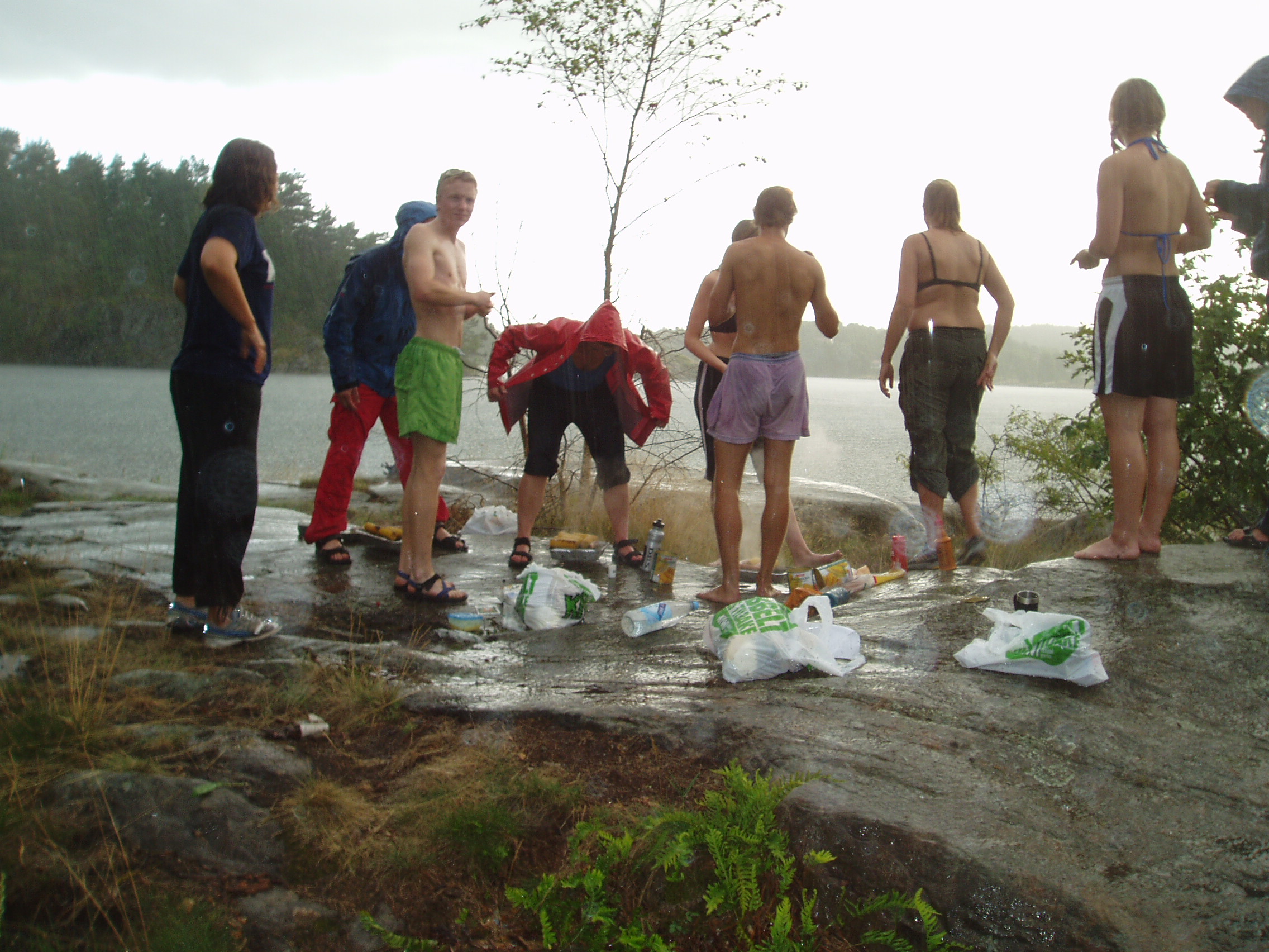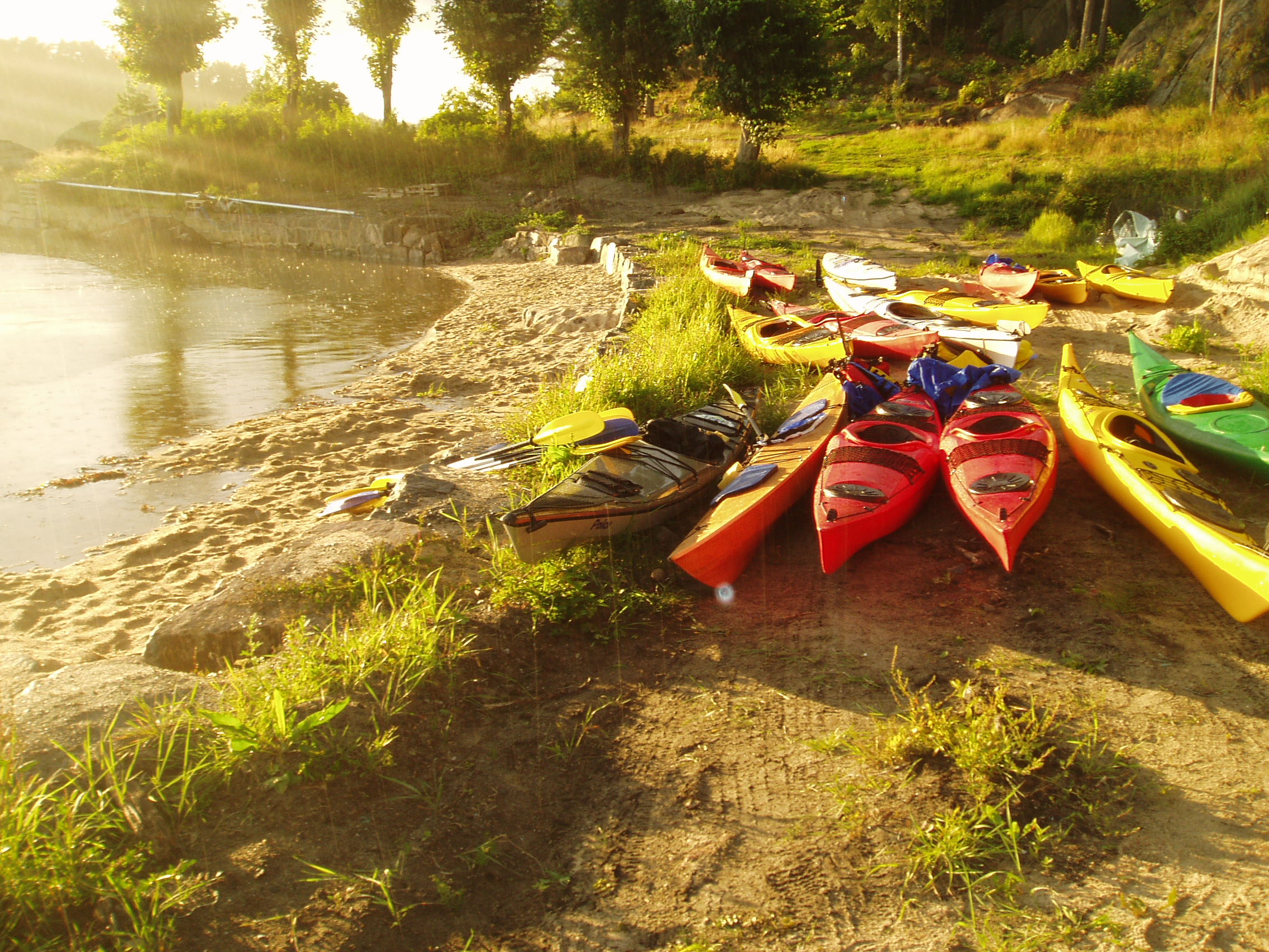 Vi møtte opp kl fem ved det nye kulturhuset i Arendal. Derfra dro vi samlet ut til Eydehavn, ca 15 min østover, plukket opp kajakkene fra Padlespesialisten rett før Tromøybroa, fylte vann på flaskene på en bensinstasjon, og spiste is! Så kjørte vi ut ytterst til Buøya der vi slo leir for kvelden. Det var en flott plass med fine bukter. Eneste minuset var at vi neste morgen ble vekket av et par utsendte gressklippermenn fra fylkeskommunen, som sa at det ikke var lov å campe her… Men vi hadde hatt en flott kveld som begynte med sol, som ble plutselig (ett minutt etter siste telt var satt opp…) avbrutt av kraftig regnvær som slukket grillene fulle av pølser og maiskolber, og fristet halvparten av gjengen ut i sjøen. Regnet ble etterfulgt av torden og lyn, men det varte ikke så lenge, og vi fikk en fin kveldssamling uten regn. Før kveldssamlingen hadde en gjeng kjørt bilene tilbake til Arendal – i nærheten av busstasjonen, mens andre prøvde kajakkene eller bare satt og pratet.