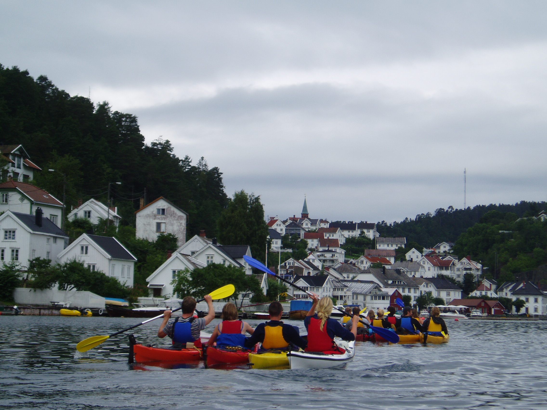 Søndag morgen var det litt grått, og idet vi satte oss i kajakkene kom det noen få drypp… Vi padlet sørover før vi rundet Apalen, og vendte nordøstover mot Tvedestrand. Vi hadde stille stund i kajakkene denne dagen, for det begynte å regne. Og da vi nærmet oss Tvedestrand, fant Hege på at vi må vel kunne ankomme med stil – følgelig ble det arrangert polynese med aspirantene som ledet an! Vi hadde flere runder på sjøen, både en og en, parvis, fire og fire kajakker ved siden av hverandre, ”tunnel” under årene osv!