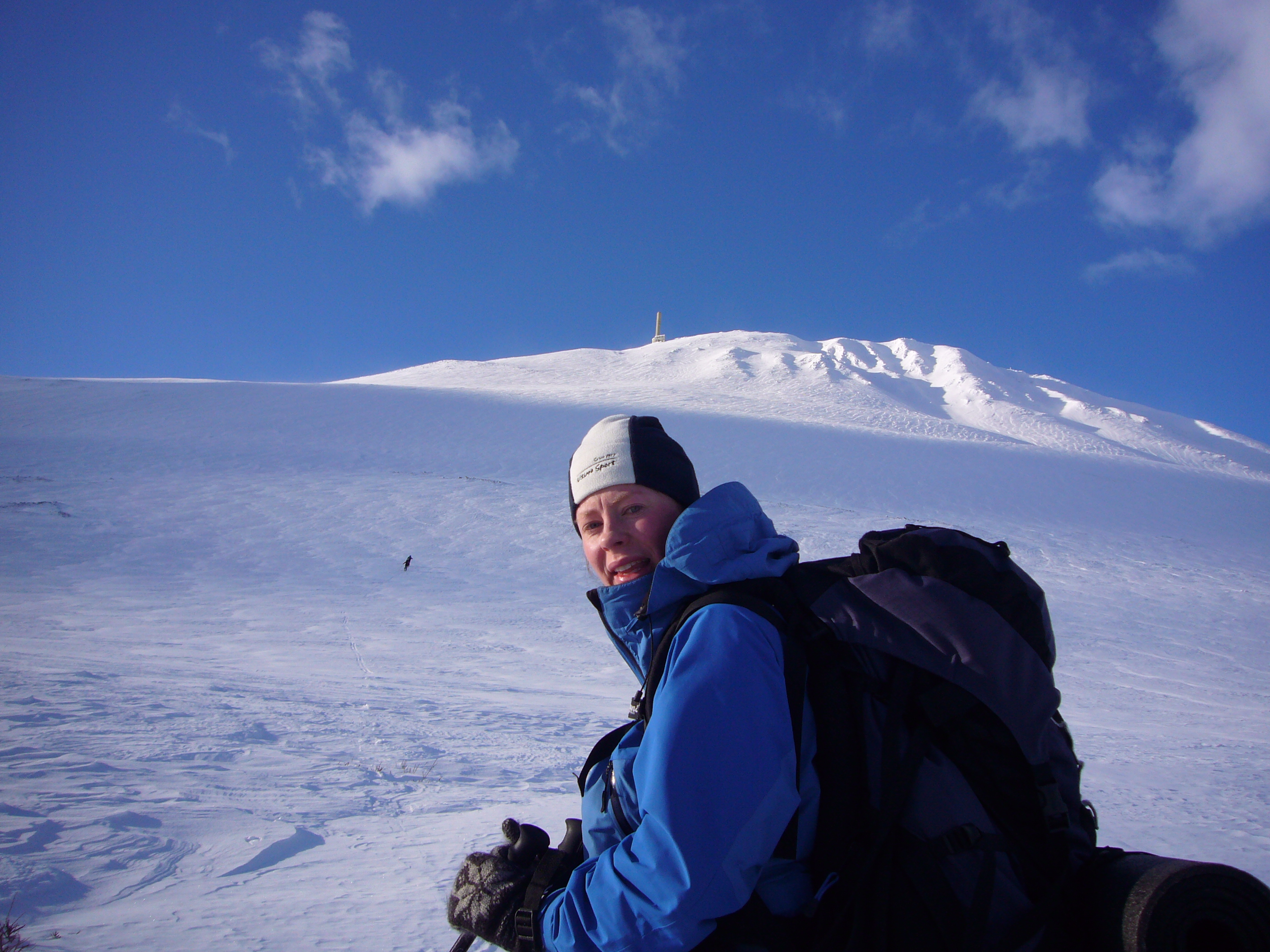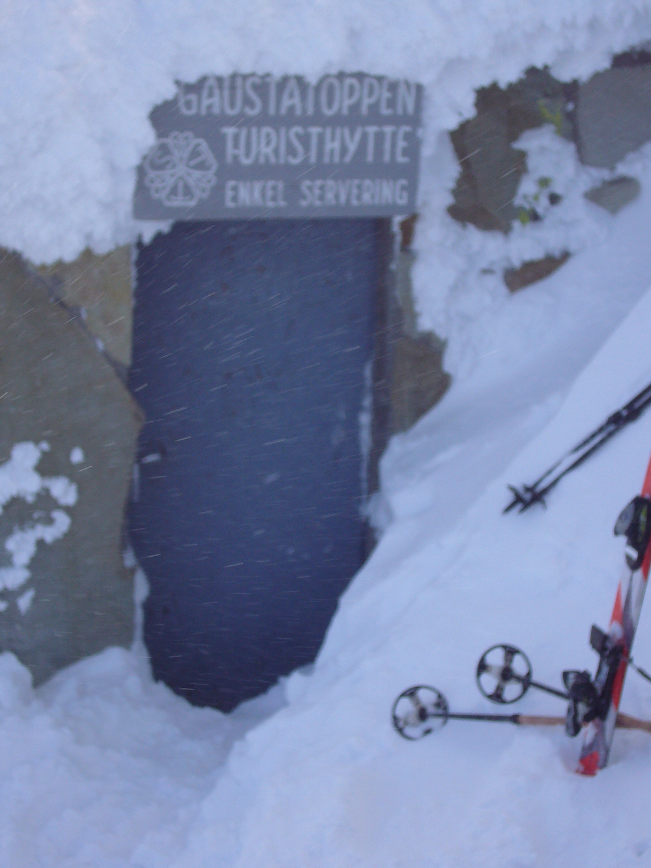 Vi våknet opp til nydelig vær, tok på oss skiene og gikk oppover mot toppen fra østsiden. Lars og Mette snudde underveis, mens vi andre tre fortsatte mot toppen. Flott utsikt utover, det sies at på virkelig fine dager kan man se 1/6 av Norge fra Gaustatoppen! Det blåste godt, så vi stuet oss sammen med en gjeng andre inne i forganga til Gaustatoppen Turisthytte (Telemark Turistforening).