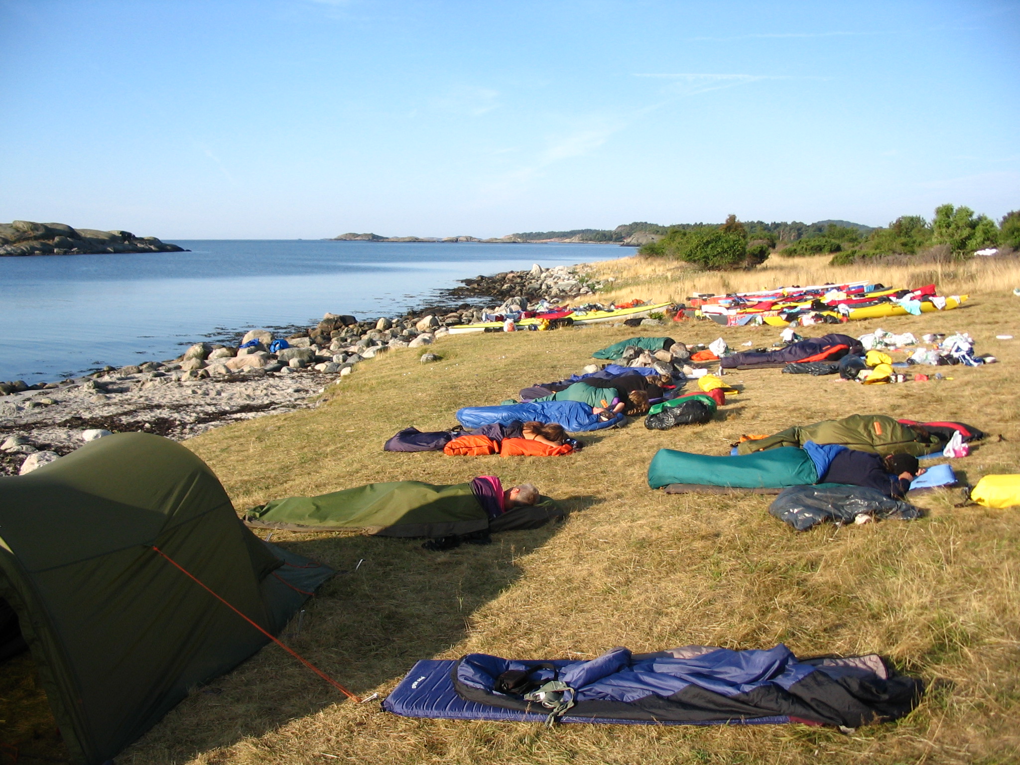 Padlet utaskjærs mot Grimstad på formiddagen, utaskjærs til Håøya, gjennom Rivingsgapet, opp på østsiden av ytre Maløya og inn og hadde lunsj lunsj i Leikholmsund, ei vik på nordsiden av Ytre Maløya. Bra lunsjplass med strand og grasslette, og plass til leik og moro. Friareal, litt mye folk, men fint å ta opp kajakkene. Etter lunsj padlet vi gjennom Hesneskanalen, forbi Fevik og Hasseltangen og videre østover mot Jerkholmen der vi overnattet. Fin overnattingsplass med gooo plass, både strand, grasslette og mulighet for bål.
