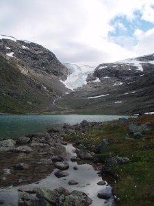 Dagen startet også i dag med en oppstigning. Men denne gangen var det i en svært frodig side, med et mylder av ulike plantearter. Klar og tydelig sti, men for langt mellom T-ene, slik at en gikk en stund og var litt usikker på om det egentlig var riktig sti. Da vi kom opp på toppen til Oksli hadde vi en fantastisk utsikt sørover mot Hurrungene. Mørkrisdalen som gikk sørover så utrolig flott ut. Vi fortsatte og fikk Harbardbreen (Norges 4. største isbre) på venstre side. Vi hadde en ny økt med oppstigning opp fra Leirvatnet. Denne kan nok være litt dårlig merket i tåke. Da vi kom opp hadde vi en utrolig flott utsikt utover mot Gravdalsvannet, og gikk på nordsiden av denne før den svært bratte nedstigningen (300 høydemeter) til Fivlemyrane (vann med dam). Det ligger et kraftverk nederst i sida, noe som ikke var særlig pent. Etter vi kom ned til demningen er det ca 2 km å gå på grusvei til vi kommer til Nørdstedalseter, DNTs minste betjente hytte, men veldig koselig inne. Vi ble hilst velkommen av Halvor, som er bestyrer på hytta sammen med sønnen Marius (som er kokken). Vi fikk servert deilig middag, og om kvelden ble det vist lysbilder fra området både vinter og sommer, sammen med de andre gjestene (4 eldre karer på guttetur og ett tysk ektepar). Betjeningen var hyggelige og var ute sammen med oss gjestene om kvelden. Det skal også være en flott og spektakulær kjøretur oppover fra Sognefjellsveien, men i relativt dårlig stand. Også her hadde de sykler, men her tok de 120 kr/dagen eller 70 kr for 4 timer. Turen fra Arentzbu til Nørdstedalseter var beregnet til 7 timer, vi brukte 6- 6,5 timer.