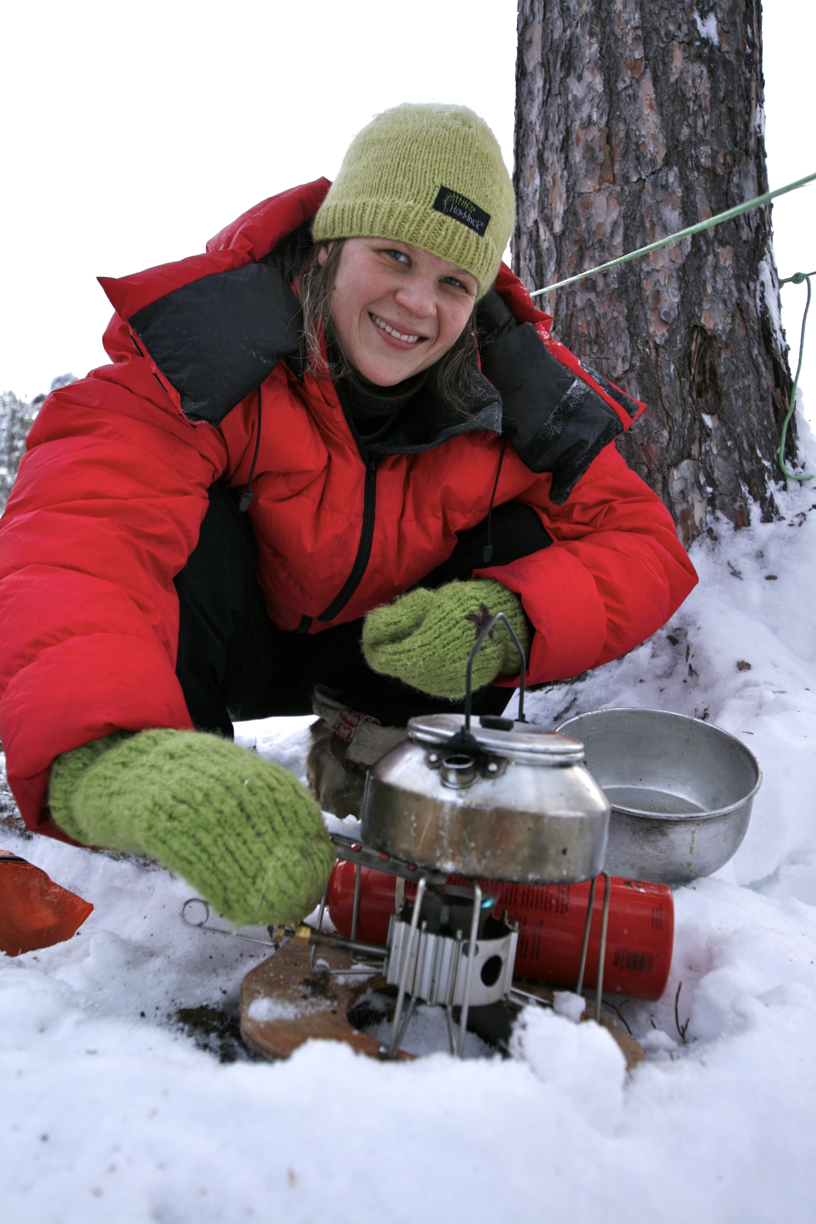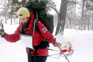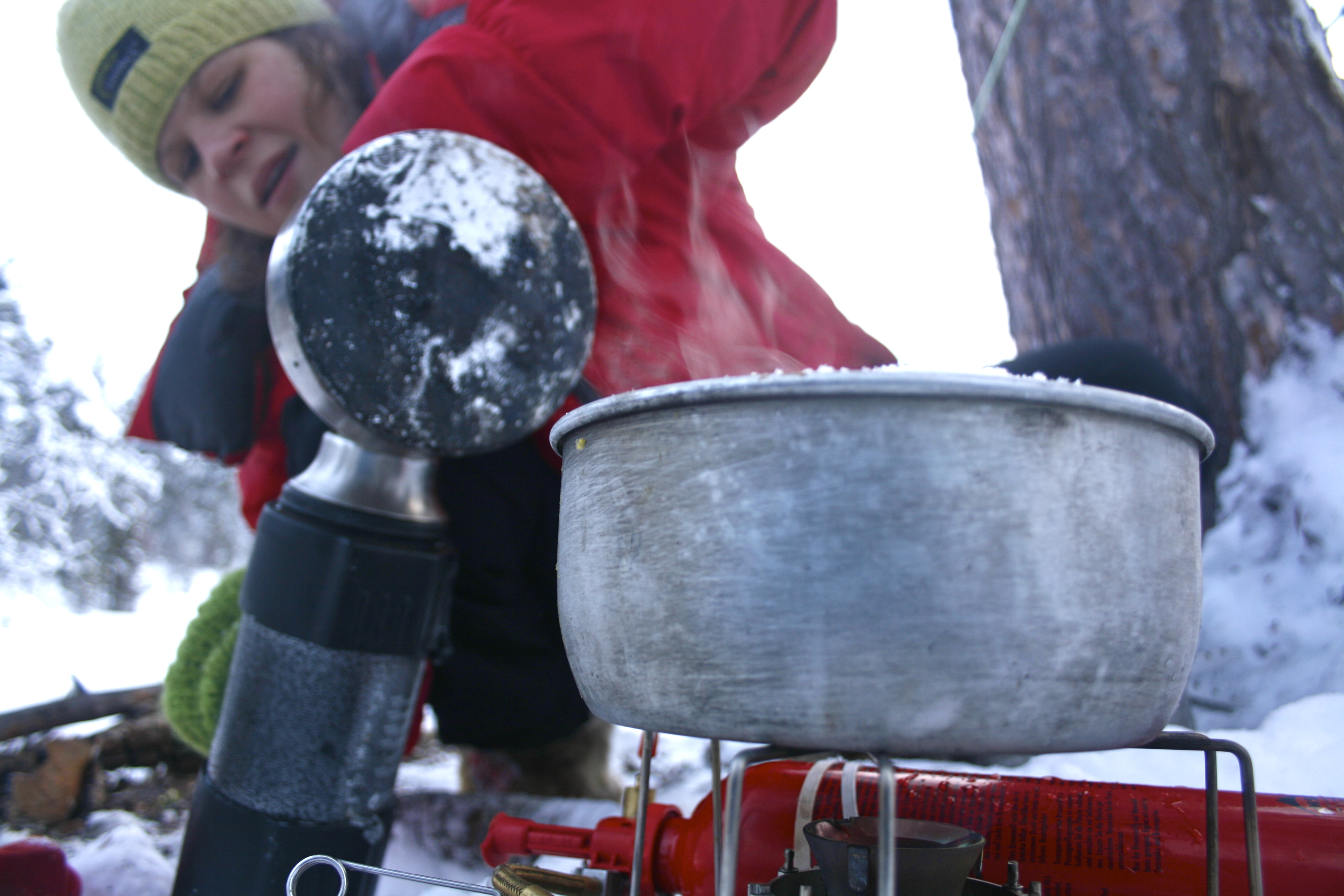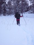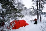 Det var ca 16 minus da vi våknet mandag morgen. Denne dagen var Marie turleder, og Mari var oppe og begynte å smelte vann og ordne til frokost. Det var en skikkelig flott dag, sola lurte bak et tynt skydekke. Vi fortsatte mot Grunnhåbua,og brukte to gode timer på de to km i løssnø til knærne til Grunnhåbua. Men fint var det inni skogen! Det var imidlertid herlig å se Grunnhåbua, en koselig lita tømmerkoie det også, med sengeplass til fire, og en nydelig solvegg å ha lunsj i. Planen var å gå videre mot Gubbtjønnbua og Langmyrbua, alle Statskog sine åpne koier, men vi fant ut at vi heller gikk i sporene våre tilbake mot Nordvika. Vi gikk rett øst mot Nordvika, og krysset Femunden/Nordvika og fulgte løype over Neset, rundet Sandodden og gikk inn til Synnervika. Klokka var blitt nærmere seks, og vi slo leir rett ved kaia i Synnervika – som virket ganske så øde og forlatt på denne tida av året. Middagen ble fortært inni teltet, og resten av kvelden gikk med til kosefyring, sjokolade, prat og oppsummering av all testingen vi hadde gjort.