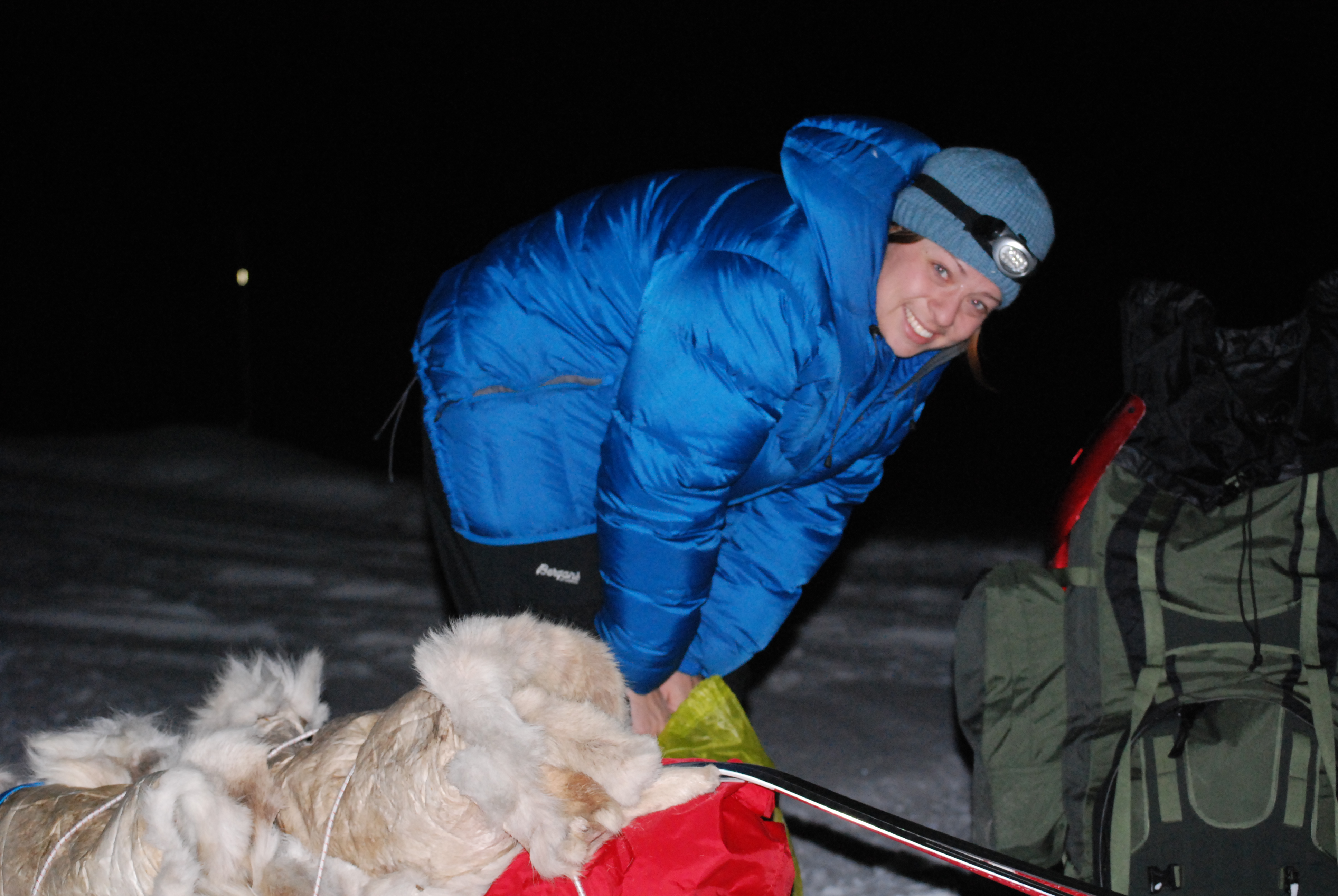 Vi lastet litt av ustyret på pulken og gikk en km innover fra Langen, langs hundekjøringsløypa, der vi slo opp teltet og krøp i posen.