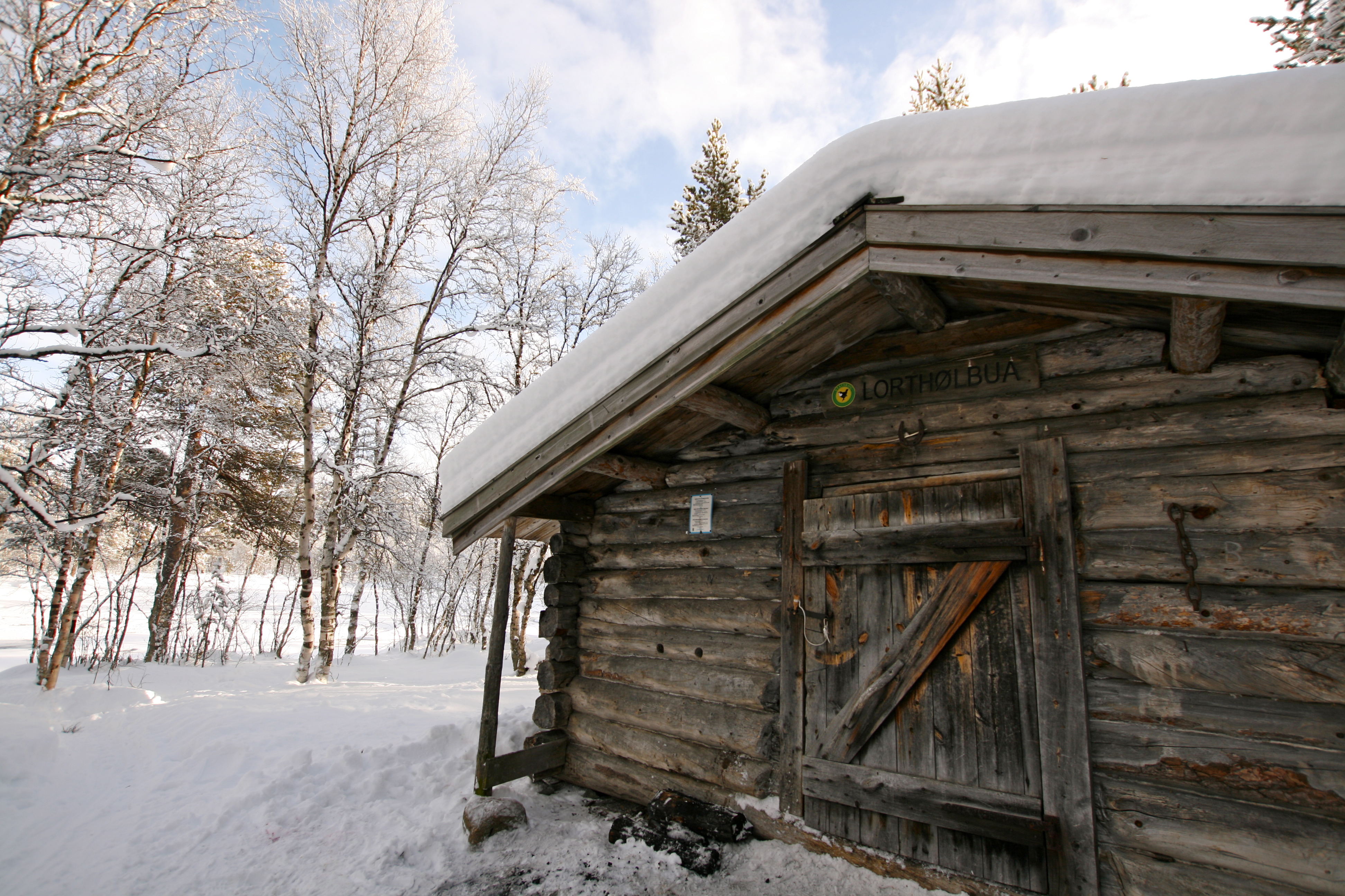 Vi fulgte hundekjøringsløype/skiløype østover mot Langtjørna. Det var nydelig vær og flott føre. Vi gikk gjennom flott og åpen furuskog, og så etterhvert Flenskampan og Femunden. Vi gikk innom Lorthølbua (Statskog), som lå ved Kalven, og var en koie som ble brukt under tømmerfløtinga. En sjarmerende plass, som frista til gjenbesøk.