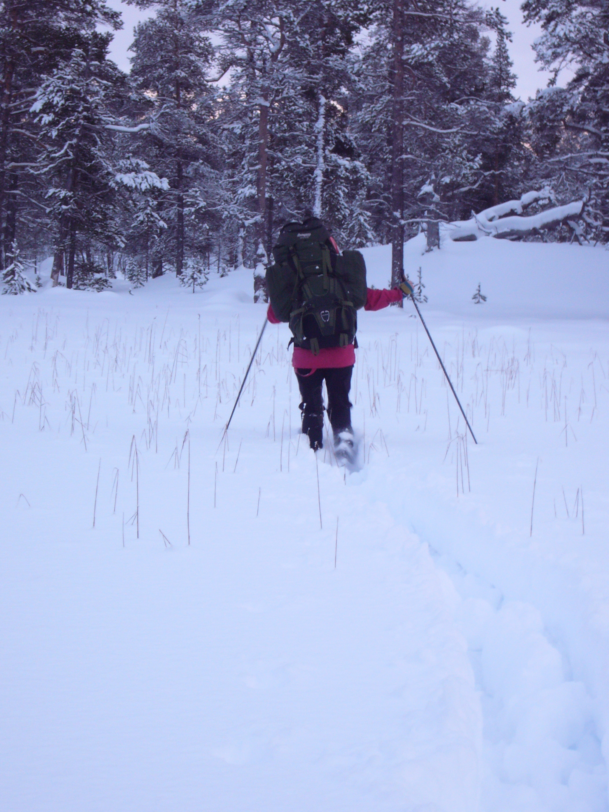 Vi hadde bestemt oss for å bli på samme stedet to netter på rad, og sov lenge på lørdagen. Det var endel småting som måtte testes, som hvor lenge holder batteriet på iPoden, hvor mye dopapir trenger vi, hvor mye bilder kan vi ta når det er kaldt, hvilke rutiner skal vi ha, og prøve disse ut, hva er turleders rolle og hva er den som ikke er turleders rolle, er matrasjonene passelige eller trengs mer eller mindre, pluss teste endel av utstyrets ulike funksjonaliteter, som pulk, sekk, bukser, bivuakksko, primuser o.l.. Vi gikk oss en tur litt ut på ettermiddagen nordover inn i Tjukkskogen. Kvelden kom i sekstida, med masse stjerner på himmelen og nydelig kveld ute under furua.
