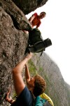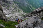 ble vi veldig i tvil om veien, da det tilsynelatende bare var to bratte renner opp. Men det viste seg at vi måtte gå noen meter ned og til venstre, og så runde en stein med bratt parti under oss. Etter dette gikk det lettere, opp i en ur med litt store steiner, før de siste par hundre høydemeterne gikk på sandstein og konglomerat med god friksjon. Her kan det nok bli litt glatt dersom det regner. Ganske vilt å se bare svabergene forsvinne ned i dalen!