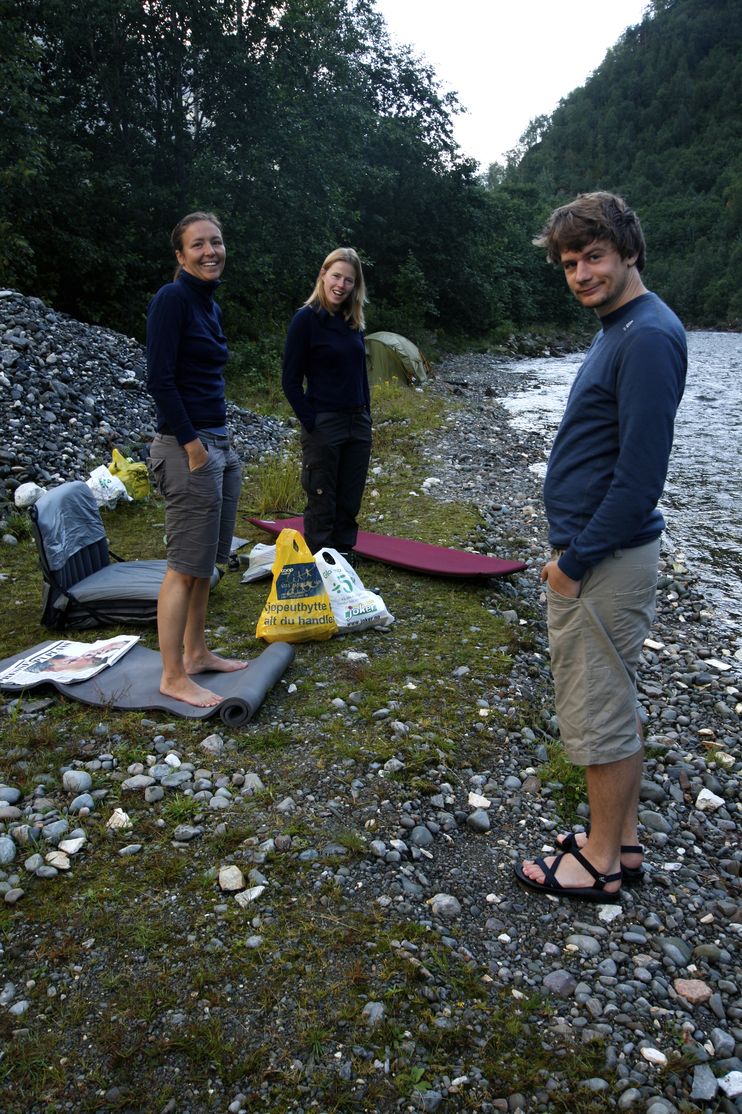 Vi kjørte langs med Hopselva (rv 615) for å finne leirplass. Vi var også innover mot Gjengedalen, men der var det skygge i sekstida. Etter halvannen times leting fant vi en bra plass 3-4 km vest for Hyen, på nedsida av veien, rett ved elva. En fin ”steinstrand” og plass til noen telt, selv om Jon og Fenny sitt telt viste seg å være plassert i en grop der vannet samla seg da det senere på kvelden kom et kraftig regnskyll…! Sol til syvtida, og god middag ble laga før regnet i åttetida gjorde en brå slutt på kvelden! Elva er regulert, så et par ganger i løpet av kvelden ble nivået både senket og økt, så vi nesten kunne hente vann rett ut fra teltdøra…