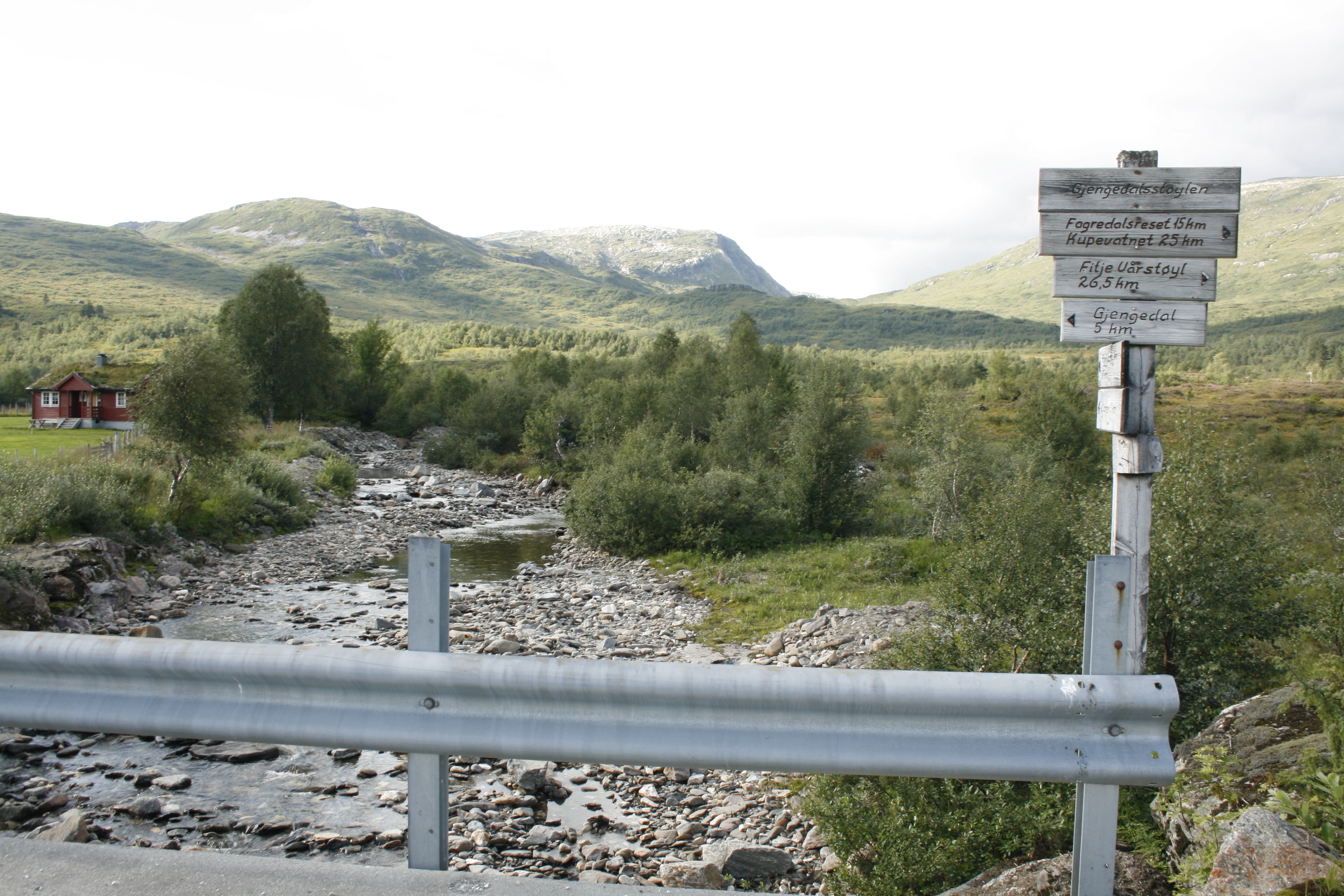 Rolig dag i dag. Herlig vær – sol og varmt og godt. Lang frokost. Jon og Fenny ble i leiren for å tørke soveposer og slakke. Jeg og Rita kjørte inn Gjengedalen til Gjengedalstølen (bomvei etter Dalheim, 40 kr). Ganske annet terreng – mye mer åpent og ”flatere”. Vi hadde problemer med å finne stien. Skiltet stod på østsida av broa, men der fant vi ingen sti. Vi fant ut da vi kom tilbake at man må gå ca 50-100 meter på østsida av elva før man krysser den ved det øverste huset og finner stien på vestsida av elva. Det står i Oppturboka at stien ble merket under ”Klypeløpet” som gikk i 2003 og 2004, men