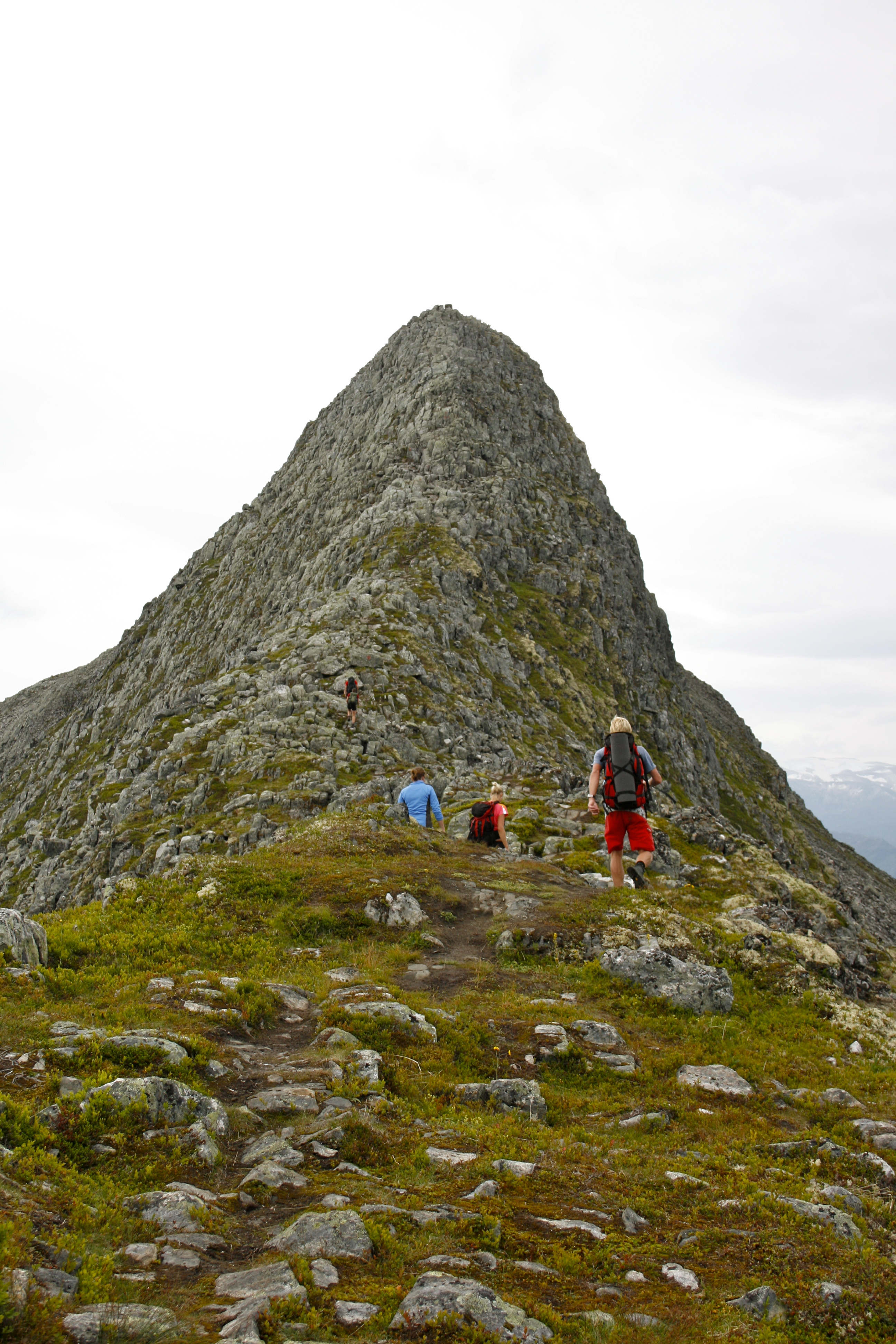 Over tregrensa var det en flott utsikt ut mot Sandane og ut fjorden. Her gikk vi over til fjell, men fortsatt gode stier. Man kommer først til utkikkstoppen (1160 moh), og mange nøyer seg med denne, da det er en karakteristisk topp med god utsikt. Vi fortsatte litt lenger innover sør-øst for utkikkstoppen, og kom til selve toppunktet på 1201 moh. Ca 5 timer t/r inkludert lunsj og pauser.