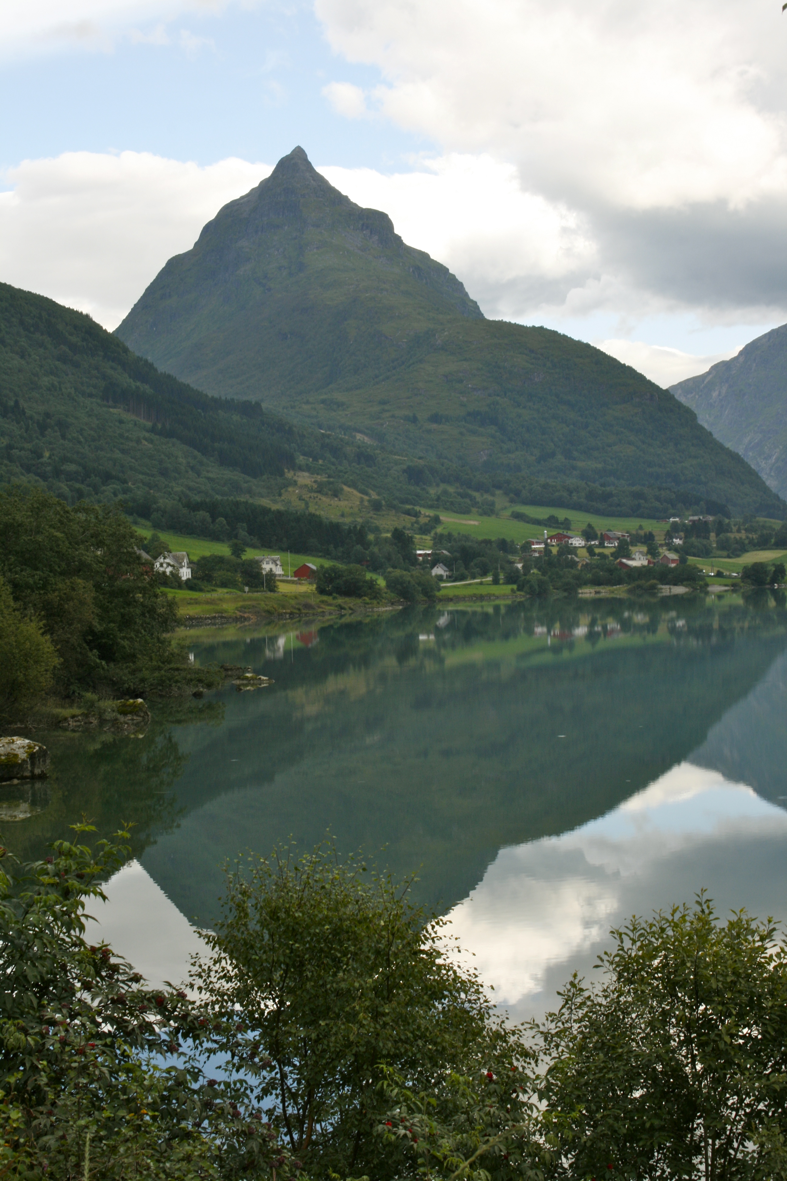 Rita og jeg møtte Jon og Fenny i Hyen (33 km fra Sandane), kjørte 2-3 km videre mot Nausdal til Hope. Inn grusvei (gjennomgående) skiltet mot Gjegnabu. Parkerte bilen rett etter ei lita bro over elva (ca 65 moh). Gikk oppover mot Skordalen – gjennom to porter, så til venstre på kjerreveien gjennom en port til. Deretter sti innover i dalen, på vestsiden av Skordalselva. Umerket sti, til tider litt vanskelig å finne. Vi fortsatte innover til ”fjellet stenger”, jfr Opptur-boka… Der lurte vi på hvor veien gikk videre! Vi fant noen røde ringer og merker her og der, og klatret oppover en bratt side med store steiner. Vi var glade det ikke regnet. Et par steder måtte vi løfte sekkene og klyve rundt en stein og opp i noen renner. Det var lagt ut tau rundt én stein. På ca 600 moh