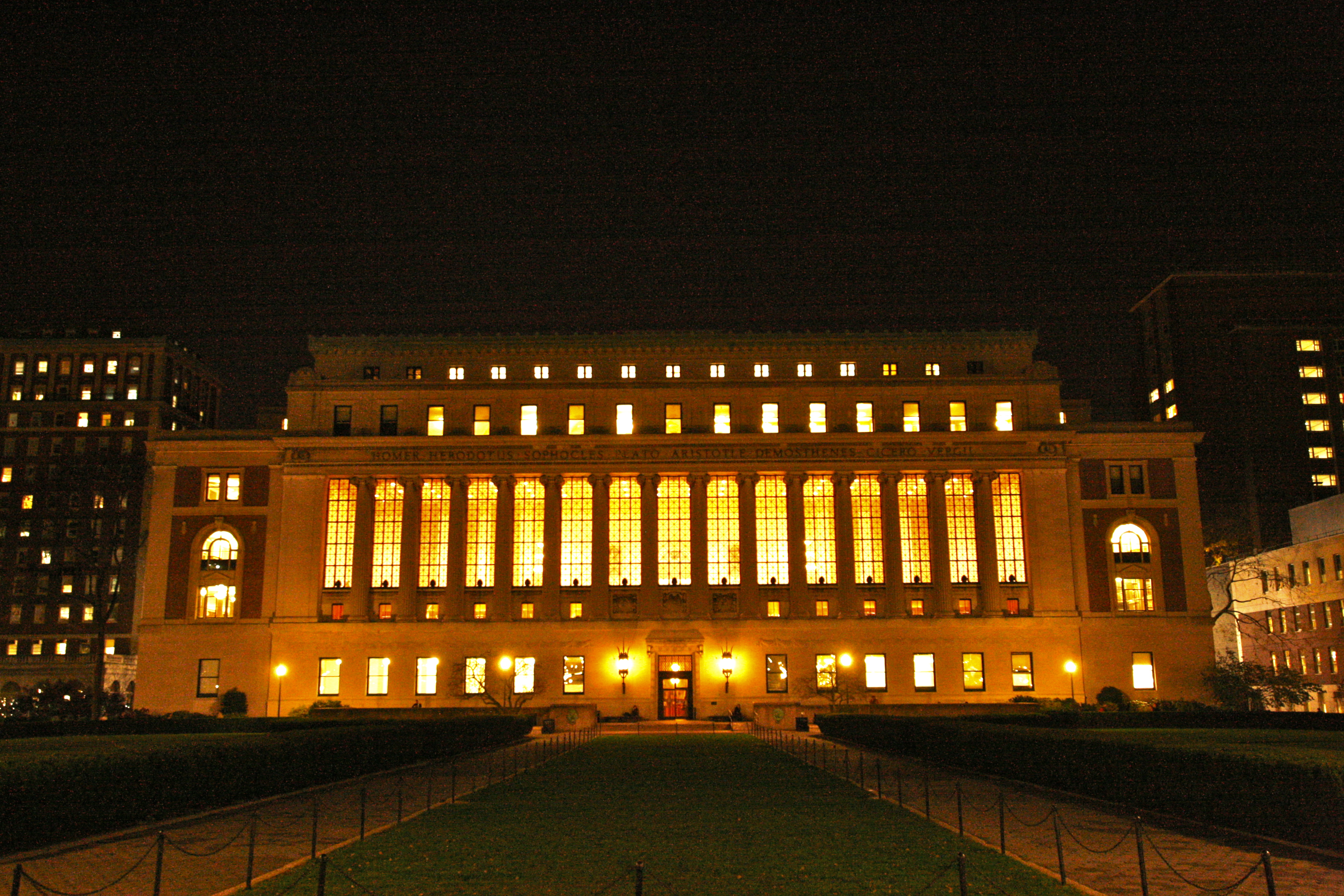 Det tok ca 1 time og 40 min inn. Vi satte fra oss koffertene og gikk rett ut på en skikkelig amerikansk restaurant og bestilte hver vår hamburger! På prisene i USA legges alltid tax til (ca 8 %), deretter må du selv legge på tips, som skal være mellom 15-20 %! puh, er jo rene matteeksamen hver gang man har spist jo… Etterpå dro vi oppom Columbia University (ligger mellom Broadway og Amesterdam Av., og begynner på 114th str.) der Ragnhild er visiting scholar. Noen utrolig flotte bygg, og særlig i mørket, med lys i de digre vinduene i biblioteket.
