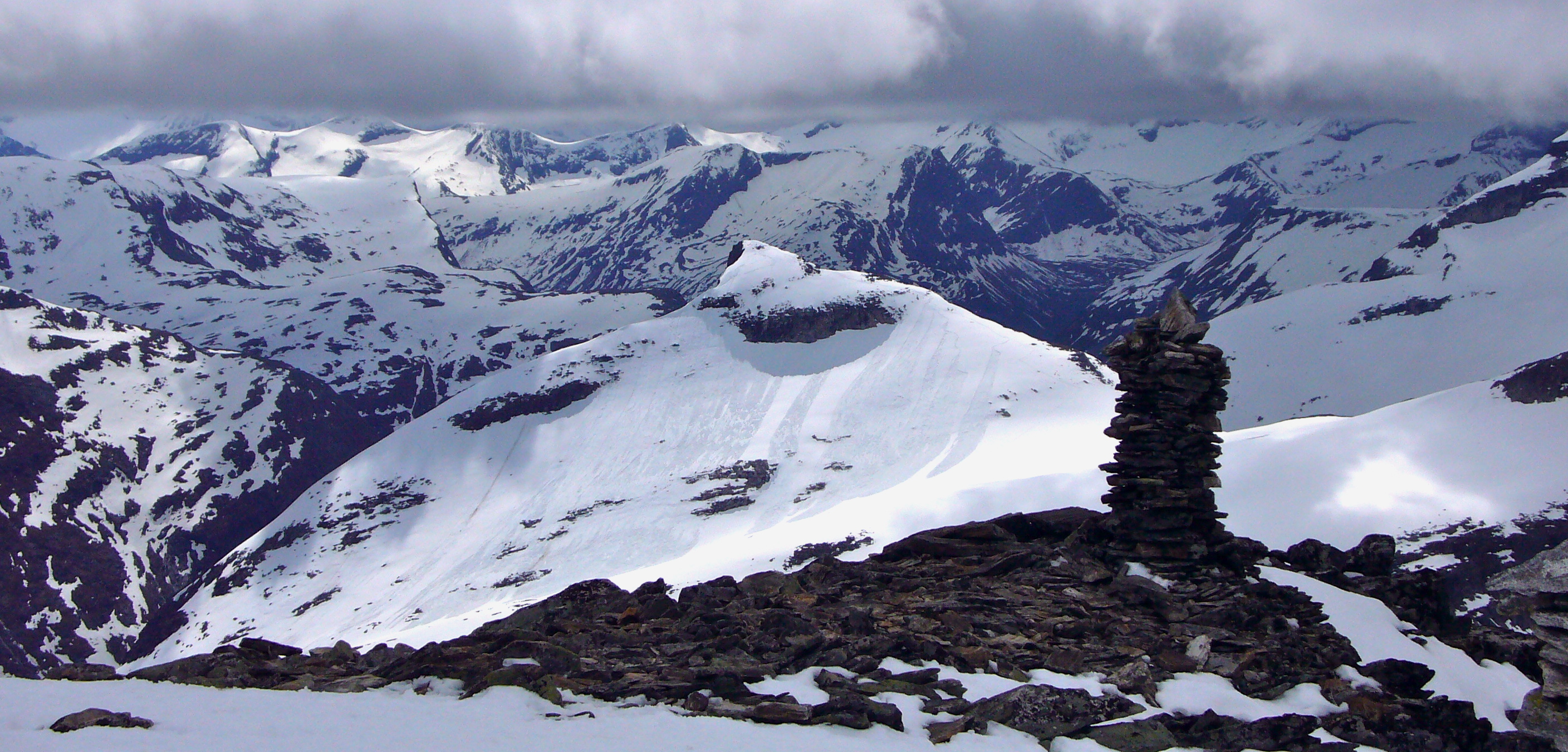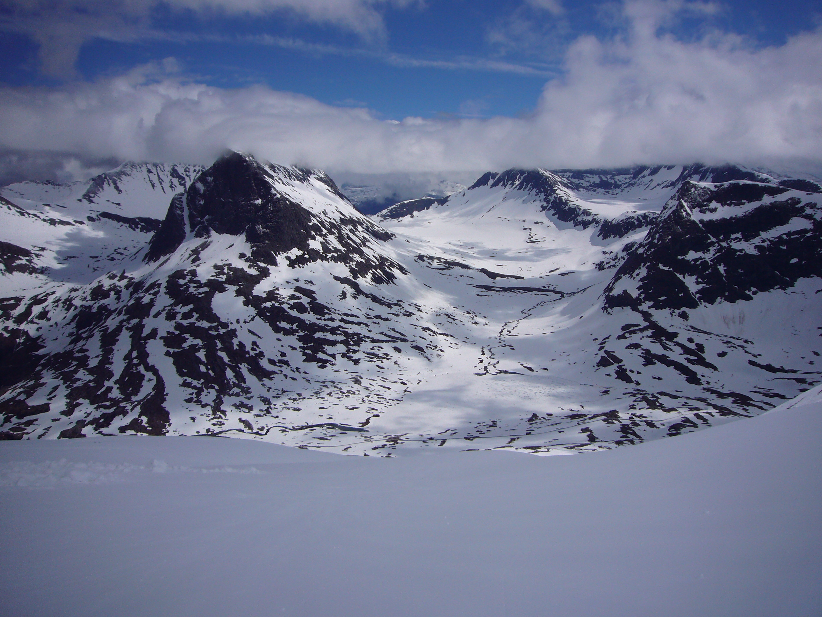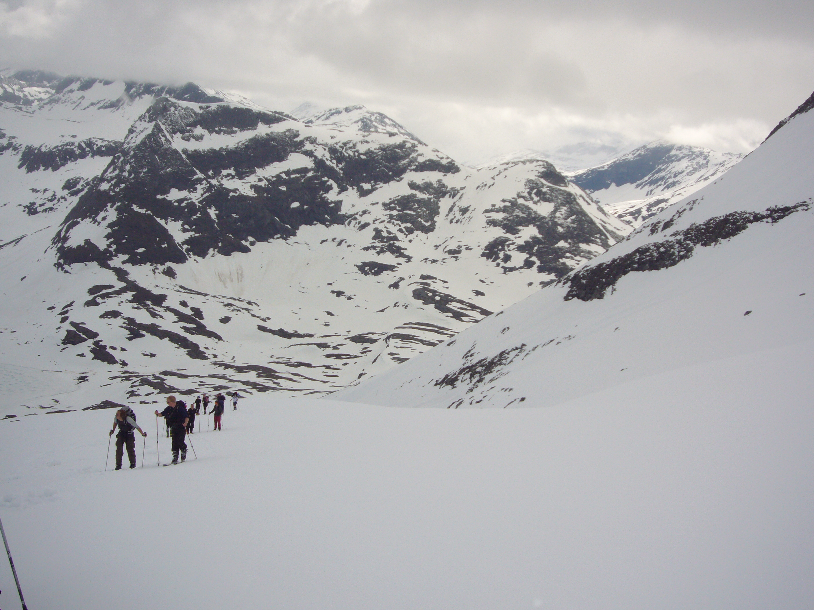 Vi kjørte til nesten samme sted som dagen før. Vi stoppet på veien ved ca 780 moh, rett nordvest for Alnesvatnet. Deretter gikk vi ganske rett vestover oppover (vi fulgte forslag/traseen fra toppturboka «toppturer i Romsdalen»). Da vi kom til breen, tok vi lunsj, og sola kom fram. Det var litt småskyet i dag også, men absolutt bedre enn dagen før. Ved breen tok vi litt sørvestover opp passet sør for det utstikkende fjellet rett øst for toppen. Dette var det bratteste partiet, med 37 grader helling på det bratteste. Snøen hadde satt seg godt, og svært liten skredfare1, så det vurderte vi som trygt. Vi fortsette oppover, og tok nord-vestover igjen da vi var over det bratteste, til vi stod på toppen. Vi så over til Finnan der en annen tur gikk denne dagen, samt over til Breitinden og Stigbottshornet østover. Vi fulgte samme trasé nedover som der vi hadde gått opp. Denne dagen var snøen veldig god nesten helt ned til bilen. Ca samme temperatur i dag som i går. Varmt å gå, man trengte ikke noe særlig med klær, men overskyet. I dag var jeg turleder sammen med Fredrik, Mina og Bjørnulf. Vi dro opp ca halv elleve, og var tilbake ca kl 1600 – en gruppe på 20 personer, med lunsjpause og en god pause på toppen. Også i dag, da vi satt godt og tørt inne i bilene igjen, kom regnet virkelig, og sendte en lang og våt skur – og vi var enda mer fornøyde!
