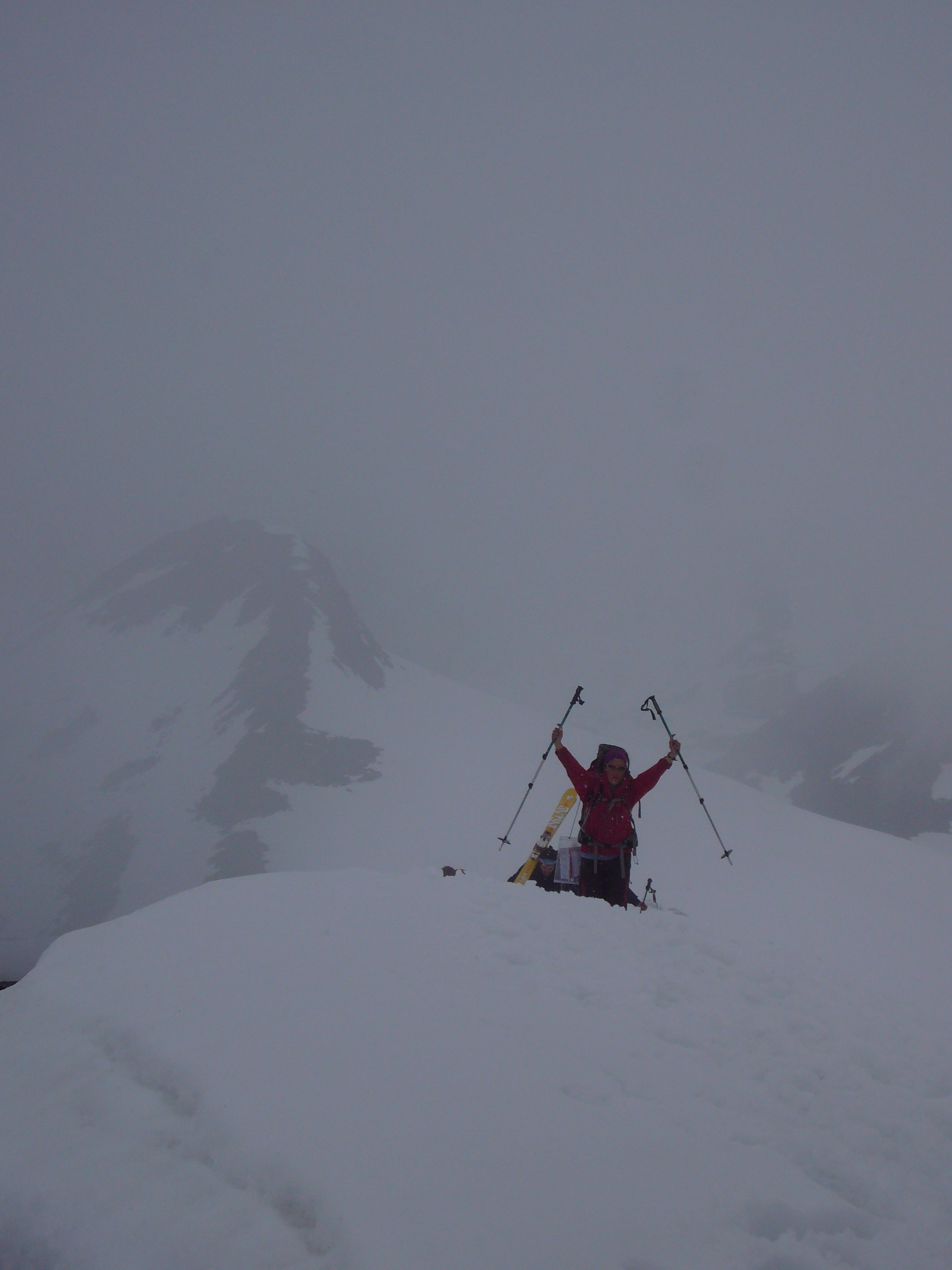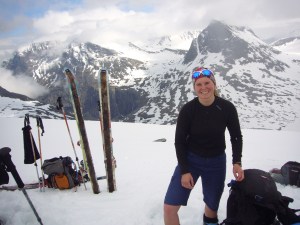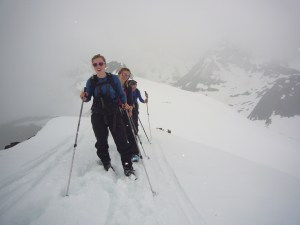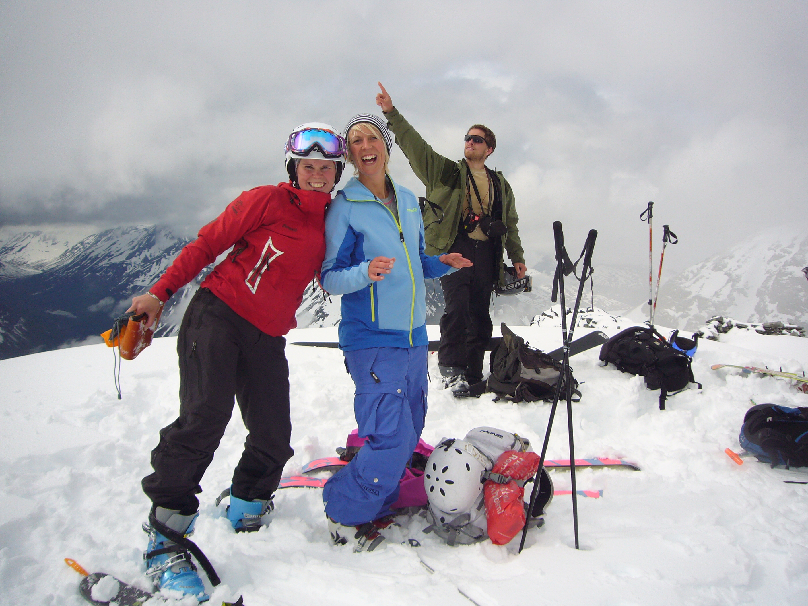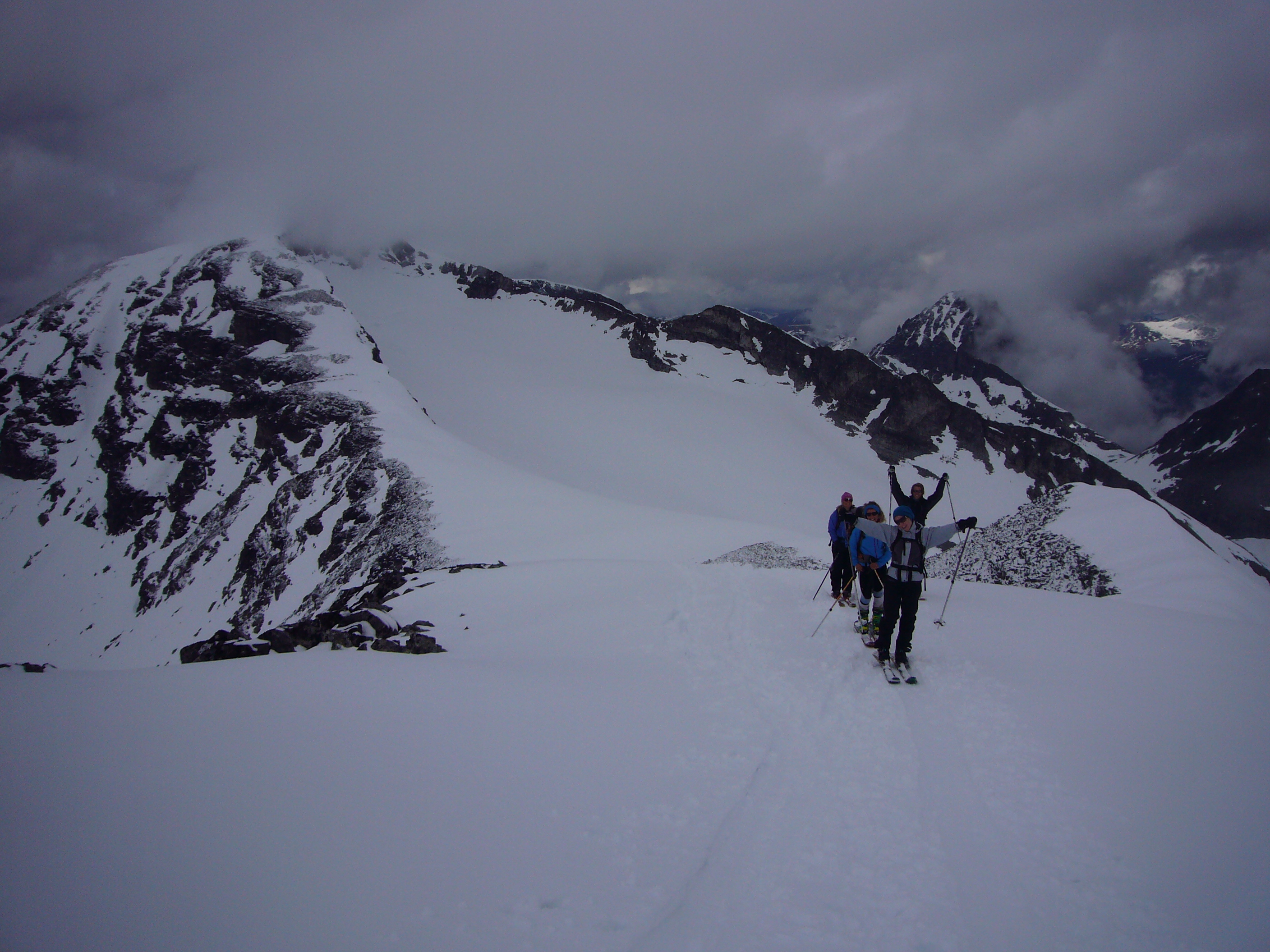 Vi kjørte til nesten samme sted som dagen før. Vi stoppet på veien ved ca 780 moh, rett nordvest for Alnesvatnet. Deretter gikk vi ganske rett vestover oppover (vi fulgte forslag/traseen fra toppturboka «toppturer i Romsdalen»). Da vi kom til breen, tok vi lunsj, og sola kom fram. Det var litt småskyet i dag også, men absolutt bedre enn dagen før. Ved breen tok vi litt sørvestover opp passet sør for det utstikkende fjellet rett øst for toppen. Dette var det bratteste partiet, med 37 grader helling på det bratteste. Snøen hadde satt seg godt, og svært liten skredfare1, så det vurderte vi som trygt. Vi fortsette oppover, og tok nord-vestover igjen da vi var over det bratteste, til vi stod på toppen. Vi så over til Finnan der en annen tur gikk denne dagen, samt over til Breitinden og Stigbottshornet østover. Vi fulgte samme trasé nedover som der vi hadde gått opp. Denne dagen var snøen veldig god nesten helt ned til bilen. Ca samme temperatur i dag som i går. Varmt å gå, man trengte ikke noe særlig med klær, men overskyet. I dag var jeg turleder sammen med Fredrik, Mina og Bjørnulf. Vi dro opp ca halv elleve, og var tilbake ca kl 1600 – en gruppe på 20 personer, med lunsjpause og en god pause på toppen. Også i dag, da vi satt godt og tørt inne i bilene igjen, kom regnet virkelig, og sendte en lang og våt skur – og vi var enda mer fornøyde!
