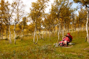 Stiene var gjennomgående godt merket med ganske tett i tett med røde prikker, evt stolper med rødt på og siste delen inn mot Damtjønna var det røde bånd. Kanskje litt vel tett til tider, men med barn var merkingen en motivasjon i seg selv, da man kunne bytte på å gå foran ved hver nye stolpe, men kunne telle røde merker over myra, eller si at vi tar neste pause om fem stolper. Turen var ganske våt, og med et ganske myrete underlag stort sett hele veien fra Hevertjønna – Damtjønna – Heverfallsetra ble det til tider rimelig tungt terreng å gå i, og ganske gjørmete. Kilometerne kunne da gjerne virke tyngre. Høstfargene var absolutt begynt å komme fram, og vi fant masse blåbær og tyttebær! Temperaturen var bra, mellom 10-15 grader, så relativt god temperatur, men litt surere i regnet søndagen.