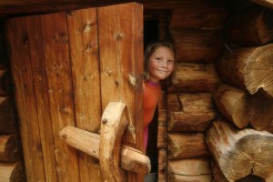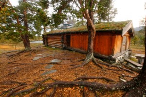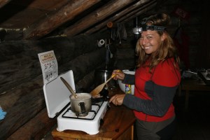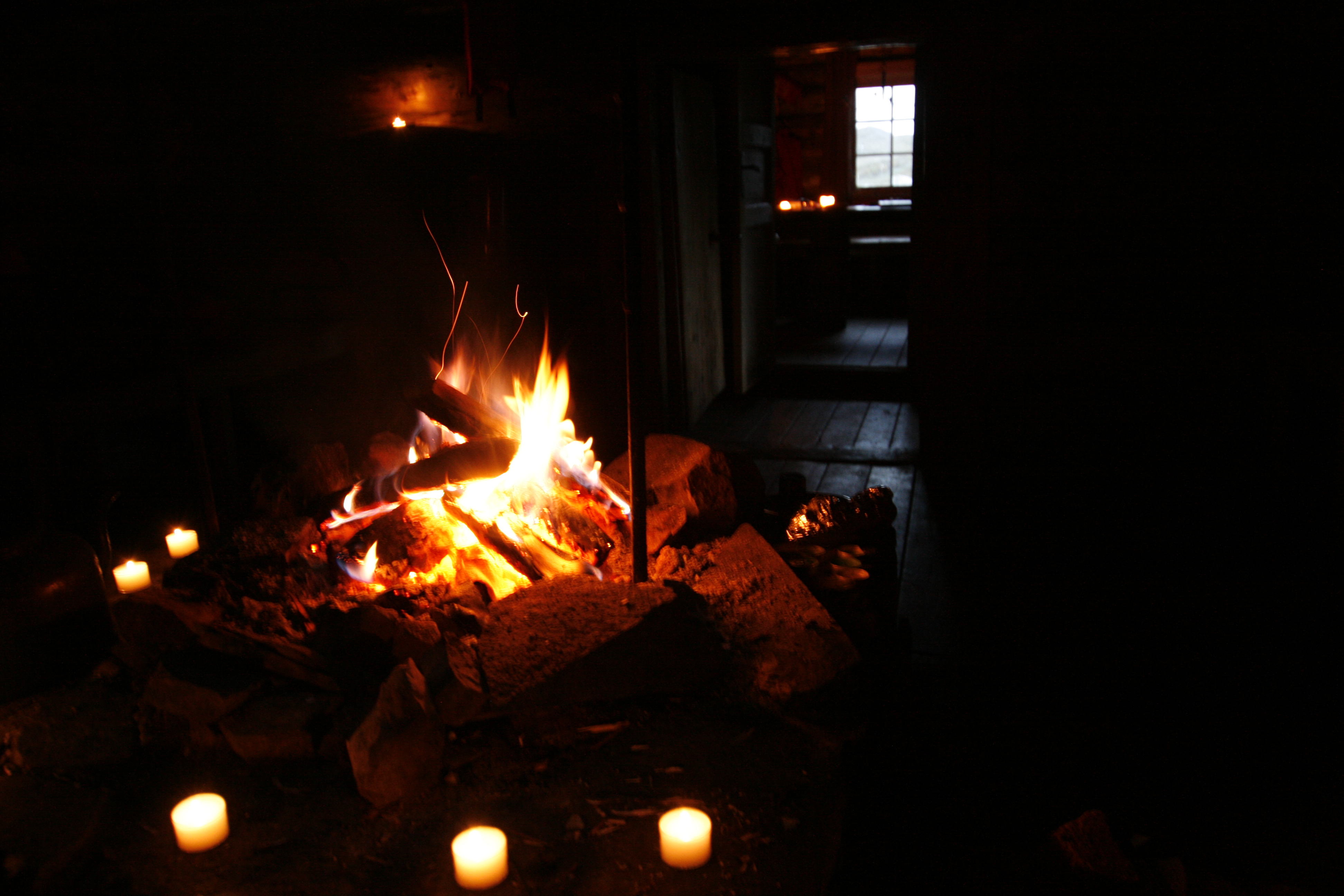 Anne stod for middagen, mens vi andre henta vann og gjorde oss kjent på nydelige Hevertjønna. Både denne og de to andre hyttene i Barnas Naturverden (Damtjønna og Ramssjøen) er laftete sælehus etter forbilde fra middelalderen. Halvparten består av en årestue med ljore (røykåpning) i taket og sengebrisker langsmed veggene med plass til 6 voksne og to mindre barn. Lys slipper inn gjennom ljoren i taket og en vindusåpning uten glass (dvs. et stort hull i veggen). Fyre gjør man på en åpen grue (steinpall) midt i rommet. Den andre halvdelen av huset består av en forgang og et rom med vedovn, gasskoker og vindu. Her er det en brisk med plass til to voksne og et mindre barn, i tillegg er det et langbord med benker. Vi hadde med egne liggeunderlag og soveposer, for madrasser og dyner/tepper finnes ikke her. Hyttene er ulåste og åpne hele året – men om vinteren vil jeg tro det kan trekke rimelig bra i delen med grua i alle fall…