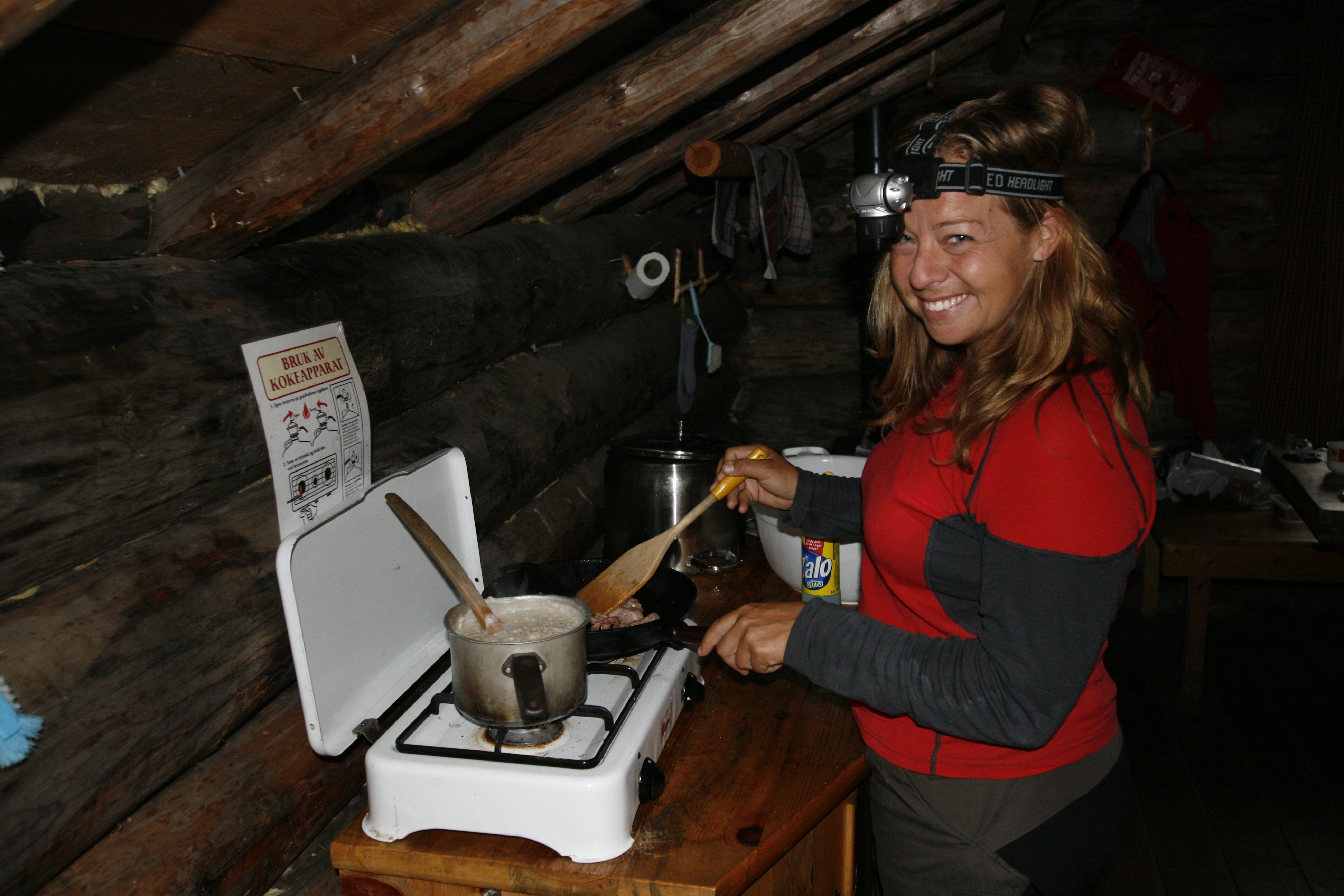 Det gikk 5 minutter fra vi var framme ved Damtjønna til regnet begynte å styrte ned! Vi hadde ikke hatt en dråpe de fem timene vi hadde gått, så dette var sykt bra beregning! Thale, Frøy og jeg løp ned til vannet og tok et bad. Vi kunne like gjerne bare stått ute, vi hadde blitt like våte! Herlig med et bad – oppfriskende temperatur… Middag inne, ligretto og marshmellows på bålet før vi tok natta.