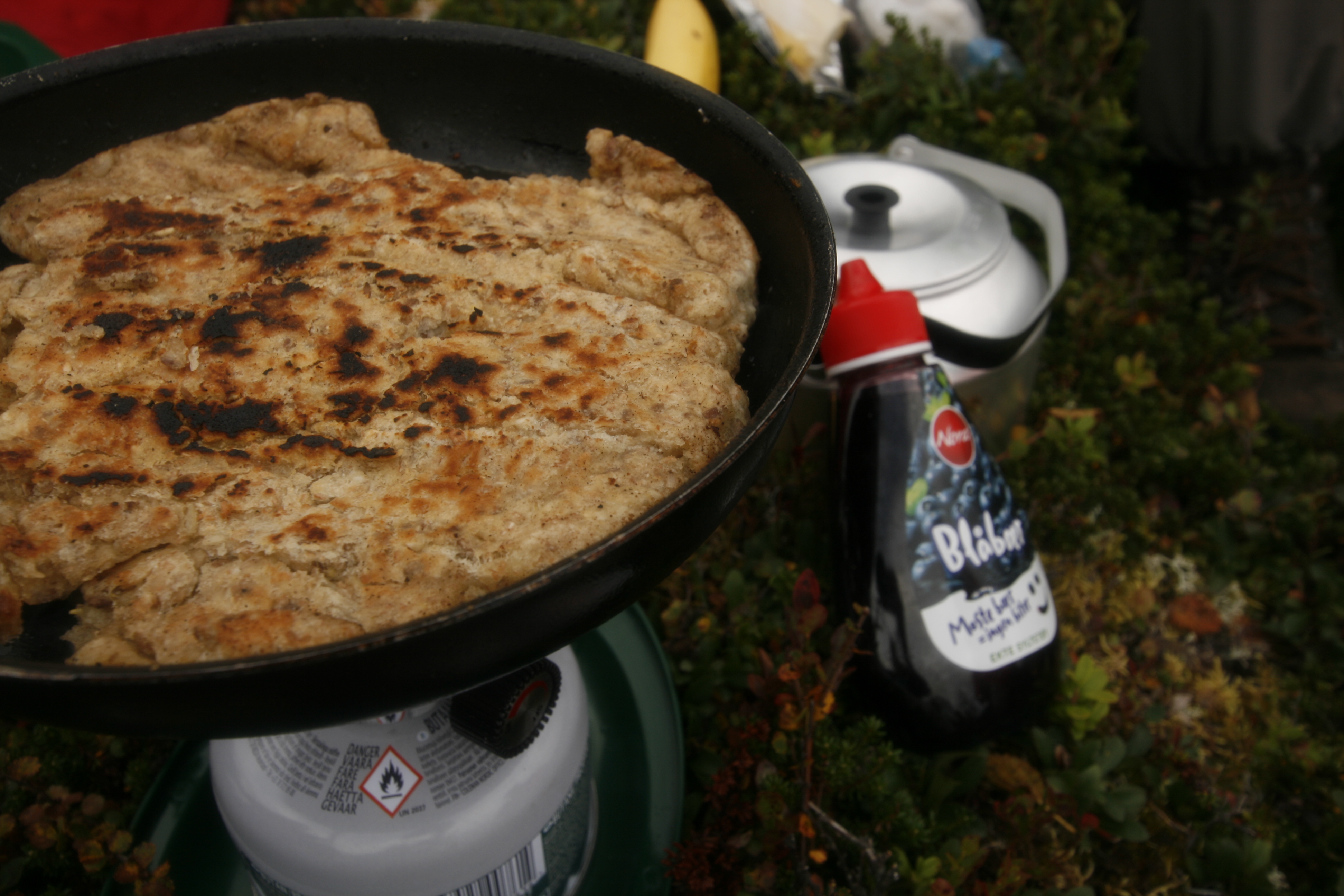 Vi tok fram primusen og jeg, Sunniva og Frøy satte igang med å lage pannebrød, eller MarieFrøyogSunnivas primusbrød som vi kalte det, mens Anne og Thale pakka ferdig. Frøy gjorde også en god innsats med å holde kuene borte fra lunsjbordet…