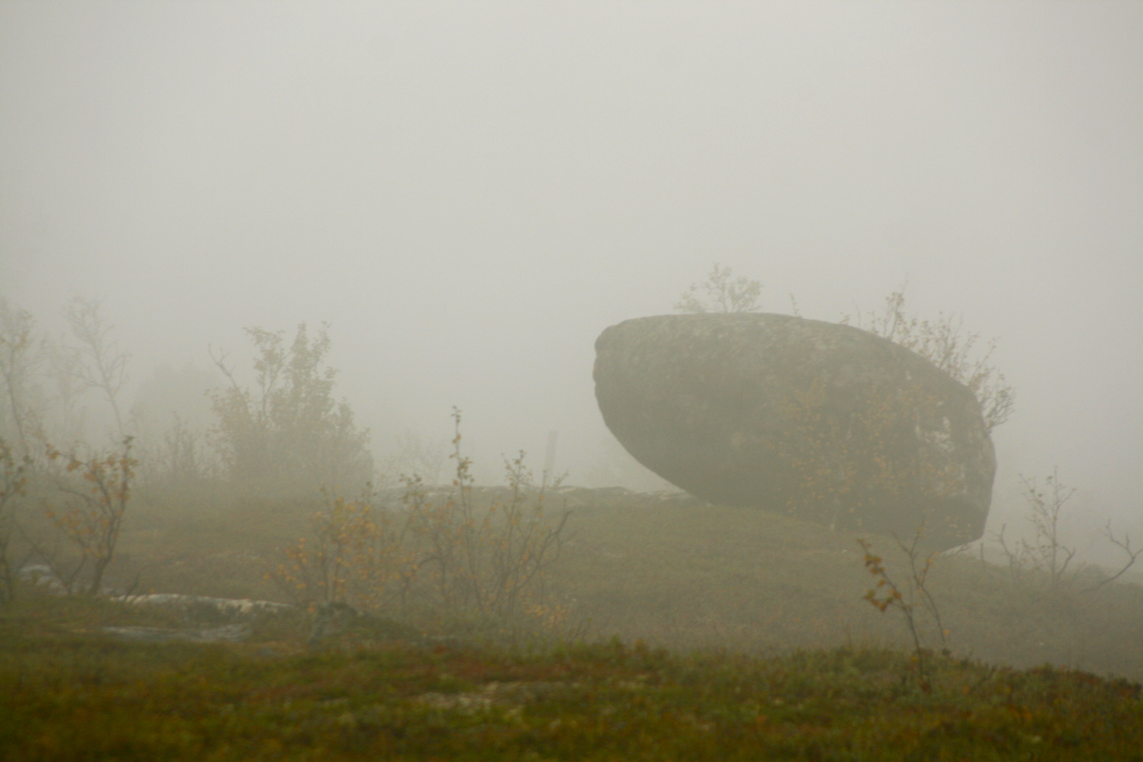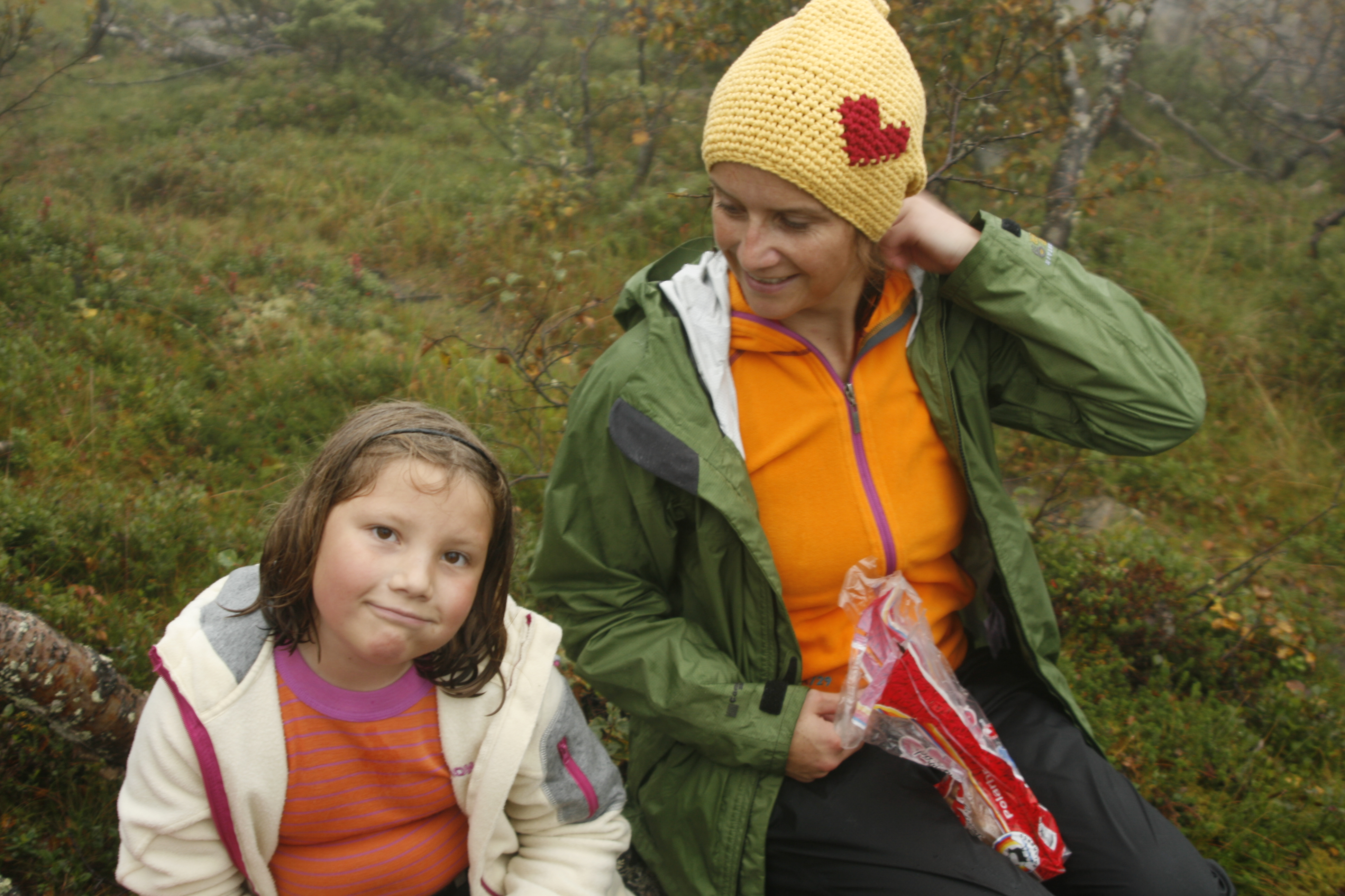 Våknet til plaskregn og tåke… Deilig frokost med havregrøt, bacon, egg og kaffe/kakao i dag også, men vi så for oss at det kunne nok bli en lang tur hjemover! Men – etter bare litt ekstra motivasjonsinput gikk Frøy og Sunniva kjempebra hele veien, og det ble en skikkelig fin økt i dag. Vi starta klokka ni og gikk stort sett i tåke eller regn hele dagen, men noen få ganger underveis letta tåka litt og vi fikk sett hvor flott det var rundt oss! Også i dag så vi reinsdyr og endel ryper som en gang fløy opp bare et par meter unna oss. Og lemmen. Det er et nydelig område å gå i, litt fjellverden i miniatyr, men også litt kupert og til tider noen små utfordringer for barneføtter. Det ble ikke lange lunsjen i dag, og i dag hadde vi smurt matpakke på forhånd. Men på slutten gikk det utrolig lett, og plutselig så vi Heverfallsetra! Da var det stormende jubel og et par meget slitne men stolte jenter som hadde gått 1,3 mil på sin første hytte-til-hyttetur og med egen sekk!