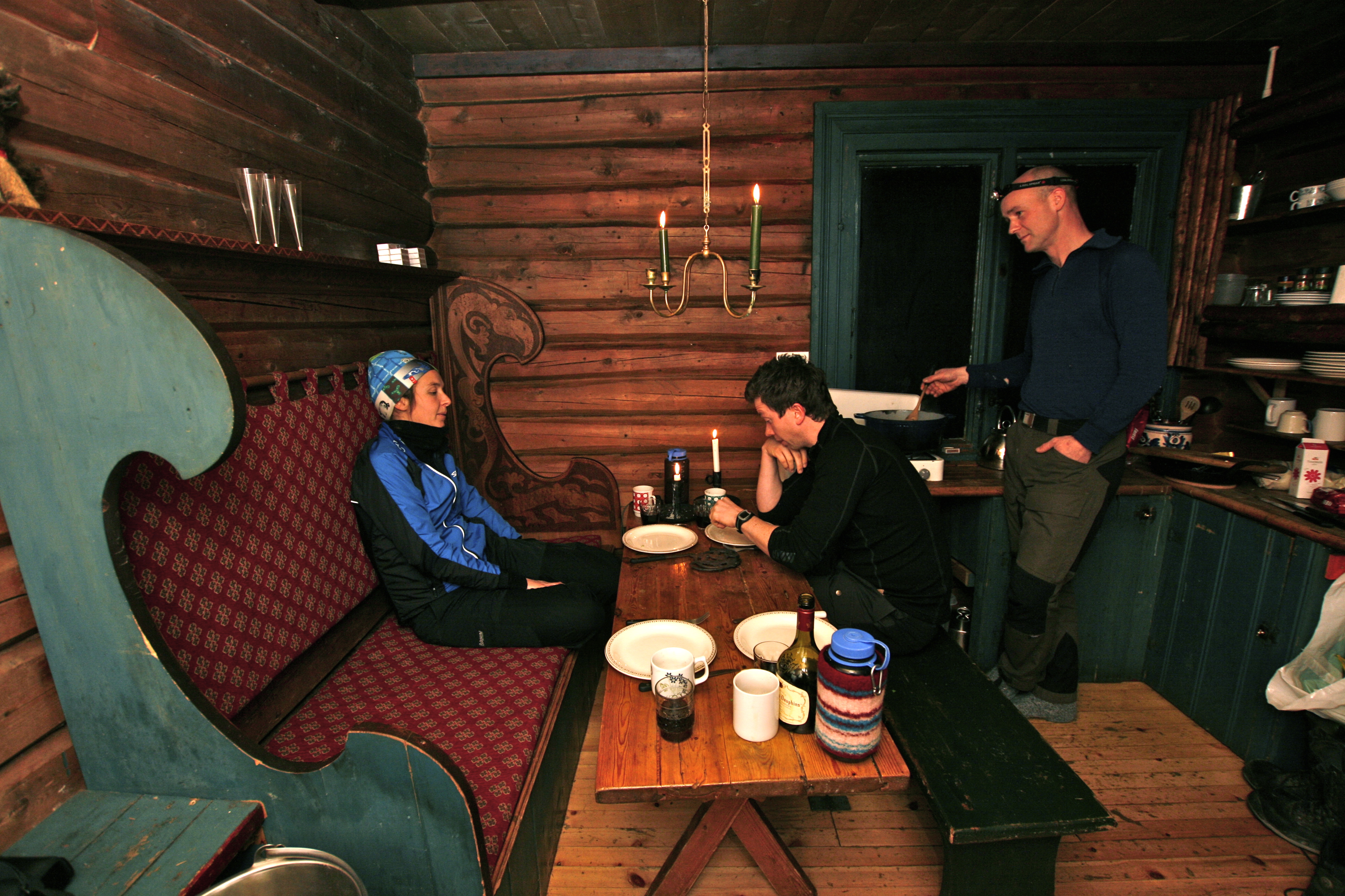 Vi startet litt utpå formiddagen og kjørte fra Oslo oppover via Nittedal og Grua til Jevnaker, og derfra inn til Tverrsjøstallen (bomvei 50 kr) hvor vi parkerte. Vi fulgte grusveien videre rett sørover i 3-4 km. Deretter tok vi blåmerket sti på østsiden langs Store Sinnerdammen 1,5 km til vi var fremme ved hytta Sinnerdammen (ubetjent, 4 senger, DNT Oslo og omegn). Den lå på vestsiden av elva som renner mot Spålen, med tydelige spor av tidligere tømmerflåtevirksomhet. Vi kom fram til hytta i skumringen, fyrte opp i ovnen på et kjempekoselig kjøkken, og tilbragte resten av kvelden på kjøkkenet. Nydelig, stjerneklar nattehimmel.