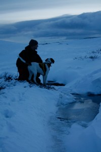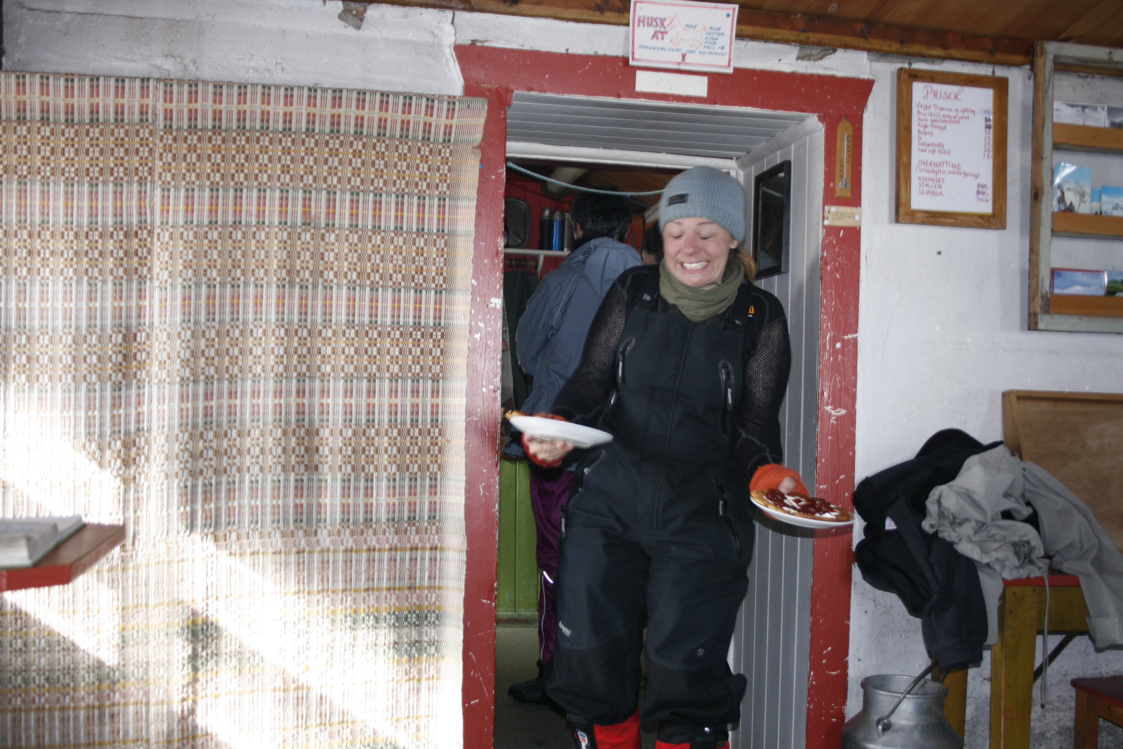 Også denne dagen ble toppturplanen til Veslesmeden gjort om til en bortovertur på grunn av lavt skydekke og mye vind fra nord-nordvvest. Vi la kursen østover gjennom Illmanndalen til Bjørnhollia. Vi startet i dag med vinden i ryggen og tankene gikk til at det ikke er sikkert det blir like behagelig på tilbaketuren. Det var skare her også, men over småvannene gikk det lett. Etter Illmanntjønnen, ca halvveis, begynte det å gå nedover. Jo lenger ned vi kom jo lunere ble det og jo mindre snø ble det. Siste km ble gått på beina, men for en nydelig dal! Sola kom så vidt fram og bekken hadde åpnet seg og bruste mintgrønn og lystig nedover. Selve tunet på Bjørnhollia var omtrent tomt for snø, men det betydde ingenting for gjestfriheten. Hundene fikk hvile innendørs i hundeburene og vi fikk kakao, kaffe og en vanvittig god gulrotkake i tillegg til medbragt lunsj. Det var langt fra fullt på Bjørnhollia; to familier og en venninnegjeng, men kort tid før vi skulle dra kommer et par med skiene på sekken inn på tunet, og det var Martin fra folkehøgskolen og kjæresten! Utrolig hyggelig å treffe kjentsfolk i fjellet.