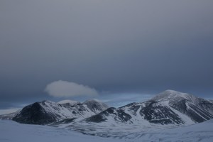 Det var meldt en del økning i vindstyrke fra kl. 2000, og vindretningen var fremdeles den samme. Så vi hadde satt avgang fra Bjørnhollia til senest kl 1600. Kvart over fire var vi igang, og sola var kommet enda sterke til syne. I dalen var det lunt og påskestemningen ble mer og mer fremtredende. Vinden lot vente på seg, den hadde derimot avtatt og til tider kom den faktisk i ryggen. Det ga oss en fantastisk flott skitur oppover Illmannsdalen. De truende skyene i vest forsterket det hele der sola skinte fra blå himmel over oss, og etterhvert gikk ned over Smiubelg- og Smedmassivene. Vi kom oss ned (ca kvart på åtte) og inn i teltet og vel så det før vinden kom og røsket skikkelig i teltet. Middagen ble av den grunn også i dag fortært innendørs.