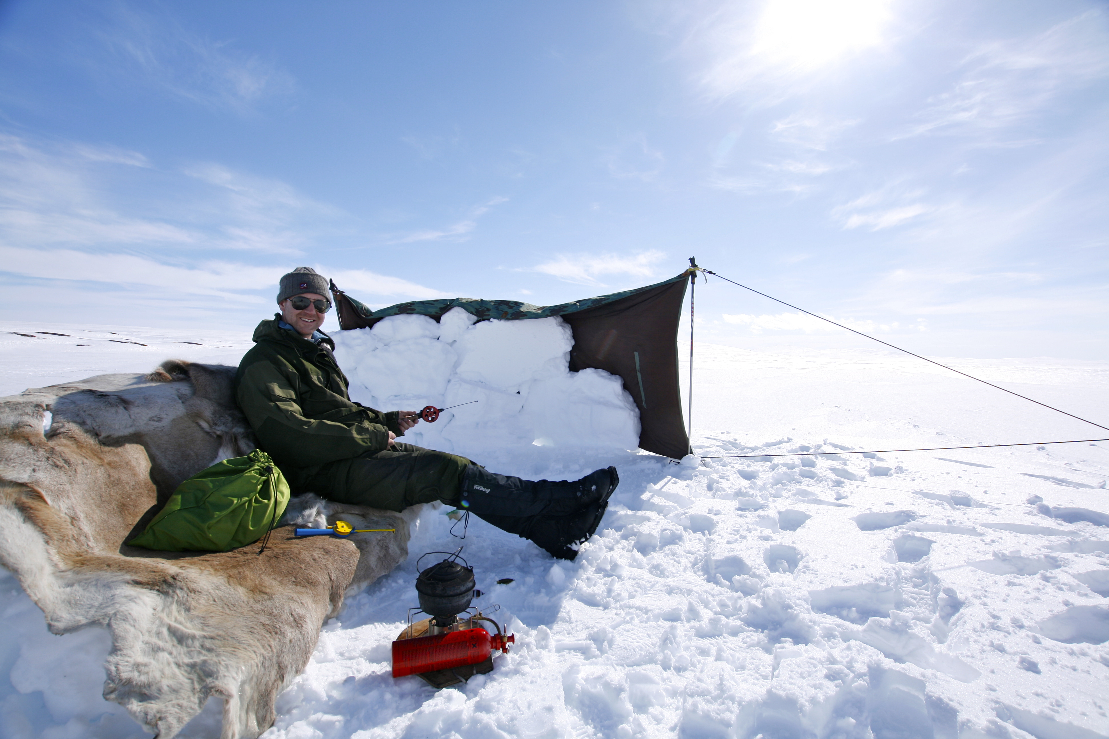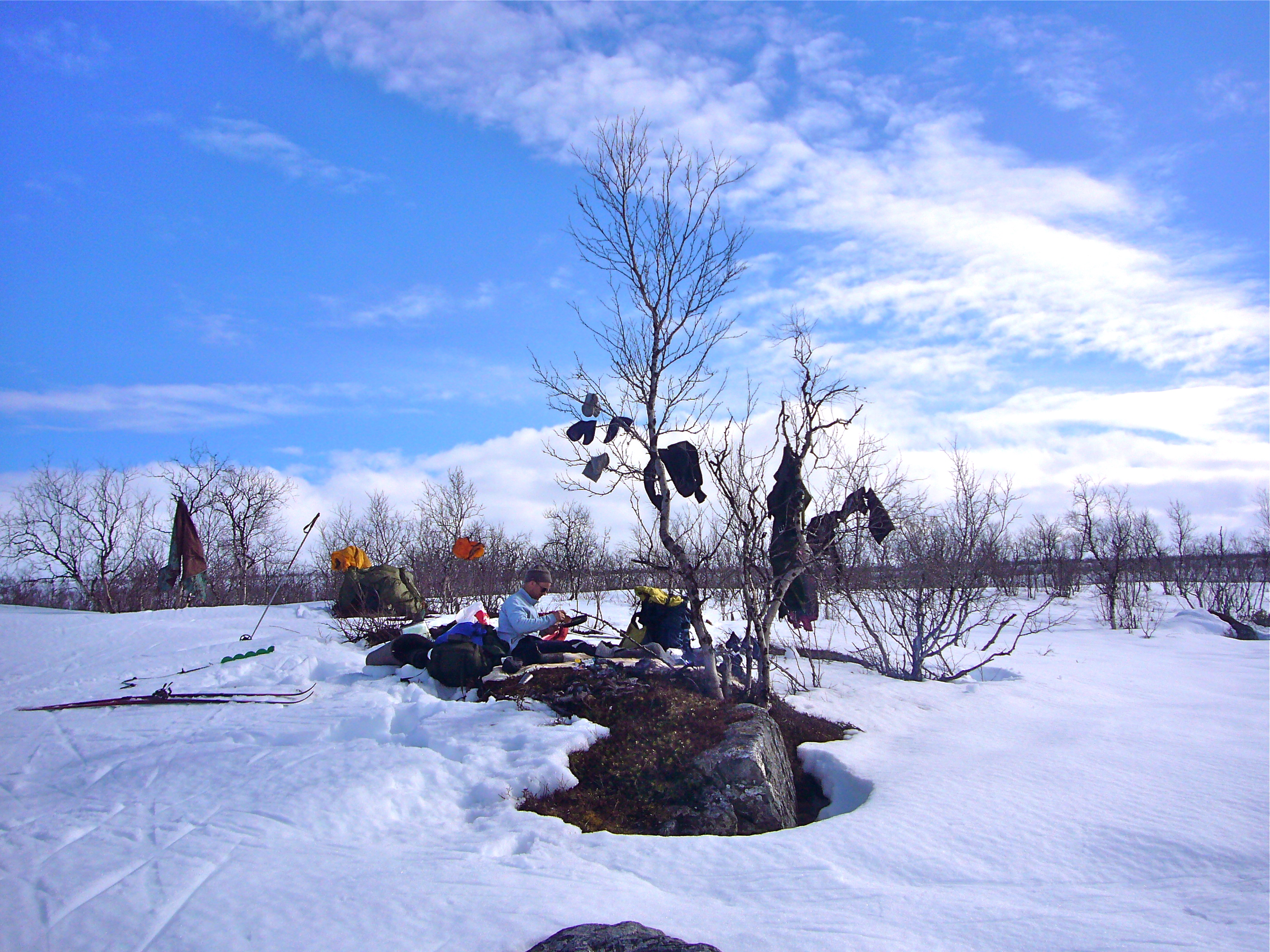 Da vi kom til Carajávri var det tid for lunsj. ”Seilet” vårt ble satt opp som en levegg, vi laget en god lunsjsofa, kokte opp kaffe og stekte røya fra Geshjávri. Etter en lang lunsj og etter å ha prøvd fisket uten videre hell satte vi kursen litt mer nordøst. Vinden hadde faktisk dreid litt mer mot sørvest så da vi var kommet opp de ca100 høydemeterne fra vannet satte vi seil igjen. Vinden hadde økt på, så farten økte og vi måtte til tider ta rev i seilene for ikke å miste kontrollen! Scooterløypa gikk en del mer nordover enn vi ville anta tatt kartet i betraktning, men vi valgte å følge denne og ble glade da den endelig endret retning mer mot sørøst ved Badjeluoppal. Vi pakket sammen seilet og gikk ytterligere 3,5 km før vi slo leir. Det var en idyllisk leirplass og vinden avtok utover kvelden og blodpudding, med pannekaker til dessert smakte fortreffelig!