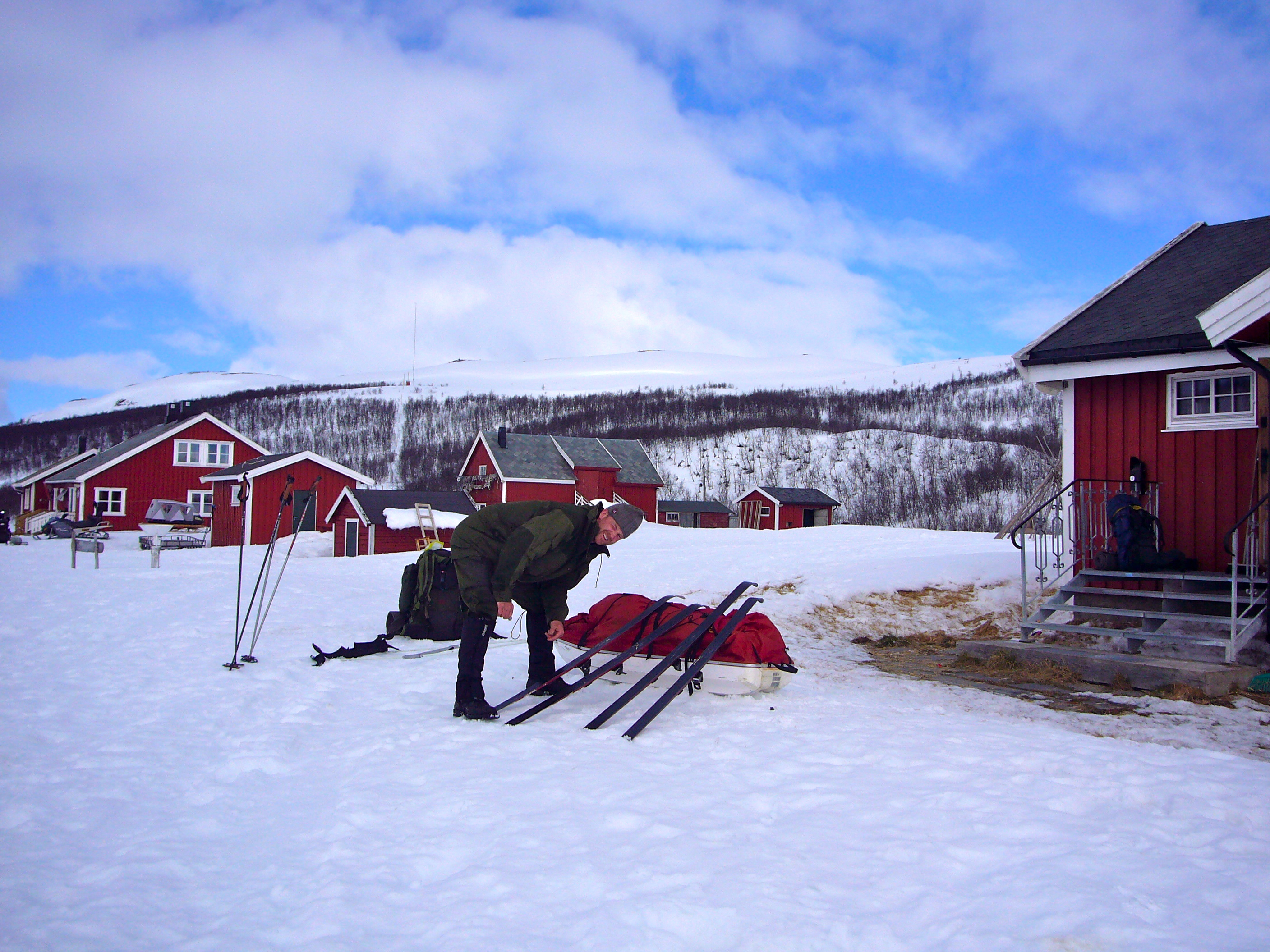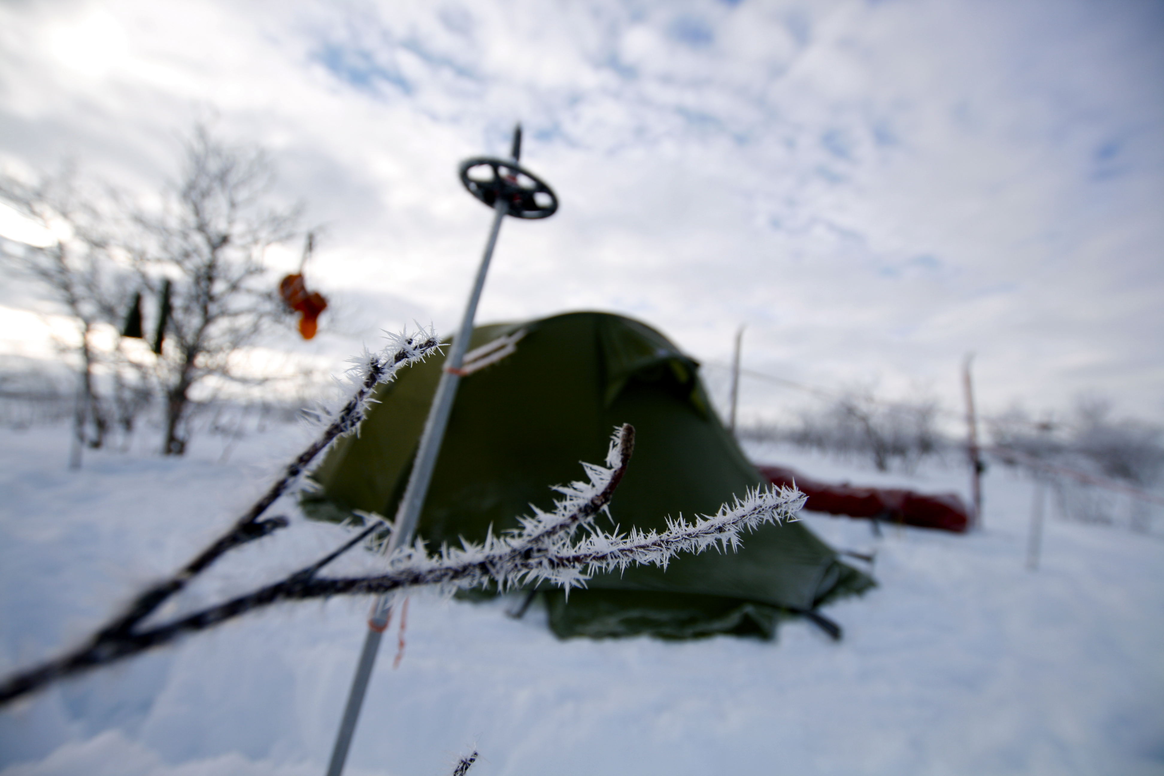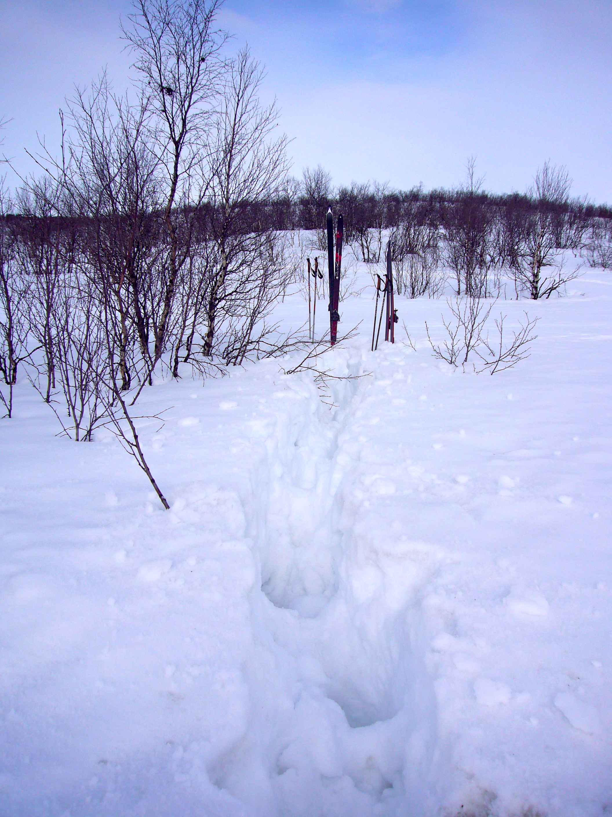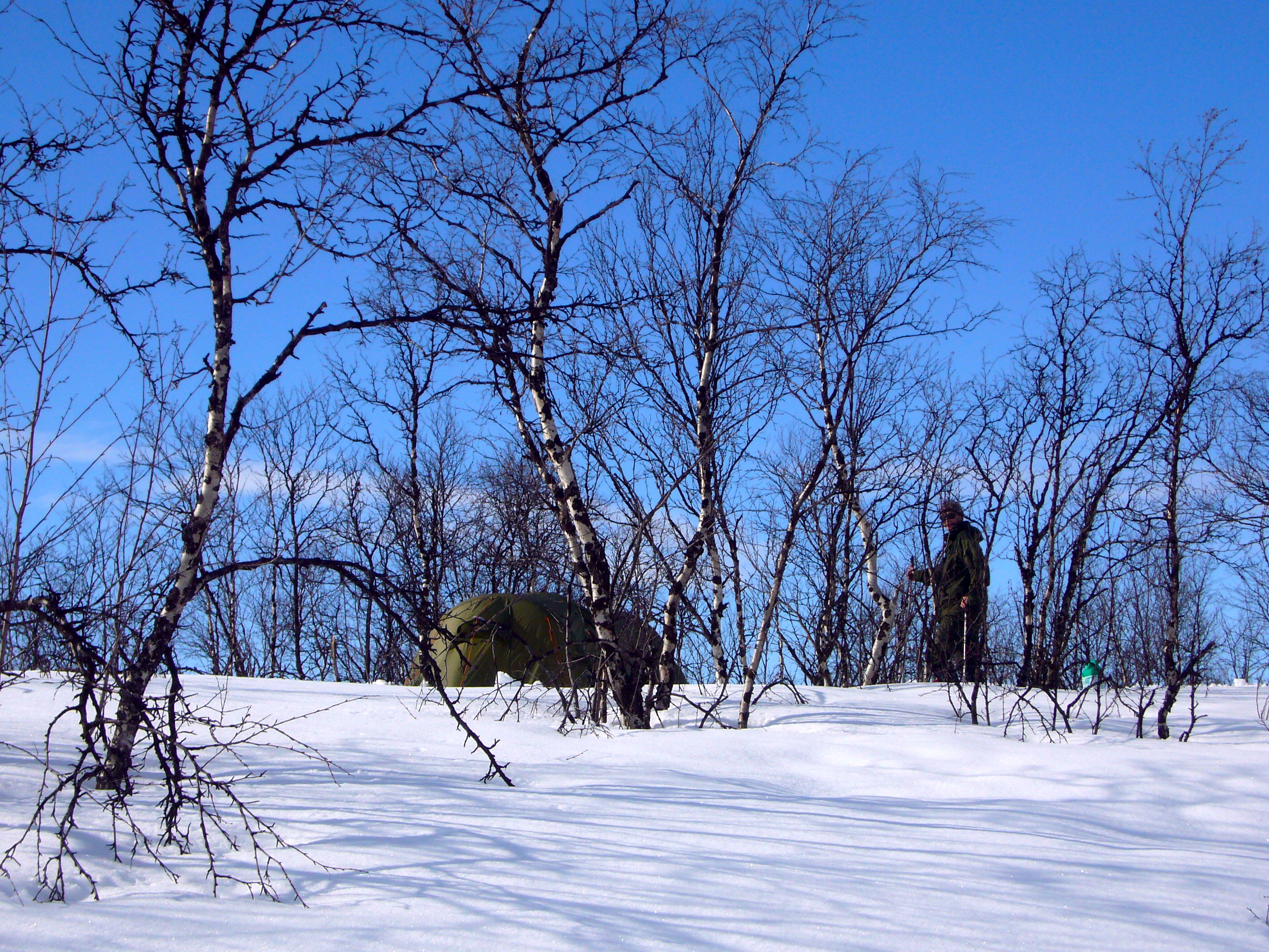 Vi stoppet utenfor Thon hotell i Alta, og fikk ei hyggelig resepsjonist til å foreslå teltplass for oss. Vi tok av veien ved barnehagen, mot flyplassen, gikk et par hundre meter og la oss opp på haugen mellom fjellbjørk. Resepsjonisten sa det hadde regnet to dager i Kautokeino og vi fikk raskt erfare at snøen var råtten tvers igjennom da vi beveget oss utenfor scootersporet.