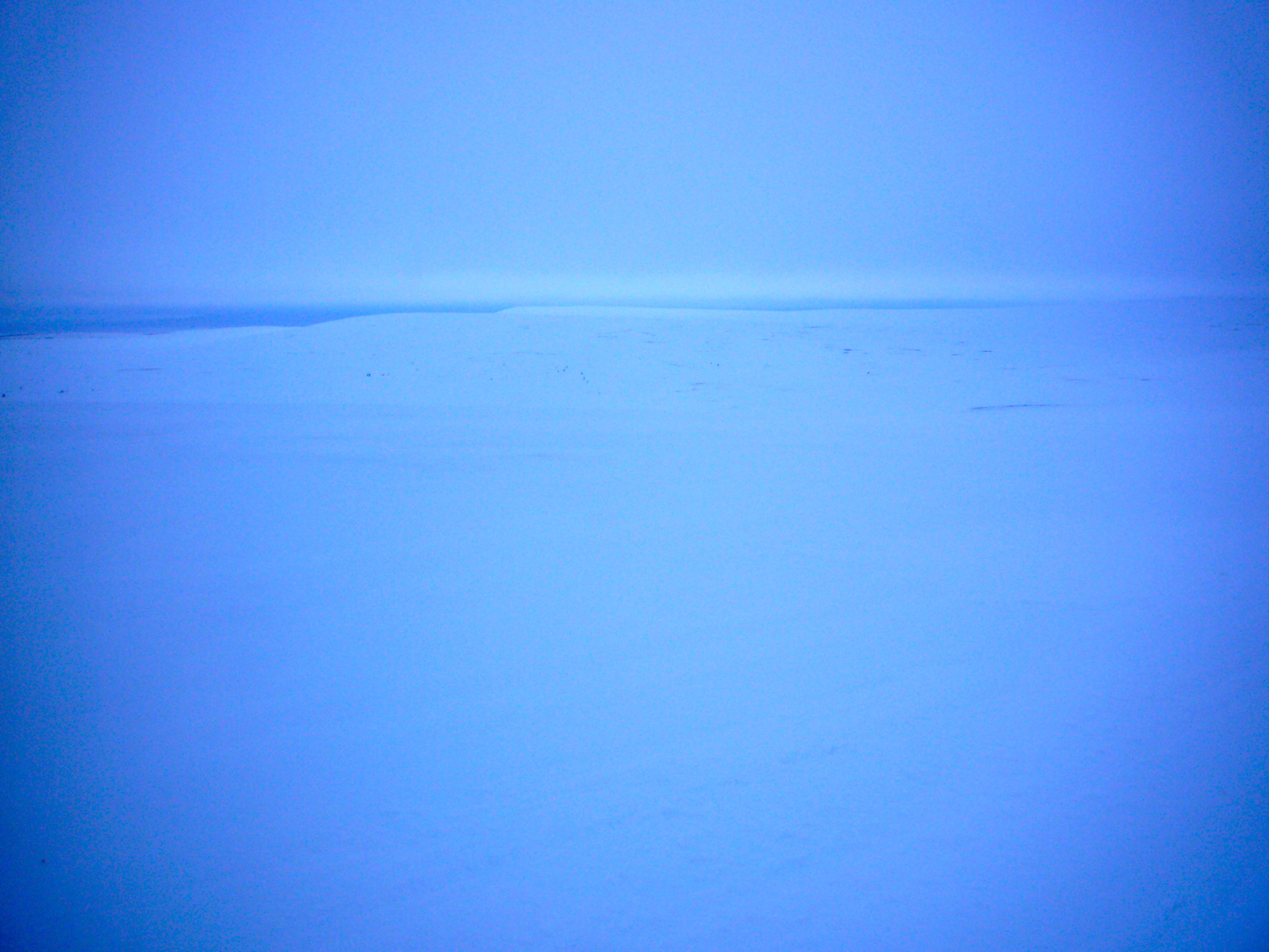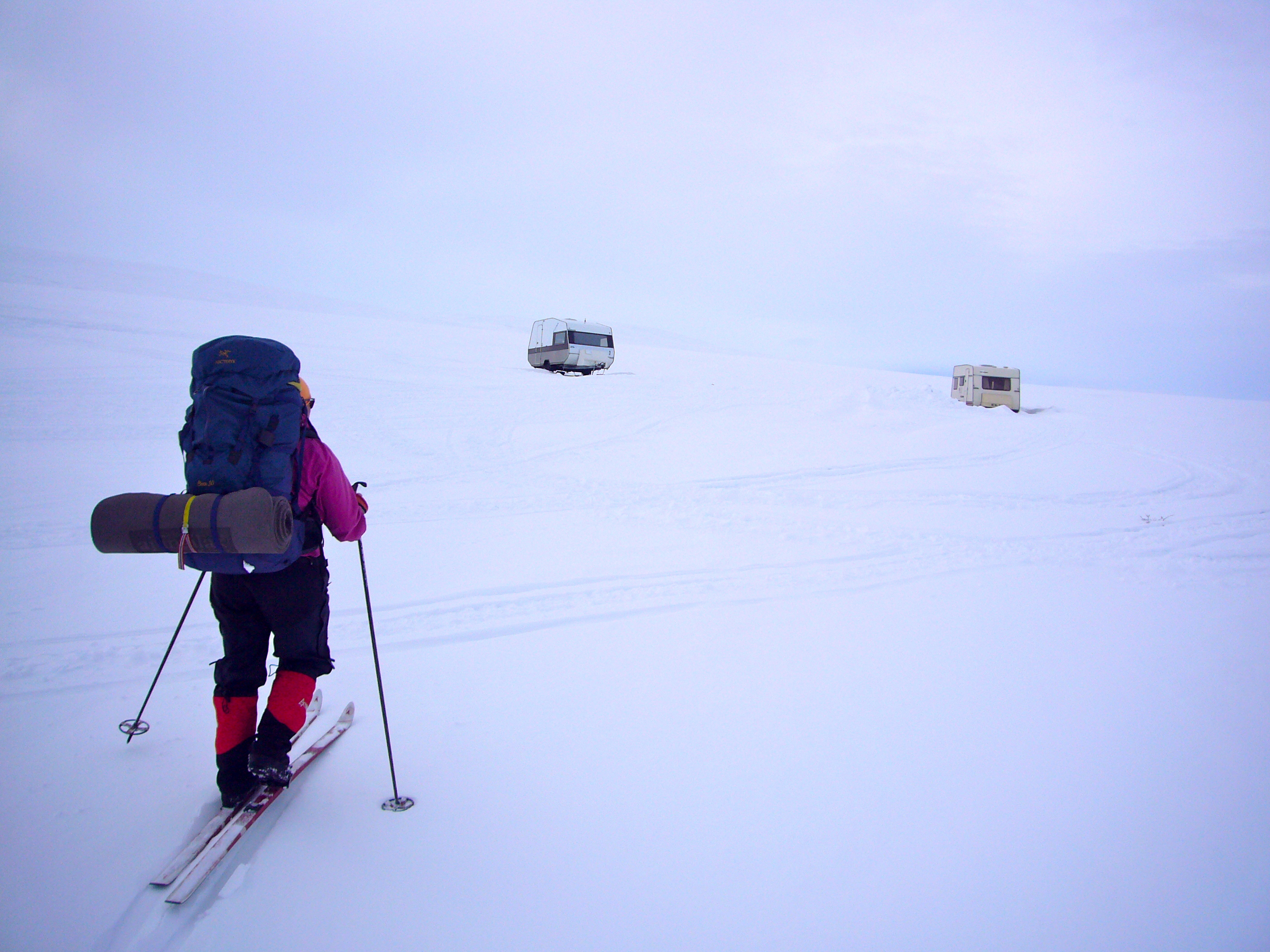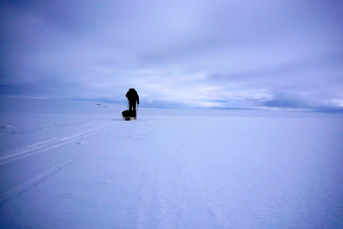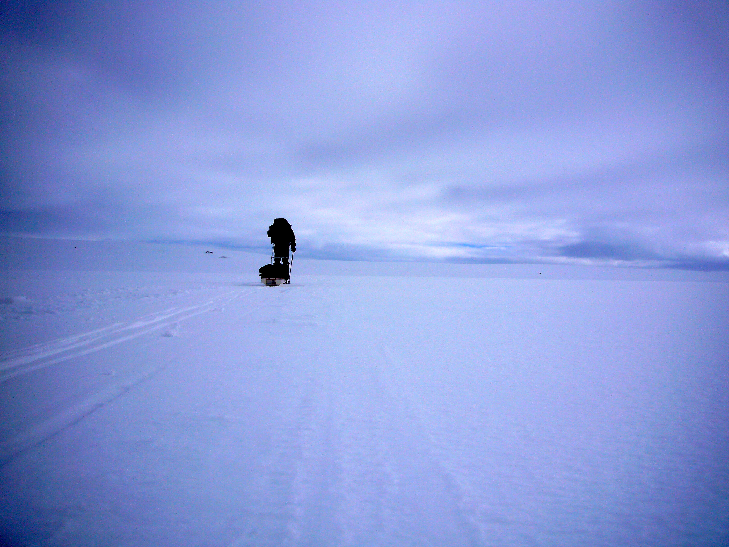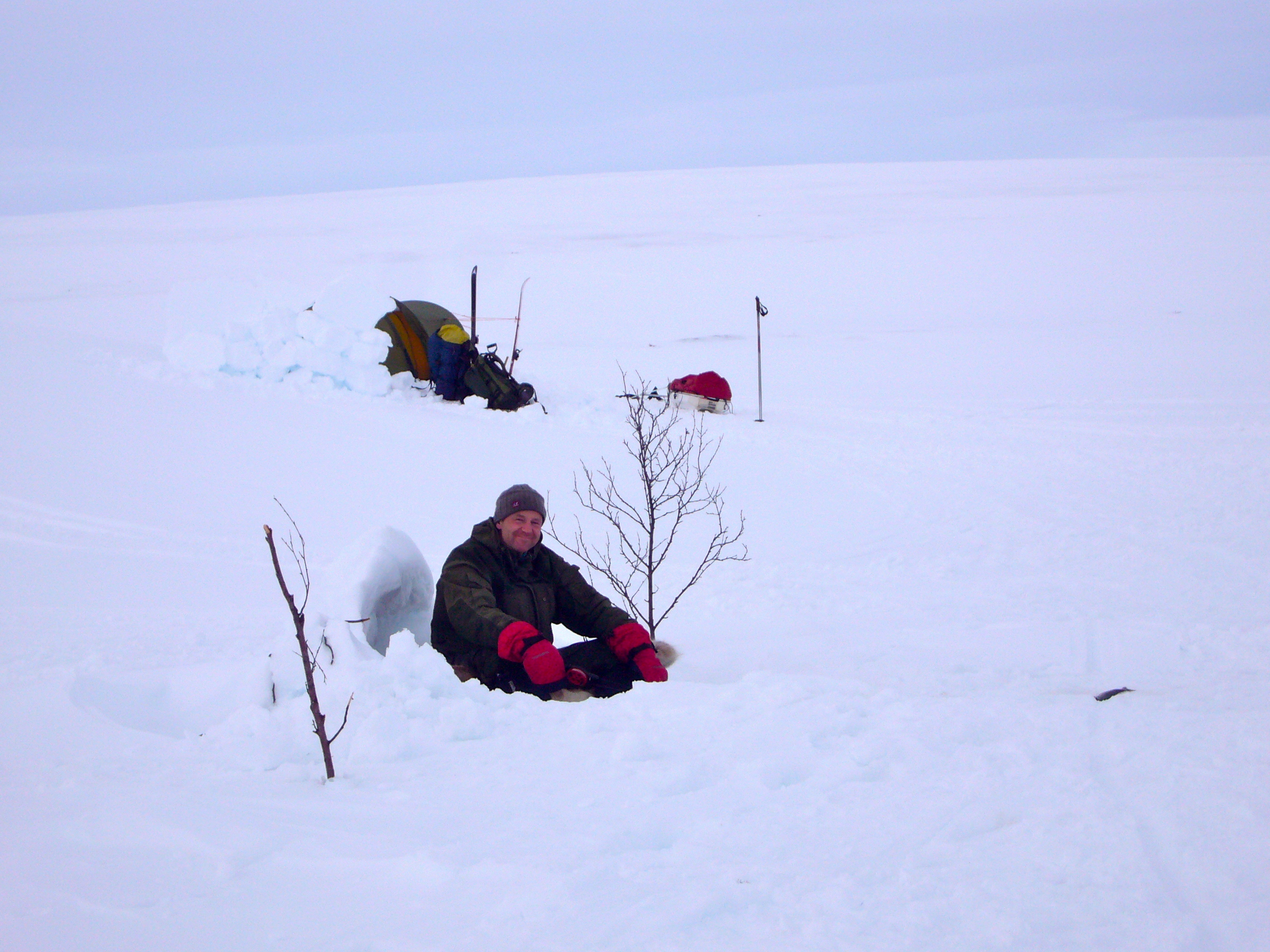 Vi våknet til skyet vær og mye vind. Det blåste jevnt gjennom hele dagen og vinden var oppe i kuling, sørlig retning. Til tider fikk vi vinden rett i mot. Vi så verken scootere eller annet liv denne dagen, bortsett fra hele tre rever til sammen. Sikten var også til tider dårlig, føret var glatt og med lite feste og nedbøren kom tidvis i form av regn. Skiene slukte klister. Lunsjpausen tok vi inne i vindsekken. Det var godt å få litt ly for vinden. Likevel var det en god dag, en dag da vi kjente kreftene i naturen og så landskapet på en ny måte.