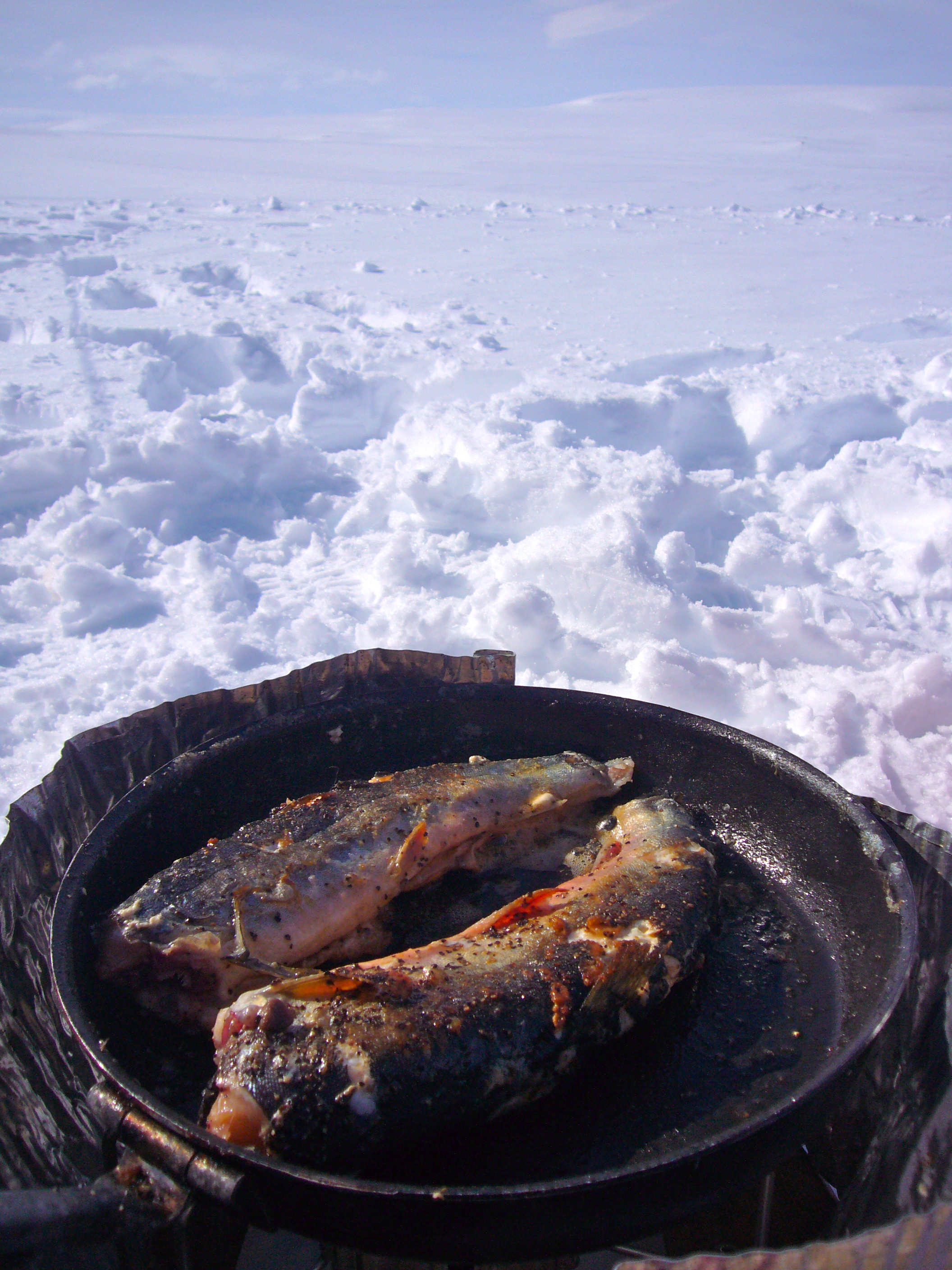 Vi gjentok suksessen med en fire timers lunsj, denne gang ved Jorbaluoppal. Det var litt mer trekk og litt kaldere, men sol og fint vær. Så begynte vi på kryssingen av Iesjávri. Drøye 10 km var ruta over vannet, og det var laaangt. Vi møtte masse både folk på ski og scootere og følte virkelig på at dette var hovedveien. Vi hadde fått tips om å fiske ved den lille holmen vi traff på etter ca 7 km (Guovdosuolu). Der var det mange åpne hull og hadde tydelig vært stor aktivitet tidligere på dagen. Vi slo oss ned ved hvert vårt hull og dro opp den ene røya tykkere og finere enn den andre! Etter to timer og syv røyer hadde temperaturen falt såpass at vi pakket sammen og gikk de tre siste km inn til land. Der fant vi en stor barflekk og slo opp teltet på den, og fikk virkelig vårfølelse! Det ble en nydelig kveld med stekt røye til middag og vi satt ute lenge. I ti-ellevetida så vi noen lys på andre siden av det lille vannet og fant etter hvert ut at det var samer som flyttet reinen på natta, noe vi fikk bekreftet da vi våknet midt på natta og så reinsdyr ikke langt fra teltet. Planen var å sove ute, men det skyet etter hvert til og kom en sluddbøye så vi trakk inn.