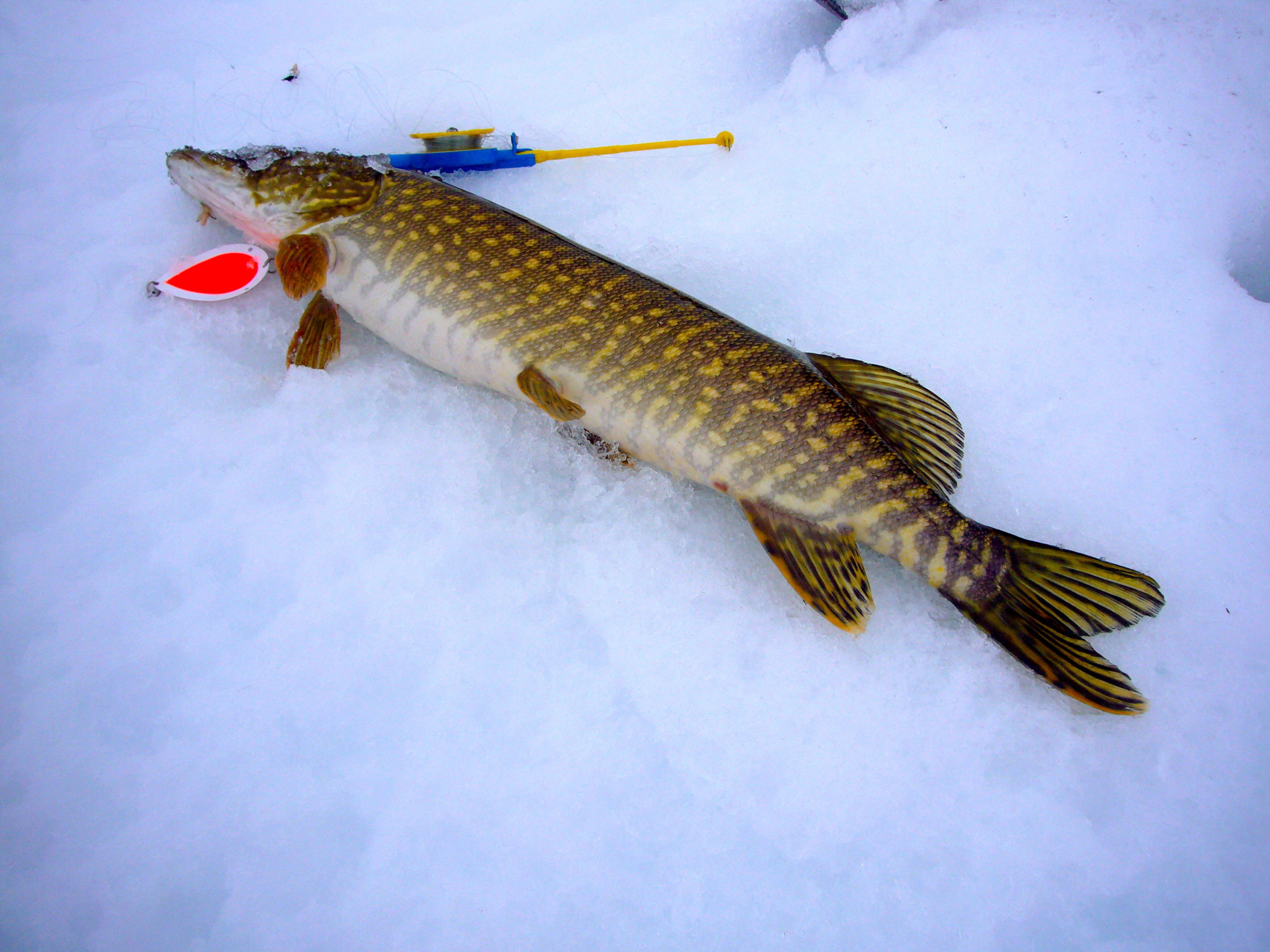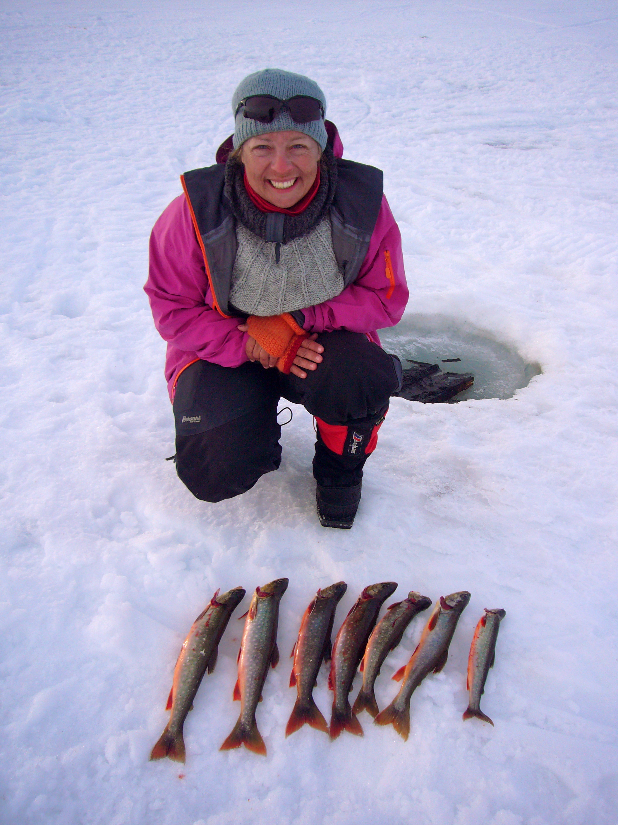 Lunsjen hadde vi på Ellesbuolzzajávri. Vi boret hull til isfiske men her fant vi kun myrvann. Vi prøvde fiskelykken på Ruollajávri også og før Lars Erik hadde fått kroken i bunn fikk han napp. En diger gjedde på 2-3 kg!