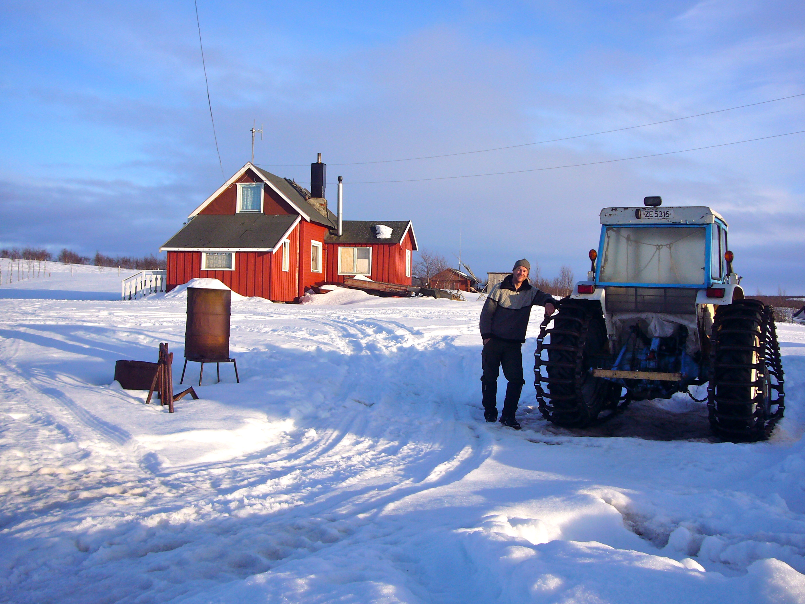 De siste km gikk gjennom skogen og ned til Masi. Vi fulgte scooterløypa så langt det lot seg gjøre, krysset riksvegen og fortsatte nedover. Løypa endte opp på en gårdsplass… Der var det stopp og vi lurte litt på hva vi skulle gjøre videre. Klokka var nå seks om ettermiddagen. Mannen på gården, som presenterte seg som Per, var ute i traktor. Vi spurte han om veien til Oves nærmat og åpningstidene. Vi hadde fått tips i Kautokeino om å ta en prat med Ove for tips om veien videre. Dessuten trengte vi mer skismøring. Det var noen km på snøfri vei og vi så litt mørkt på hvordan vi skulle få fraktet oss og pulken dit. Butikken var åpen fra 10-16, og fra 19-20 og Per og Bjørg som var hjelpsomheten selv kjørte oss til Ove. Snakker om mer flaks enn forstand! Hos Ove fikk vi gode råd, men ingen skismøring. Vi hadde feilberegnet bruken av klister og tørrvoks til temperaturer rundt null og måtte innføre restriksjoner på bruken herfra. Det var et vanskelig føre; tørrsnø, skare og sugeføre. Per fortalte oss at ”april” heter ”skaremåneden” på samisk. Jaja, ingen regel uten unntak… Per og Bjørg kjørte oss videre et par km til der scooterløypa på andre siden av dalen startet og vi slo opp teltet på et jorde i bunnen av scooterløypa. Masi opplevde vi som et langstrakt, grått sted, der alt fra skole til bibliotek enten var nedlagt eller planlagt nedlagt. Men en rekke varme og hjelpsomme mennesker!