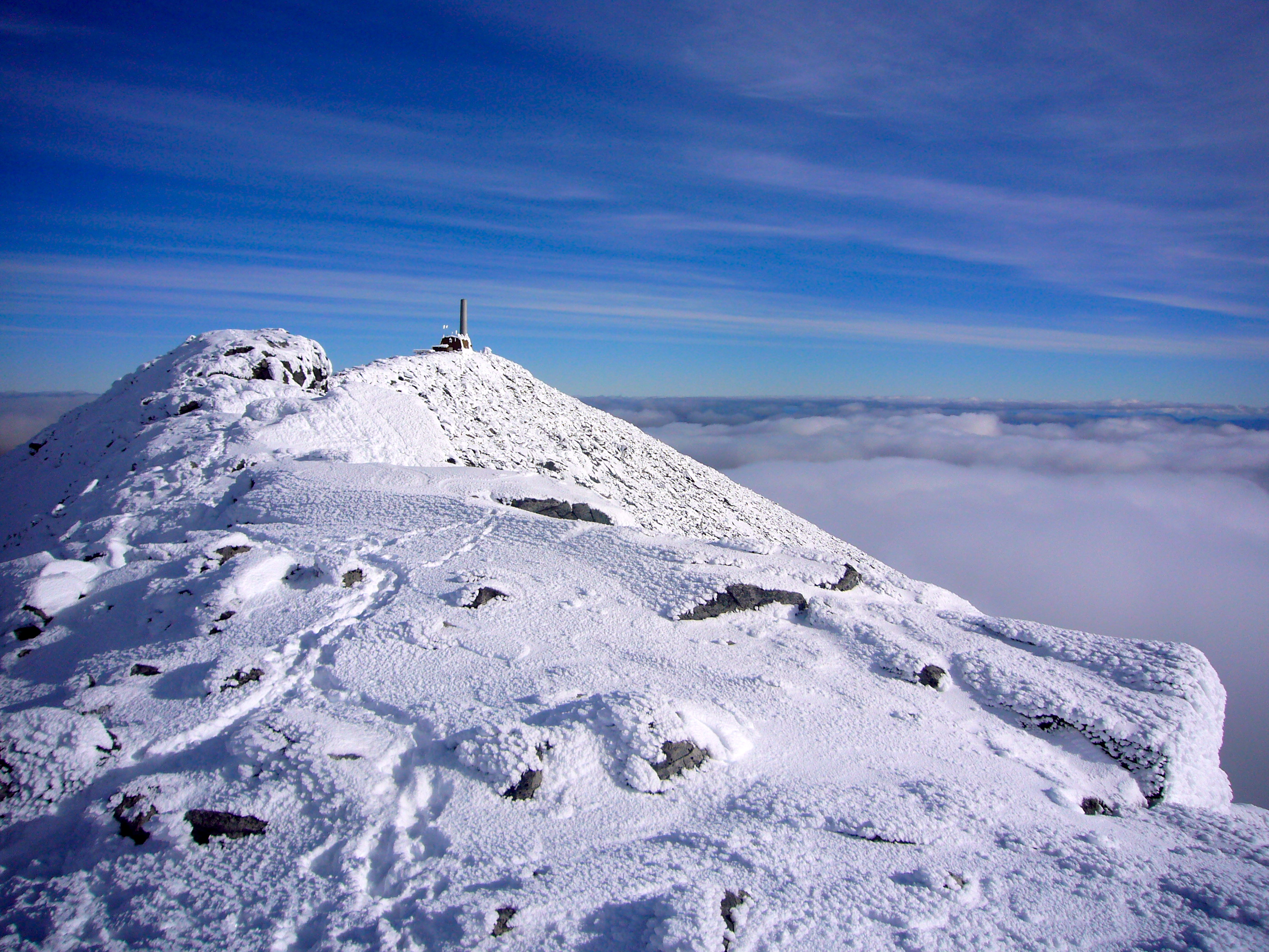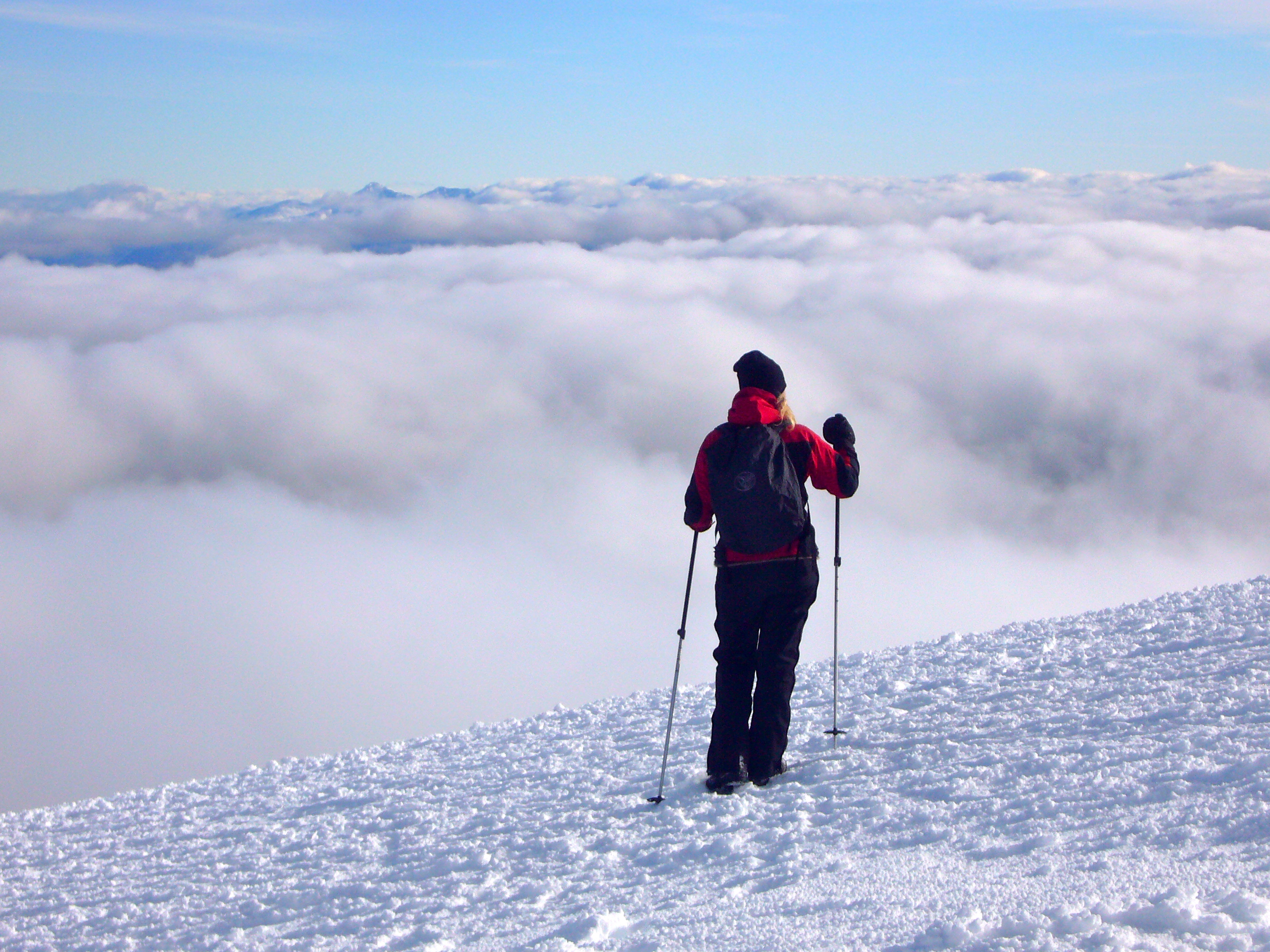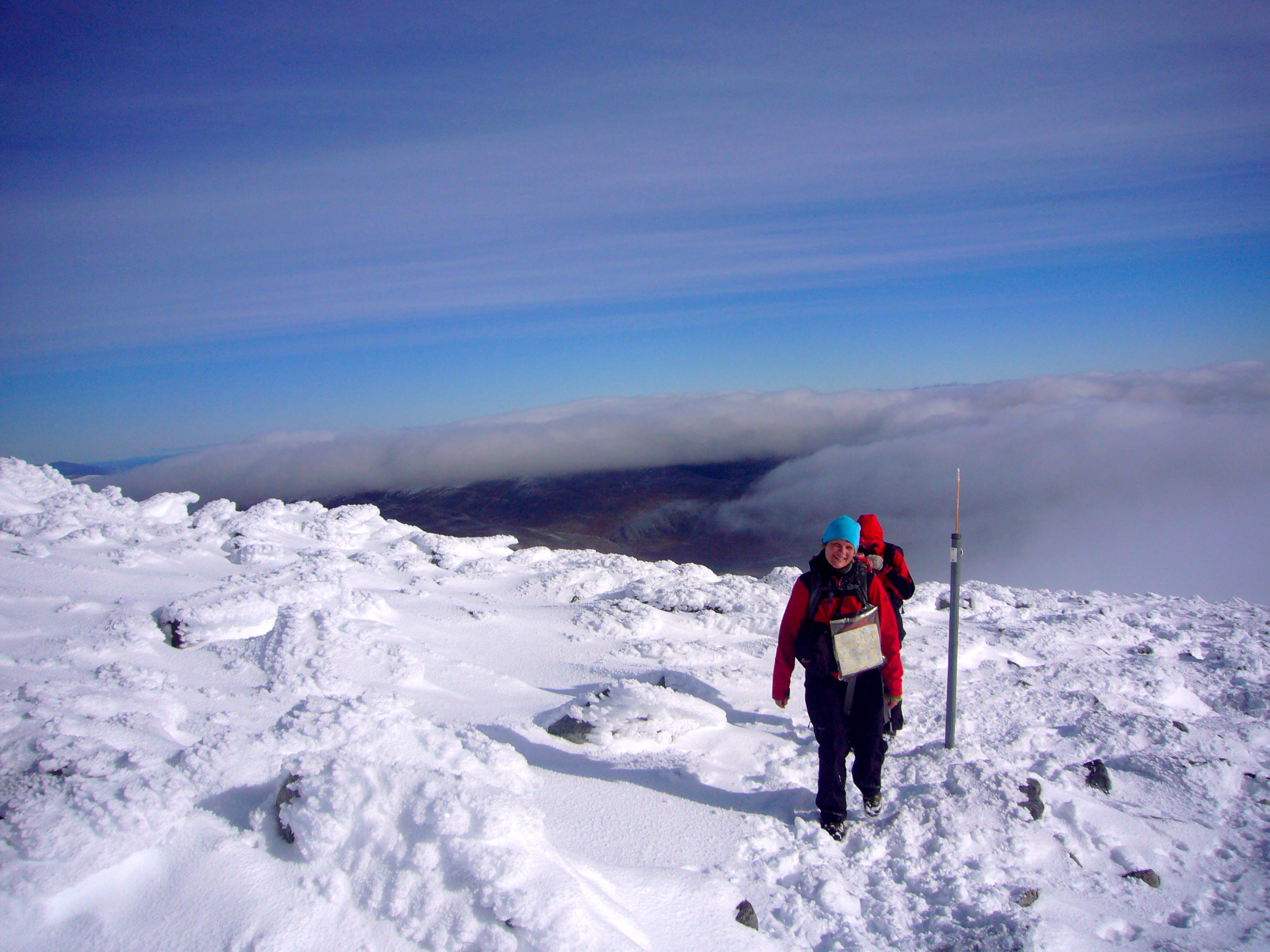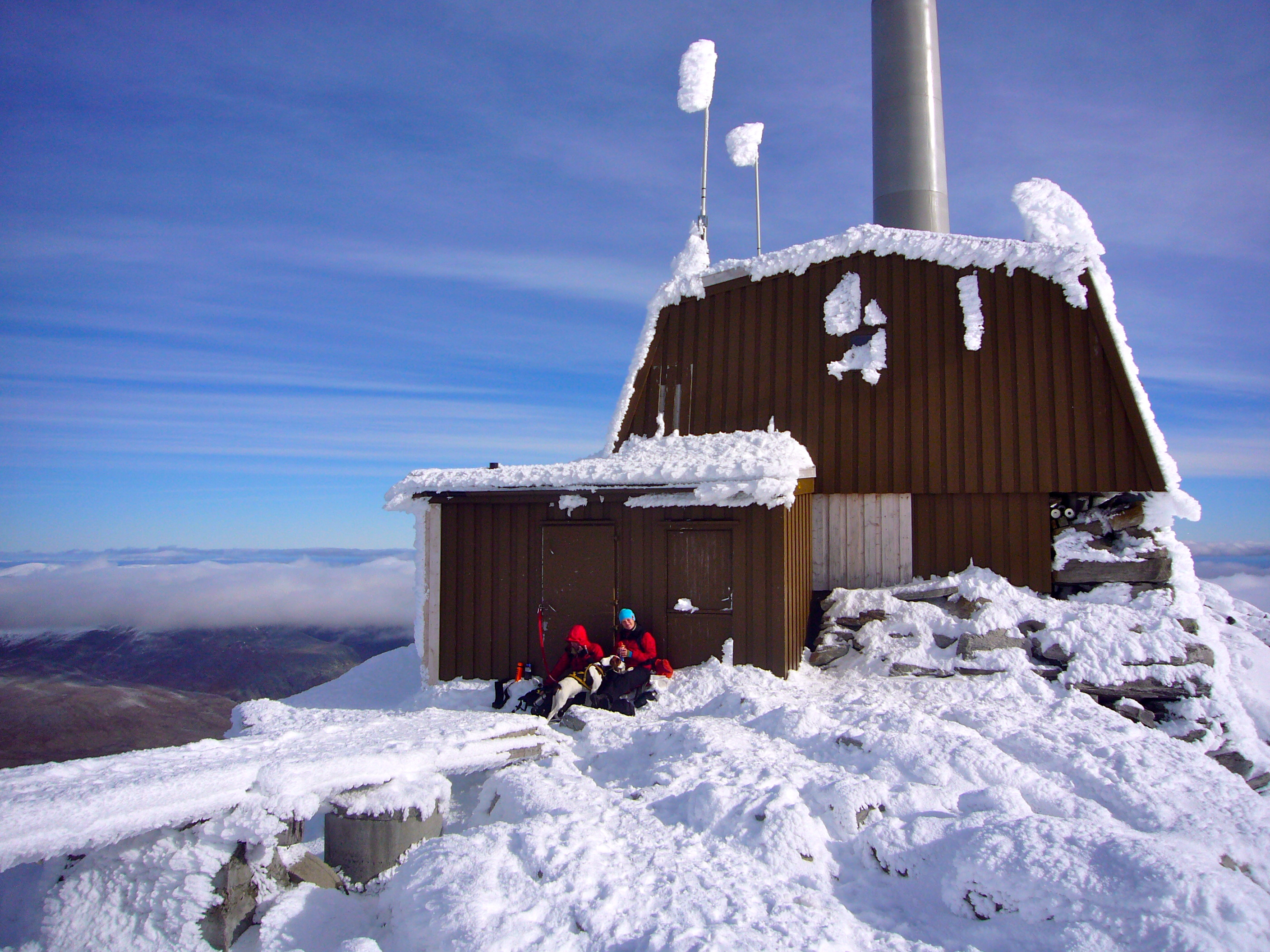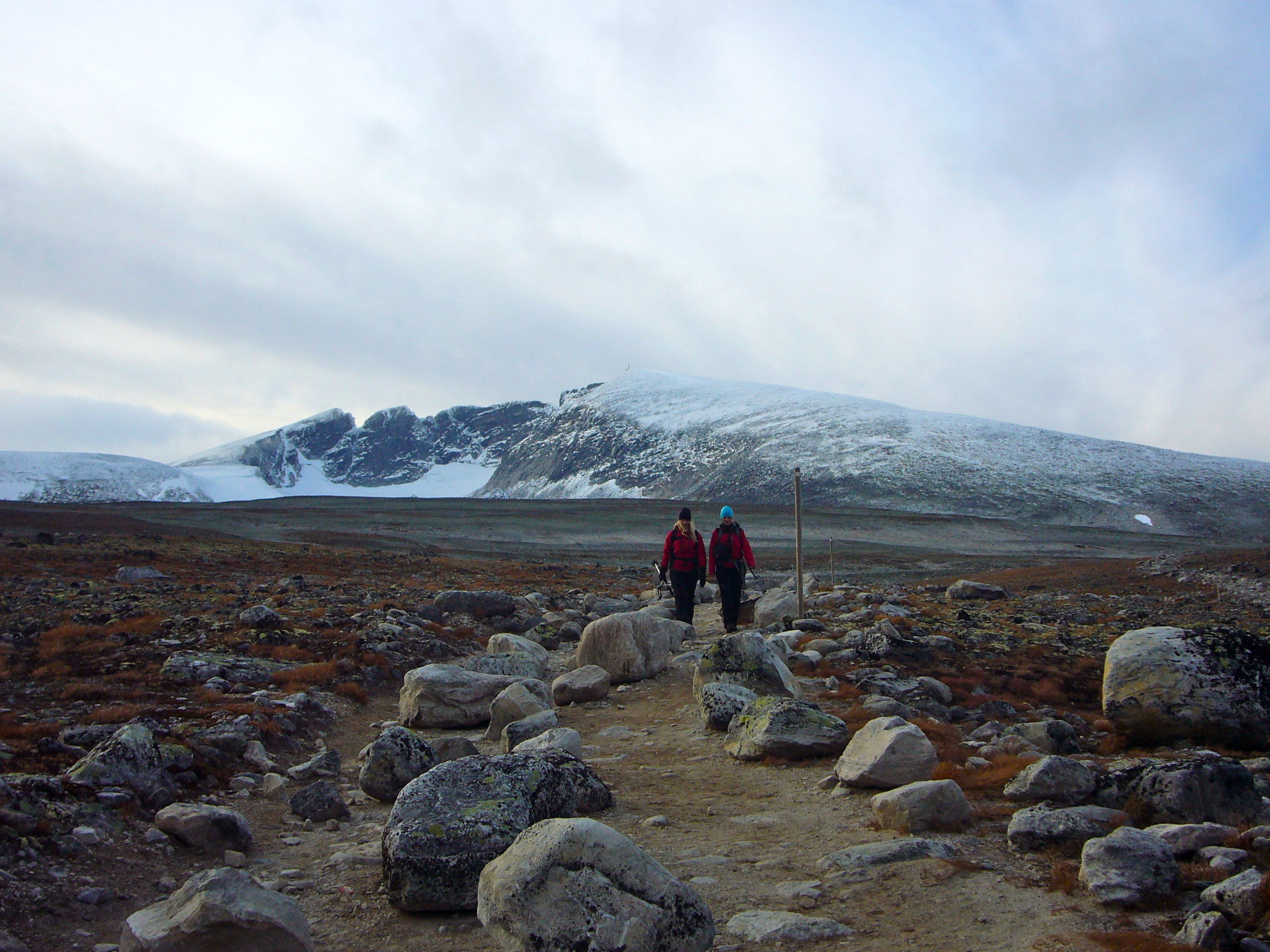Lørdag var det toppturdag. Vi drøyde frokosten godt så hovedhopen fikk kommet seg av gårde fra hytta – trodde vi. Men det kom nok en busslast akkurat i det vi skulle begynne å gå, så vi gikk ikke akkurat alene oppover… Vi startet i lavt skydekke og grått, og så ikke toppen. Det var jevn og fin stigning og da vi kom til 1800 moh begynte snøen å legge seg og det ble riktig så greit å gå i ura derfra – særlig når et stort antall folk hadde gått i forkant og tråkket vei! Ved ca 2000 moh begynte det å lette og like etter ble det knall blå himmel og vi så over skyen fra sørøst til nordvest, mens det var helt klart fra nordvest til sørost og vi så flotte Trollheimens topper ikke langt unna. Vi så imidlertid Høgronden og Rondeslottets topper som stakk opp over skyene. Det var helt vindstille på toppen (2286 moh) og vi ble der i 2,5 time (inkludert en tur mot Midttoppen) før vi tok turen nedover igjen.