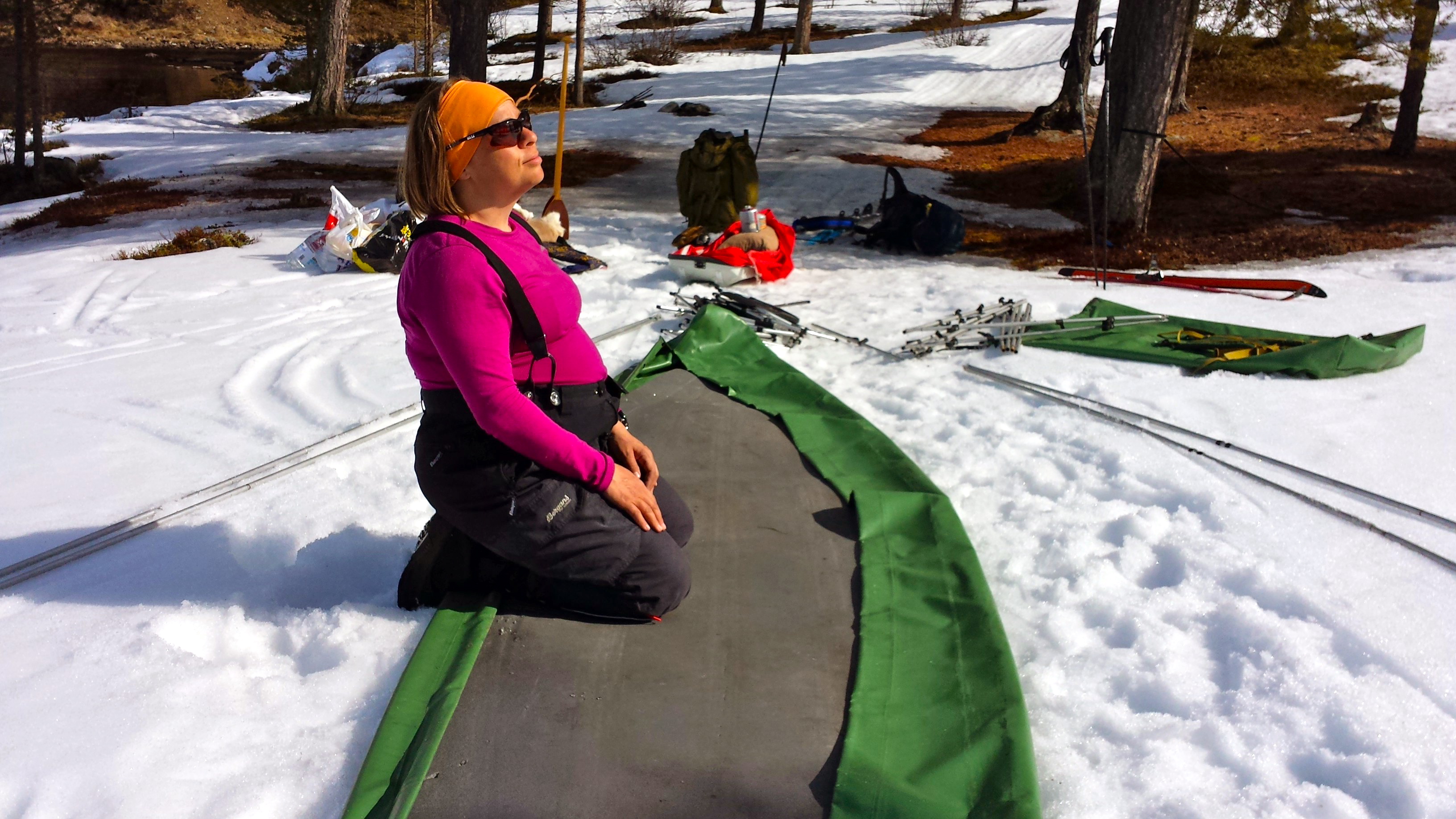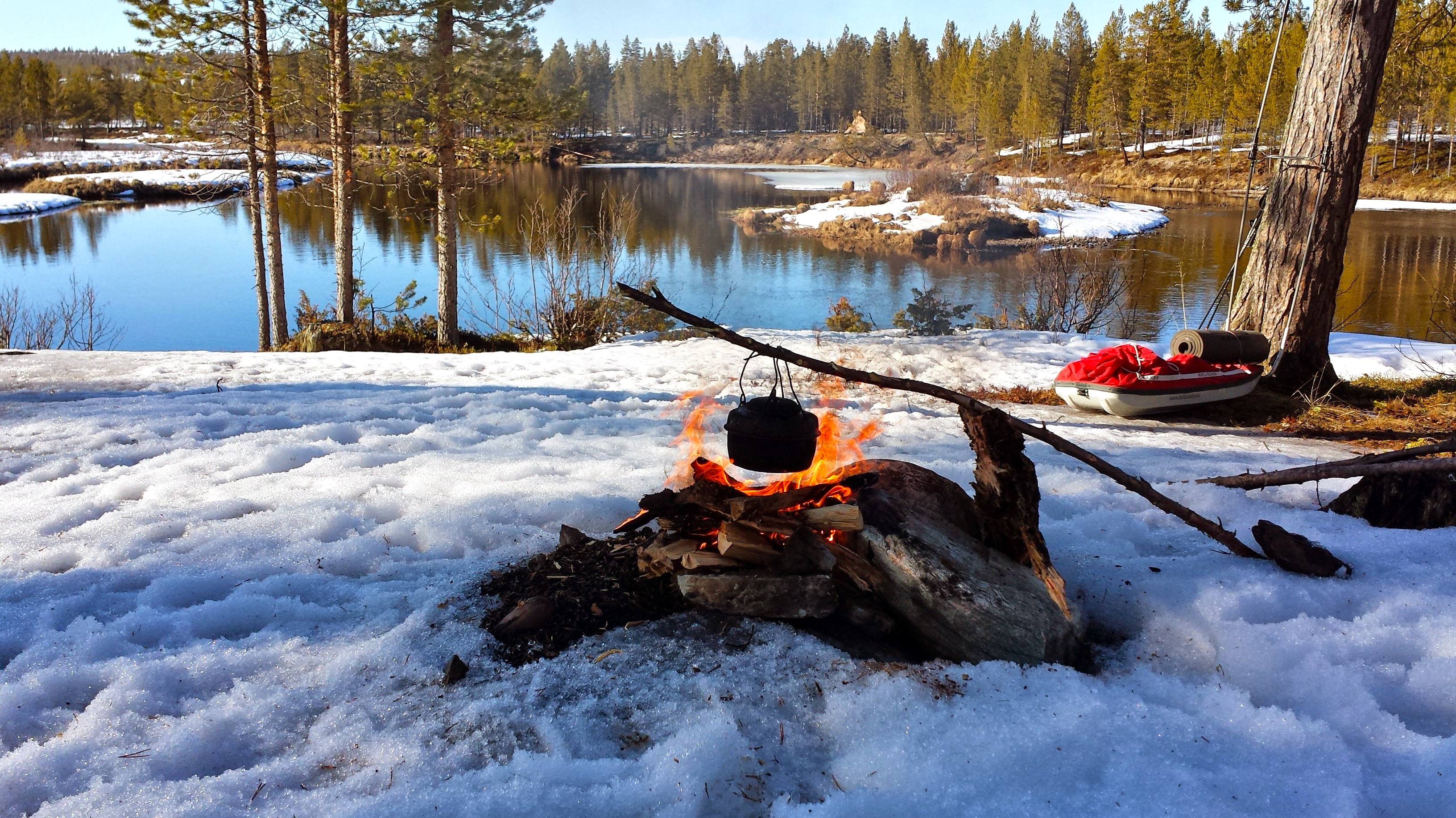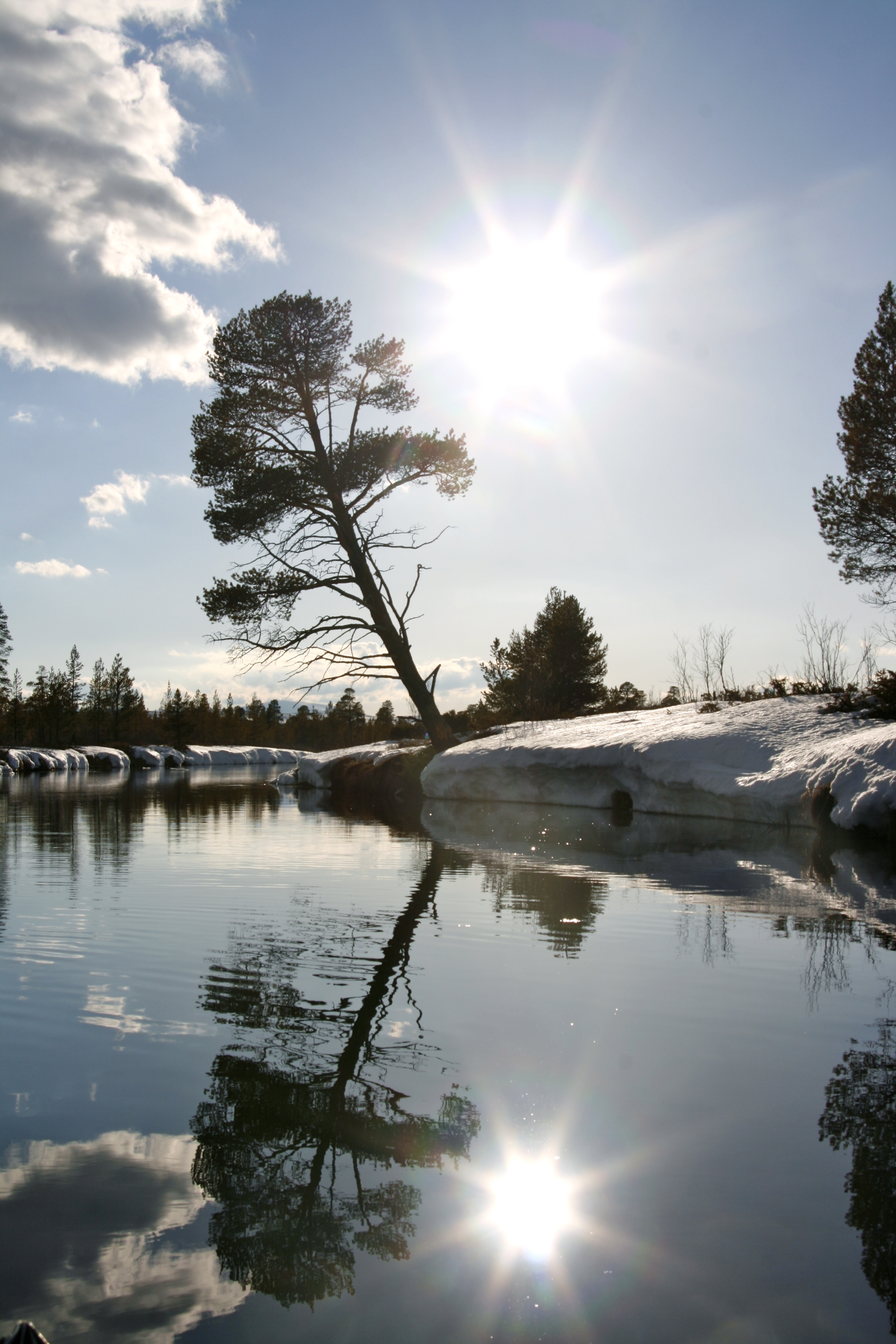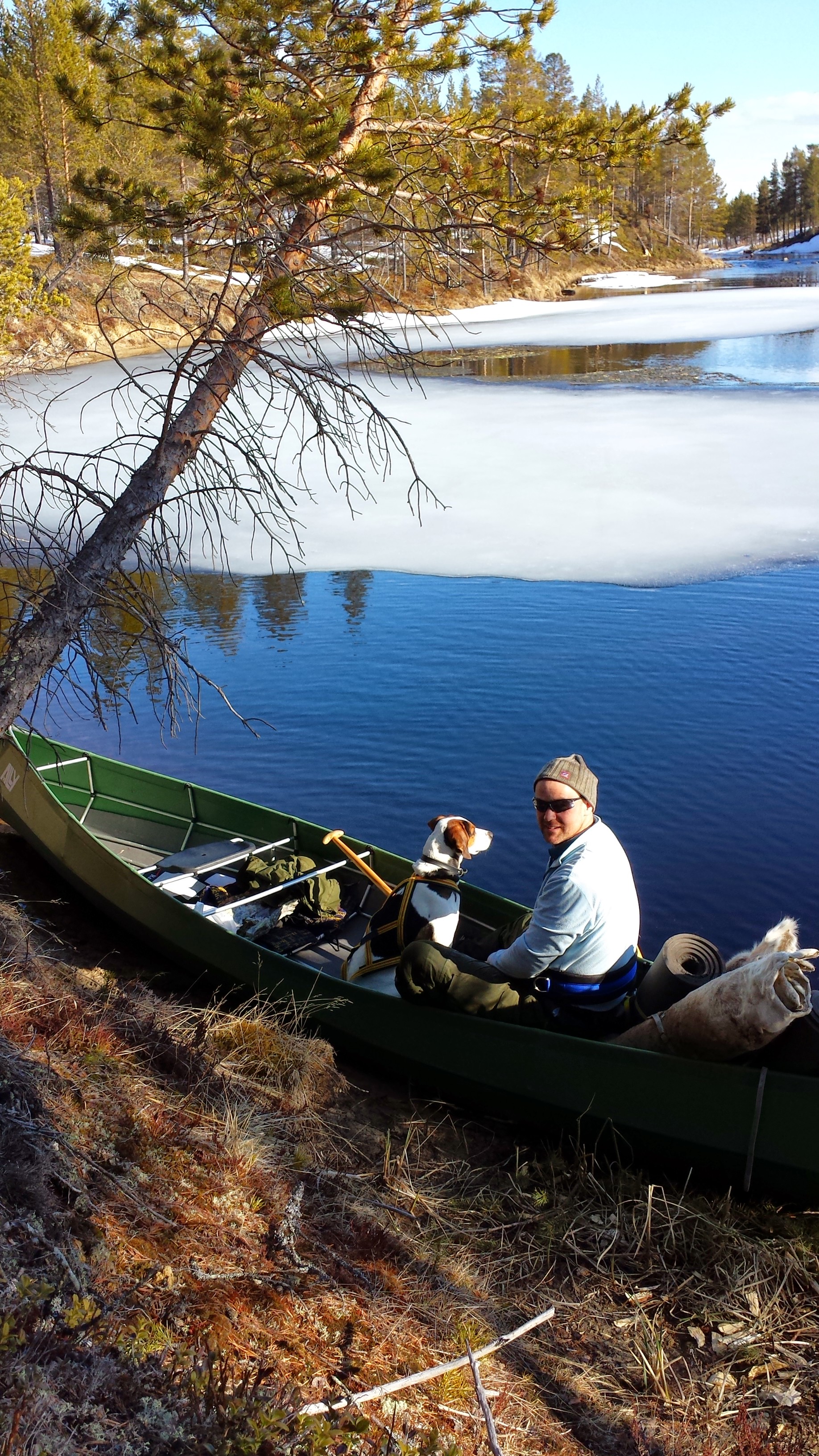 Etter en finfin påskeferie i Oslo, Hønsehuset og Røros måtte vi ha litt teltliv. Vi kjørte utover mot Langen Gjestegård i Femundsmarka og parkerte bilen ca 4 km før. Vi lastet opp pulken med lavvo, Alley-kano og god mat og gikk 3-400 meter på ski (relativt råtten snø, men det gikk et scooterspor akkurat dit vi skulle). Deretter lastet vi av og begynte å bygge Alley-kanoen. Da den var ferdig sjøsatte vi den, padlet over til andre siden og fant en helt perfekt leirplass der lavvoen ble satt opp og reinskinnene rullet ut. Så var det bare å finne fram solkrem, solbriller og bok og nyte stillheten og livet på tur. Vi fikk ettermiddagsbesøk av Åge og Kristmar som vi inviterte på kaffe. Da de dro tok vi kanoen og padlet nedover elva mot Håsjøen for å se etter bever. Det var masse felte trær langs elva. Furutrær først og fremst. Ganske spesielt for beveren akkurat her i denne elva. Vi kom oss nesten ned til utløpet av elva, men der lå det is. Vi så imidlertid en liten bever som svømte, dukket og koste seg. Vi padlet litt oppover etterpå og kom oss et lite stykke før vi snudde tilbake, tenkte bål, stekte pølser og så stjernehimmelen komme fram. Det hadde vært kaldt om natta, men det tok ikke lange tiden etter sola var stått opp før det var samme shortsvær som dagen før. Vi rakk imidlertid et koselig kaffebål før det, og stekte pannekaker til frokost. Lars Erik hadde en liten tur oppover langs Gjetelva i den råtne snøen. Etter en herlig og lat formiddag satte vi kursen mot Røros igjen og fikk servert deilig middag før turen gikk videre til Trondheim og tilbake til hverdagen igjen.