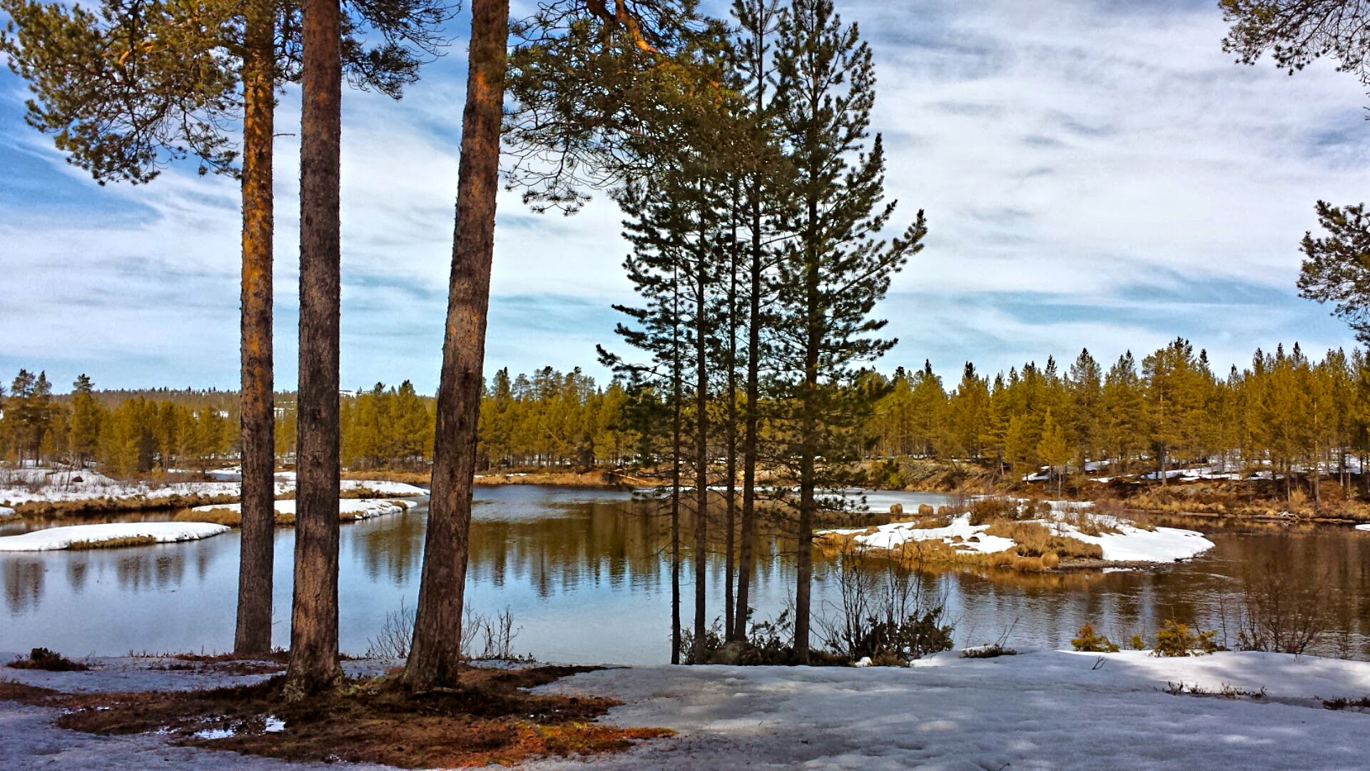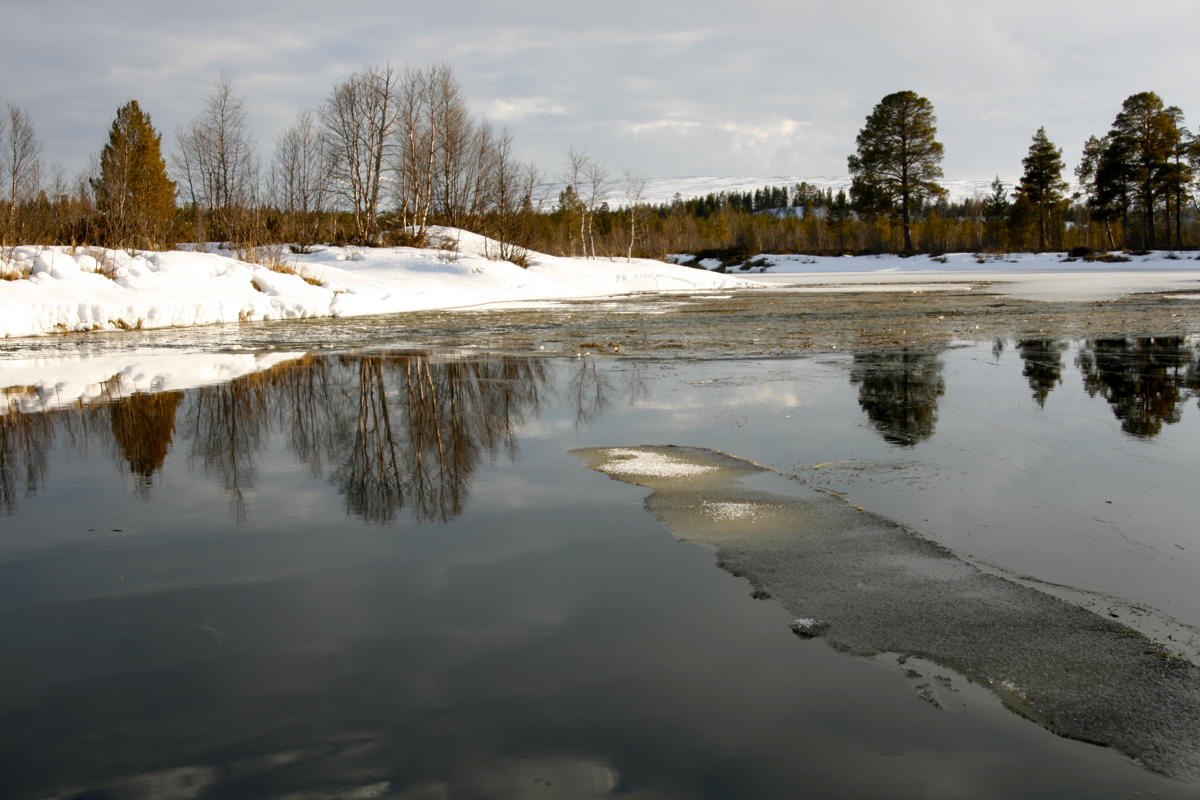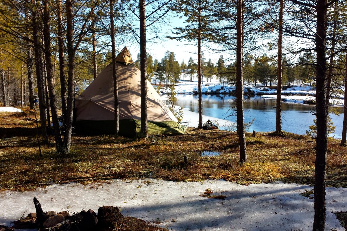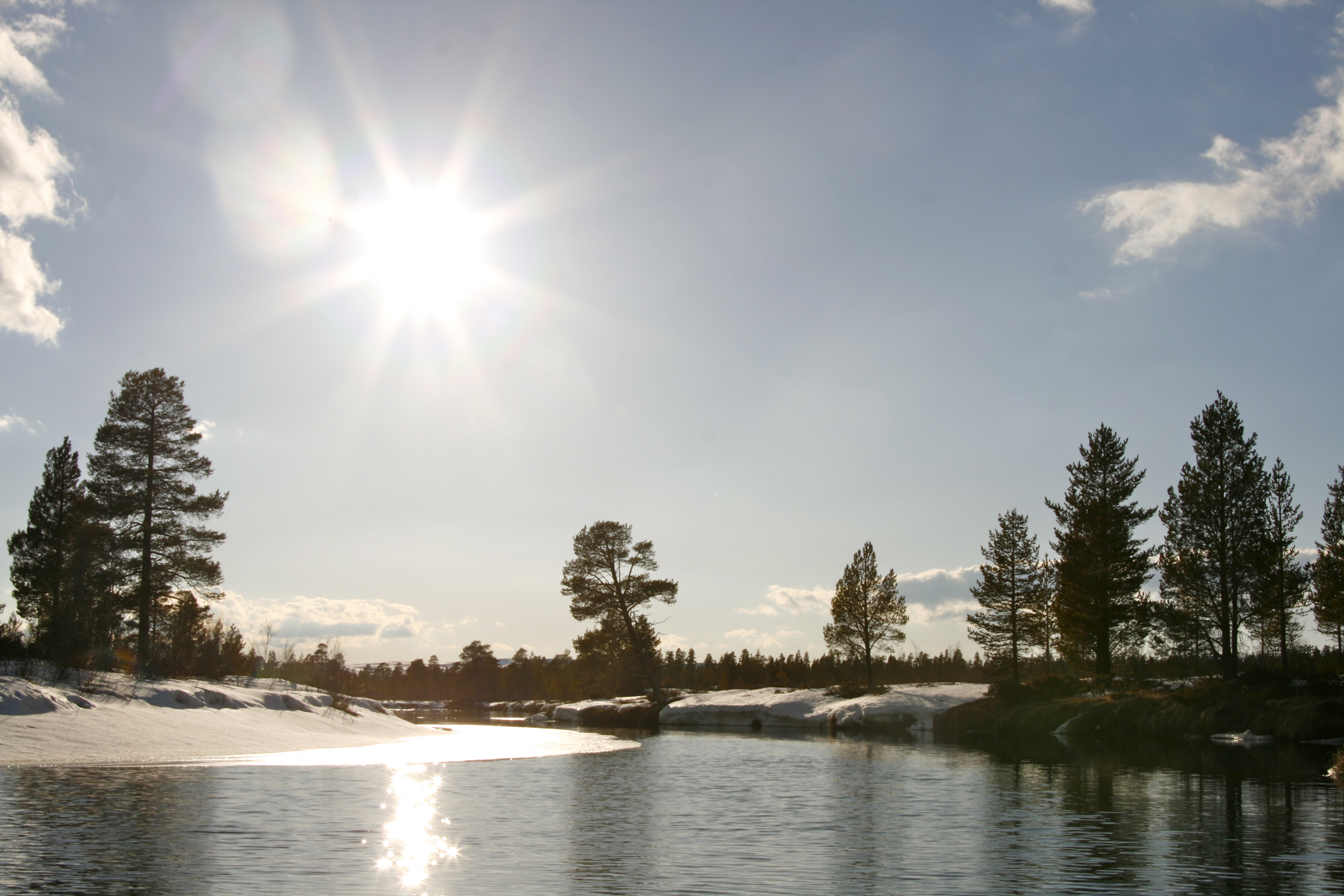 Etter en finfin påskeferie i Oslo, Hønsehuset og Røros måtte vi ha litt teltliv. Vi kjørte utover mot Langen Gjestegård i Femundsmarka og parkerte bilen ca 4 km før. Vi lastet opp pulken med lavvo, Alley-kano og god mat og gikk 3-400 meter på ski (relativt råtten snø, men det gikk et scooterspor akkurat dit vi skulle). Deretter lastet vi av og begynte å bygge Alley-kanoen. Da den var ferdig sjøsatte vi den, padlet over til andre siden og fant en helt perfekt leirplass der lavvoen ble satt opp og reinskinnene rullet ut. Så var det bare å finne fram solkrem, solbriller og bok og nyte stillheten og livet på tur. Vi fikk ettermiddagsbesøk av Åge og Kristmar som vi inviterte på kaffe. Da de dro tok vi kanoen og padlet nedover elva mot Håsjøen for å se etter bever. Det var masse felte trær langs elva. Furutrær først og fremst. Ganske spesielt for beveren akkurat her i denne elva. Vi kom oss nesten ned til utløpet av elva, men der lå det is. Vi så imidlertid en liten bever som svømte, dukket og koste seg. Vi padlet litt oppover etterpå og kom oss et lite stykke før vi snudde tilbake, tenkte bål, stekte pølser og så stjernehimmelen komme fram. Det hadde vært kaldt om natta, men det tok ikke lange tiden etter sola var stått opp før det var samme shortsvær som dagen før. Vi rakk imidlertid et koselig kaffebål før det, og stekte pannekaker til frokost. Lars Erik hadde en liten tur oppover langs Gjetelva i den råtne snøen. Etter en herlig og lat formiddag satte vi kursen mot Røros igjen og fikk servert deilig middag før turen gikk videre til Trondheim og tilbake til hverdagen igjen.