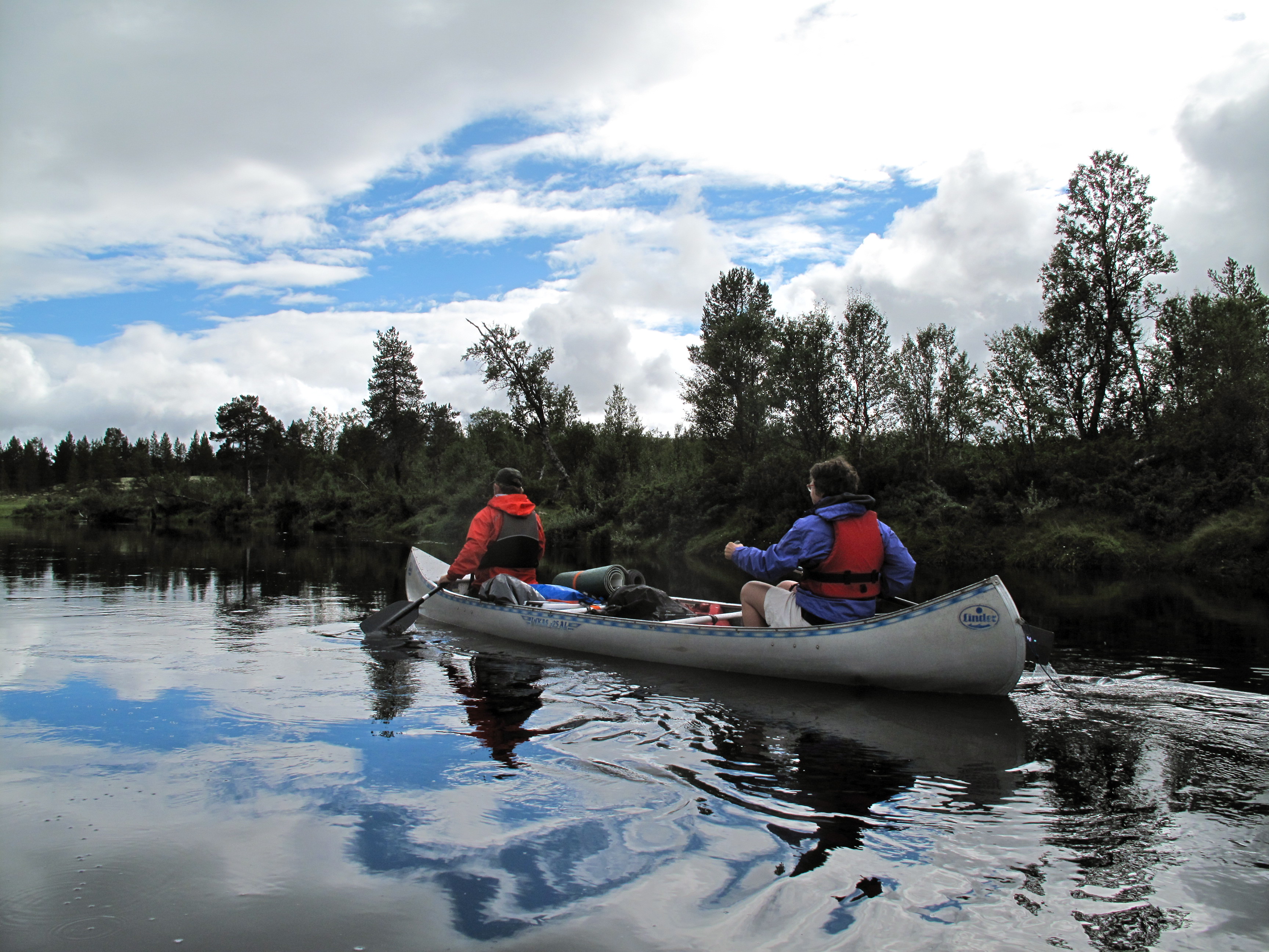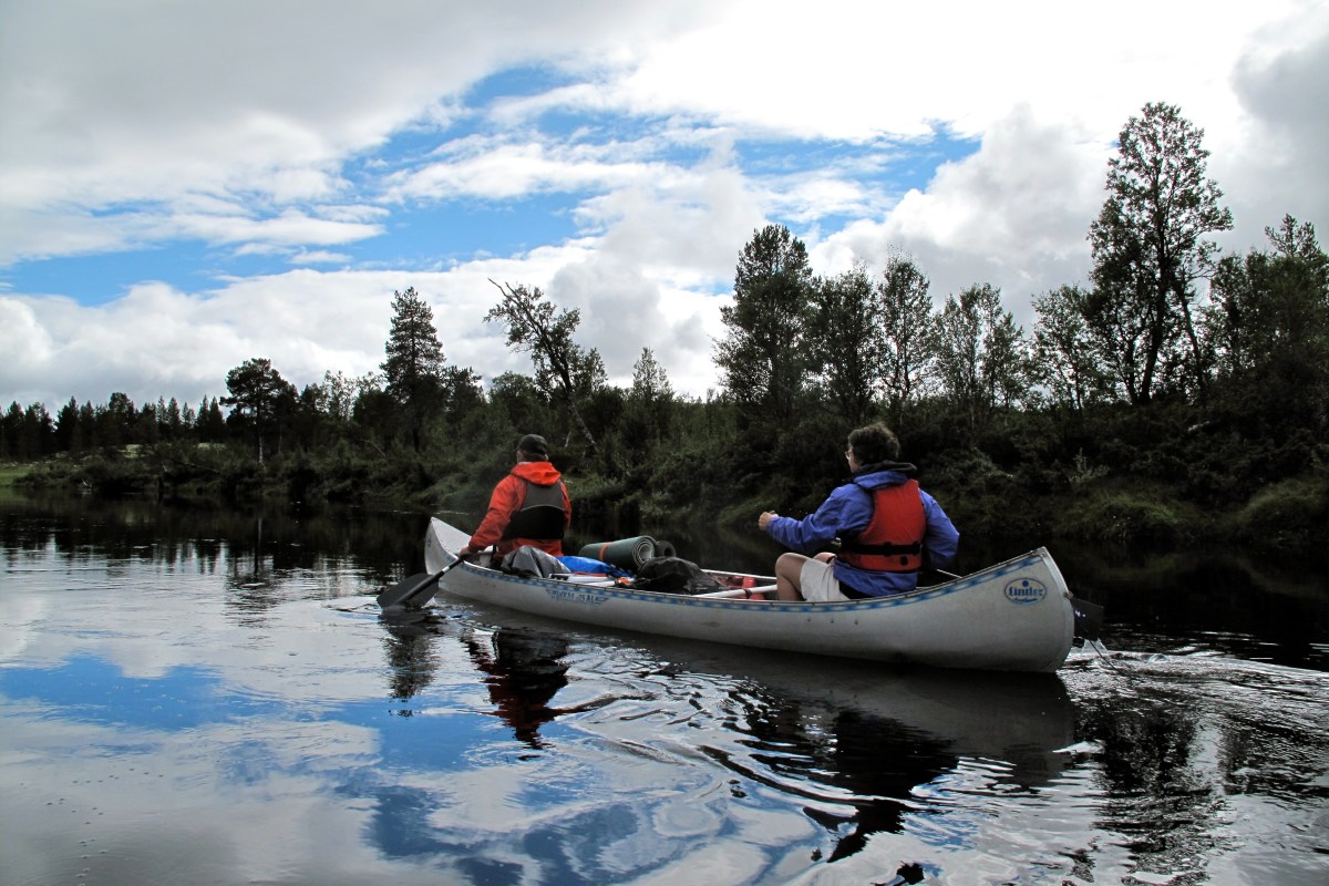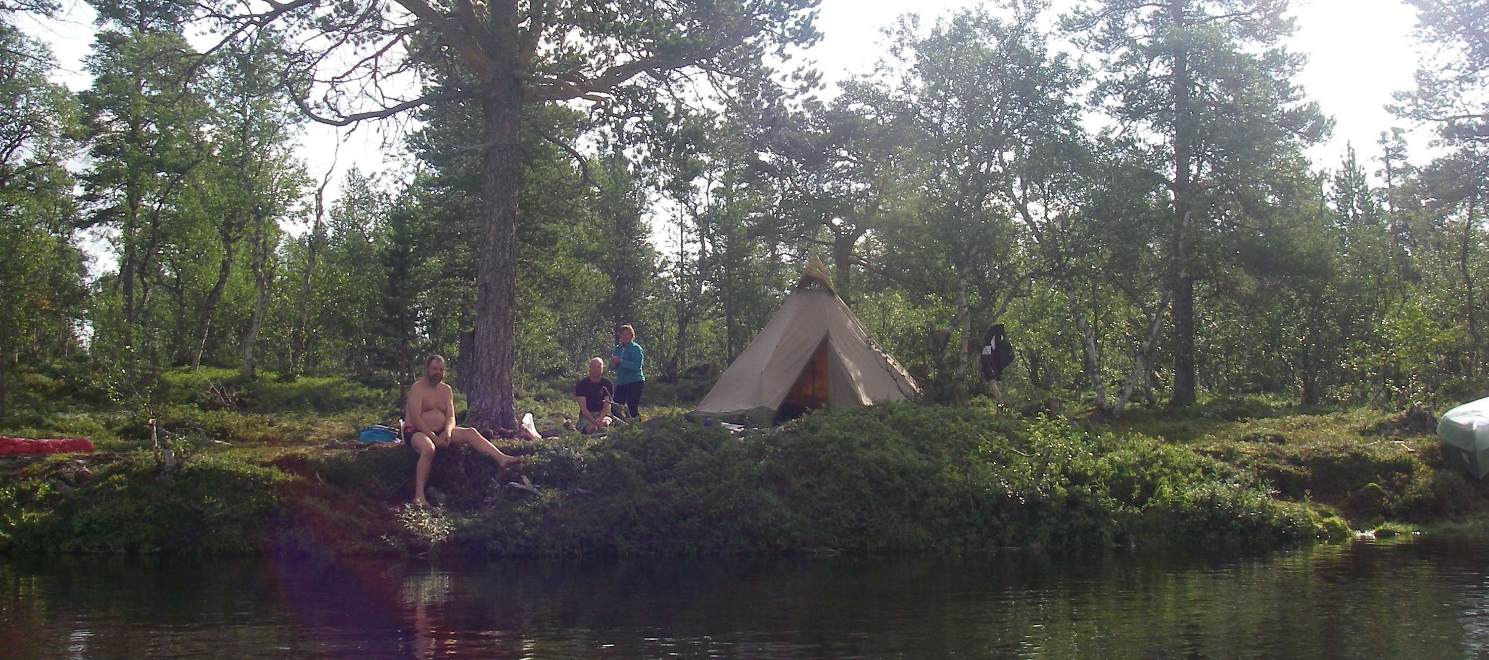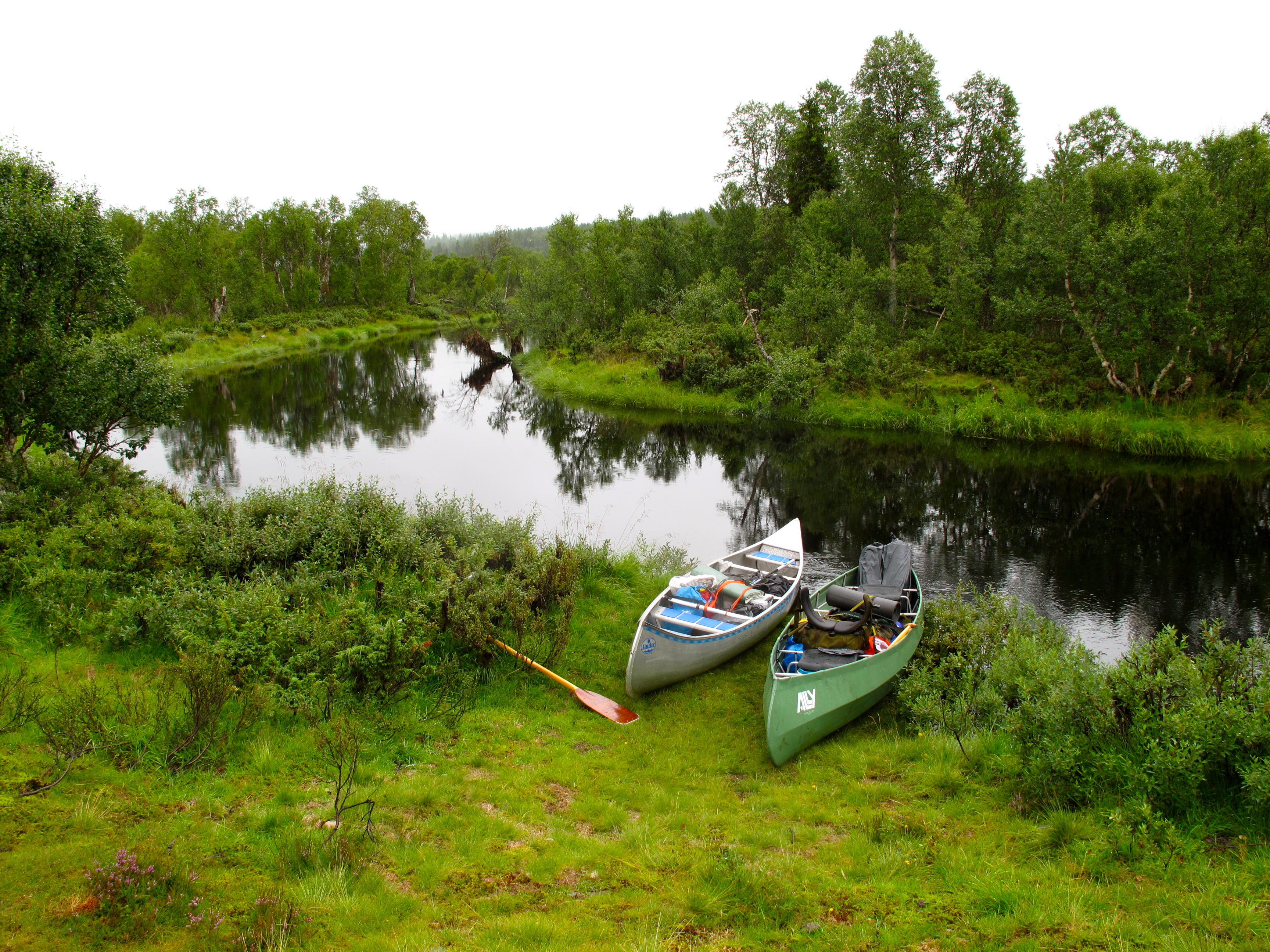 Vi tok av fra Rendalen ved Unset og kjørte østover. Dette er en bomvei, men en flott vei ca 3 mil over fjellet til Sølendalen. Vi kom fram til broa over til Storlægda der vi skulle starte turen. Pappa og Lars Erik kjørte en bil sør til Sølenkroken der vi skulle ende turen mens Mamma og jeg inspiserte elva og området. Siden vi allerede var kommet ganske langt ut på ettermiddagen, regnskyene kom stadig nærmere og vi fant en koselig gapahuk og leirplass rett ved broa bestemte vi oss for å starte rolig med å campe første natta her. Der fikk vi også sjøsatt kanoene og tok en rolig tur litt oppover elva – greit siden det var 15-20 år siden Mamma og Pappa sist satt i kano, og elva sørover startet med et stryk… Vi fikk en flott kveld og feiring av Mammas 64-årsdag med rundstykker og kakao selv om regnet kom, etterhvert ganske kraftig.