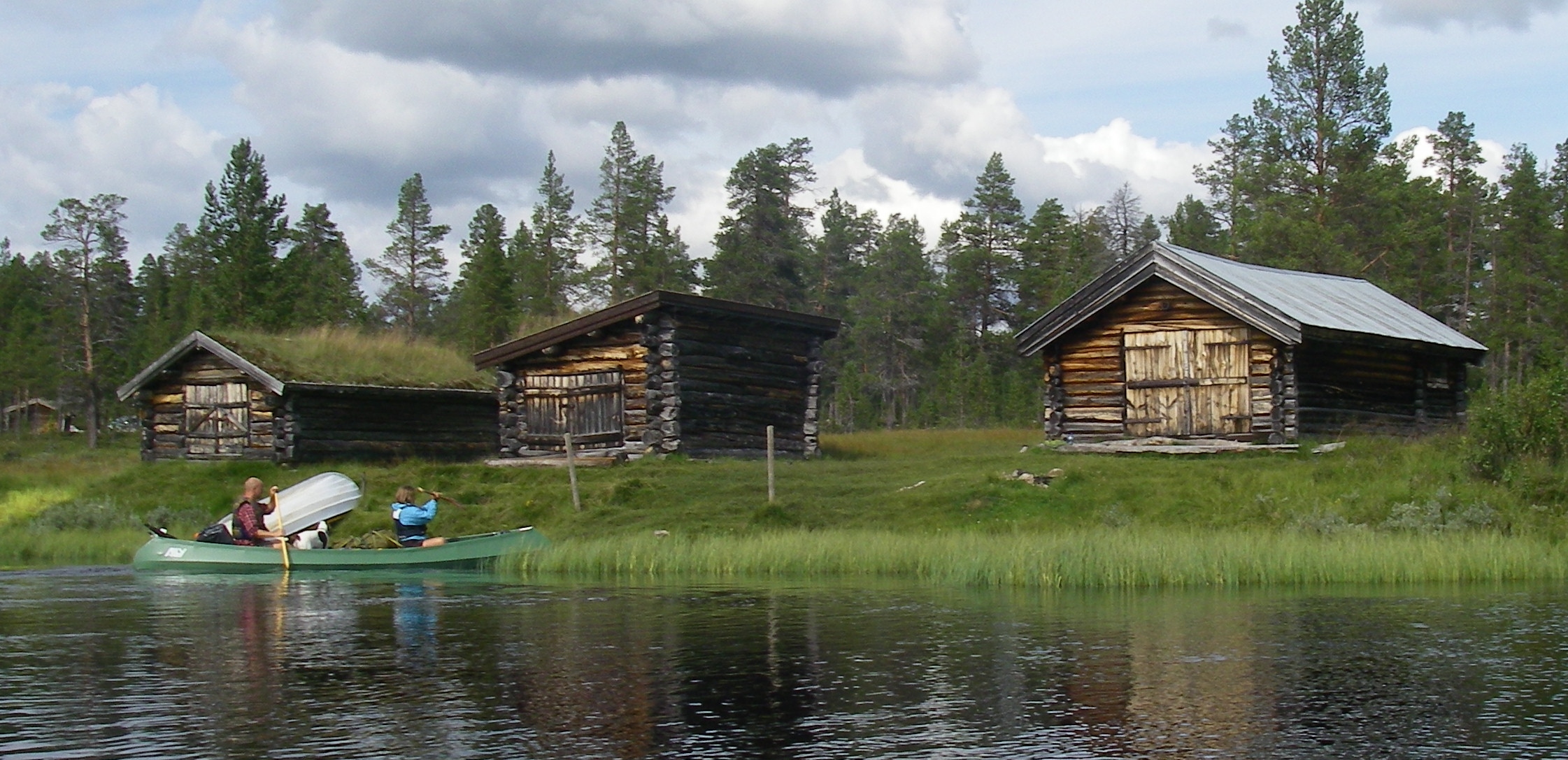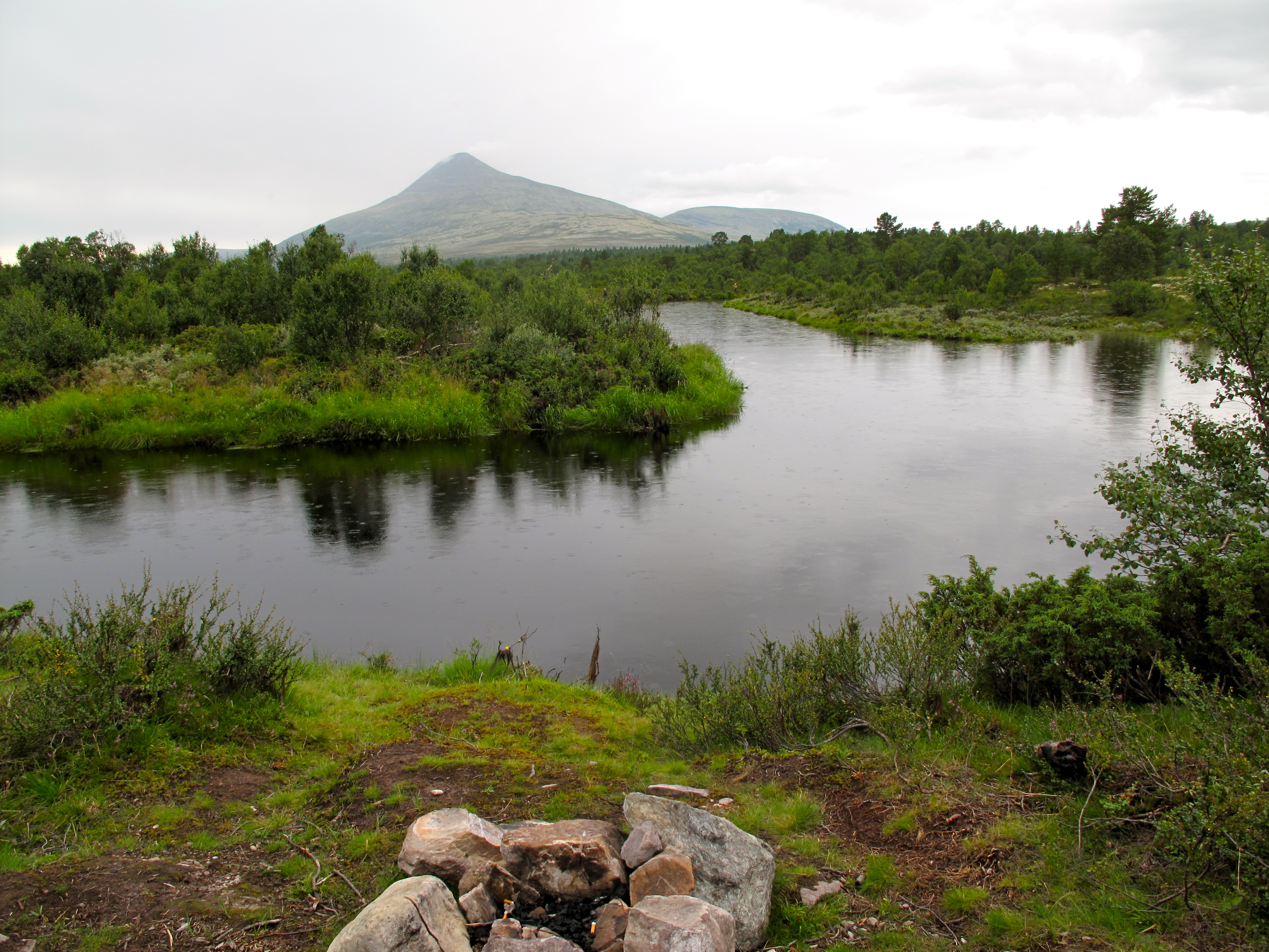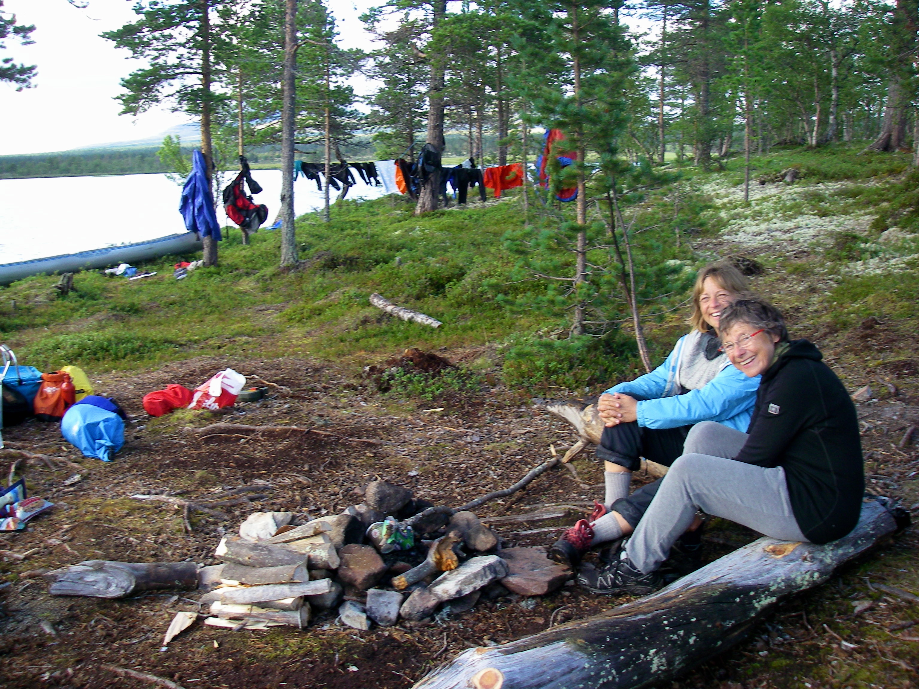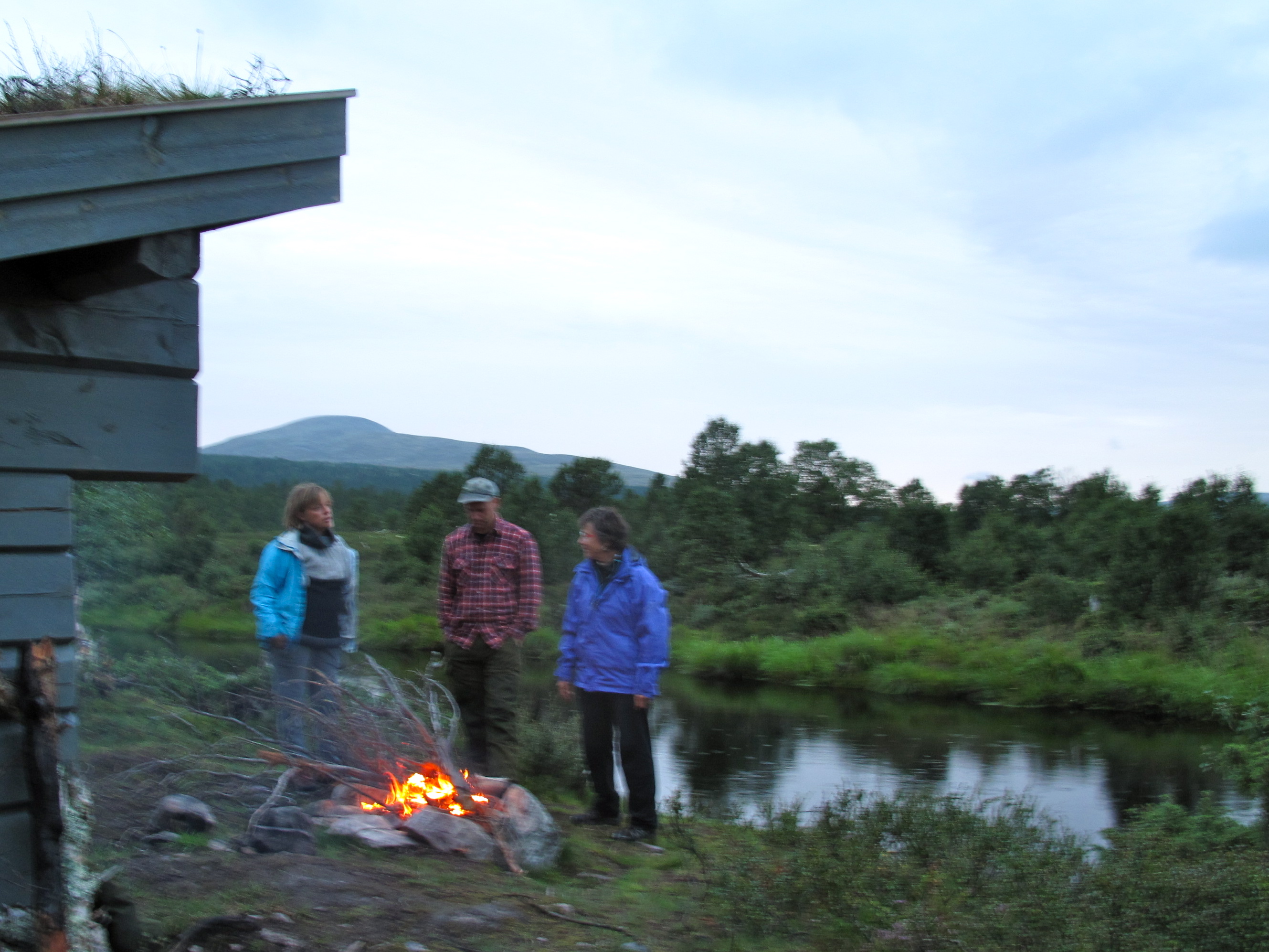 Vi tok av fra Rendalen ved Unset og kjørte østover. Dette er en bomvei, men en flott vei ca 3 mil over fjellet til Sølendalen. Vi kom fram til broa over til Storlægda der vi skulle starte turen. Pappa og Lars Erik kjørte en bil sør til Sølenkroken der vi skulle ende turen mens Mamma og jeg inspiserte elva og området. Siden vi allerede var kommet ganske langt ut på ettermiddagen, regnskyene kom stadig nærmere og vi fant en koselig gapahuk og leirplass rett ved broa bestemte vi oss for å starte rolig med å campe første natta her. Der fikk vi også sjøsatt kanoene og tok en rolig tur litt oppover elva – greit siden det var 15-20 år siden Mamma og Pappa sist satt i kano, og elva sørover startet med et stryk… Vi fikk en flott kveld og feiring av Mammas 64-årsdag med rundstykker og kakao selv om regnet kom, etterhvert ganske kraftig.