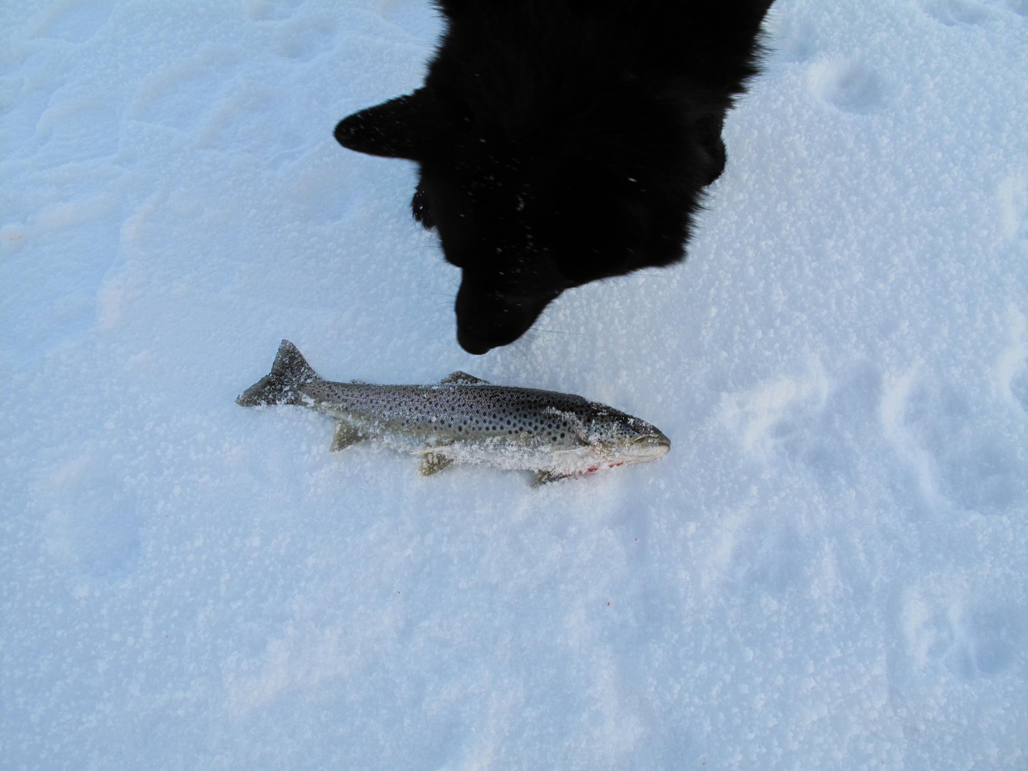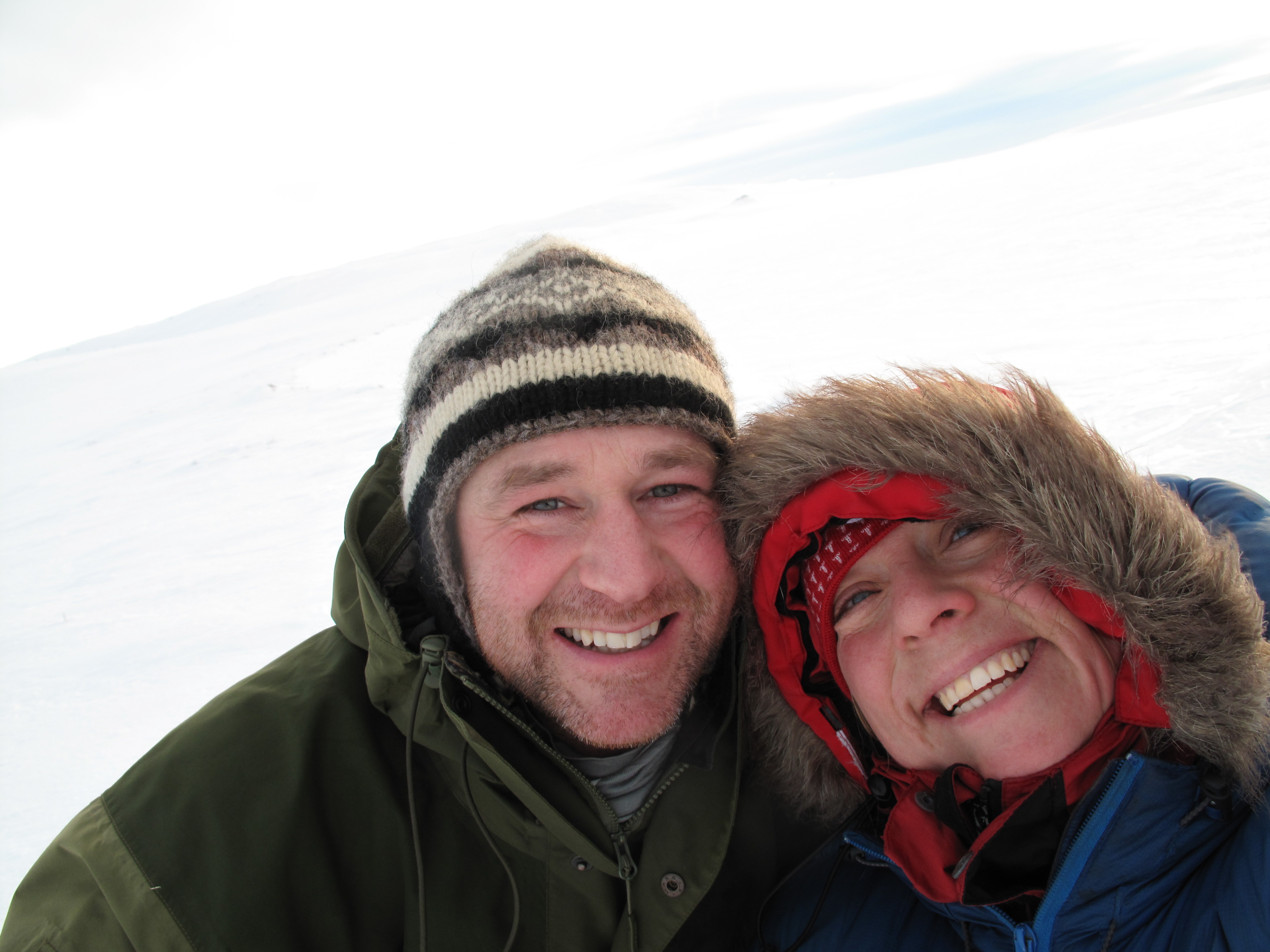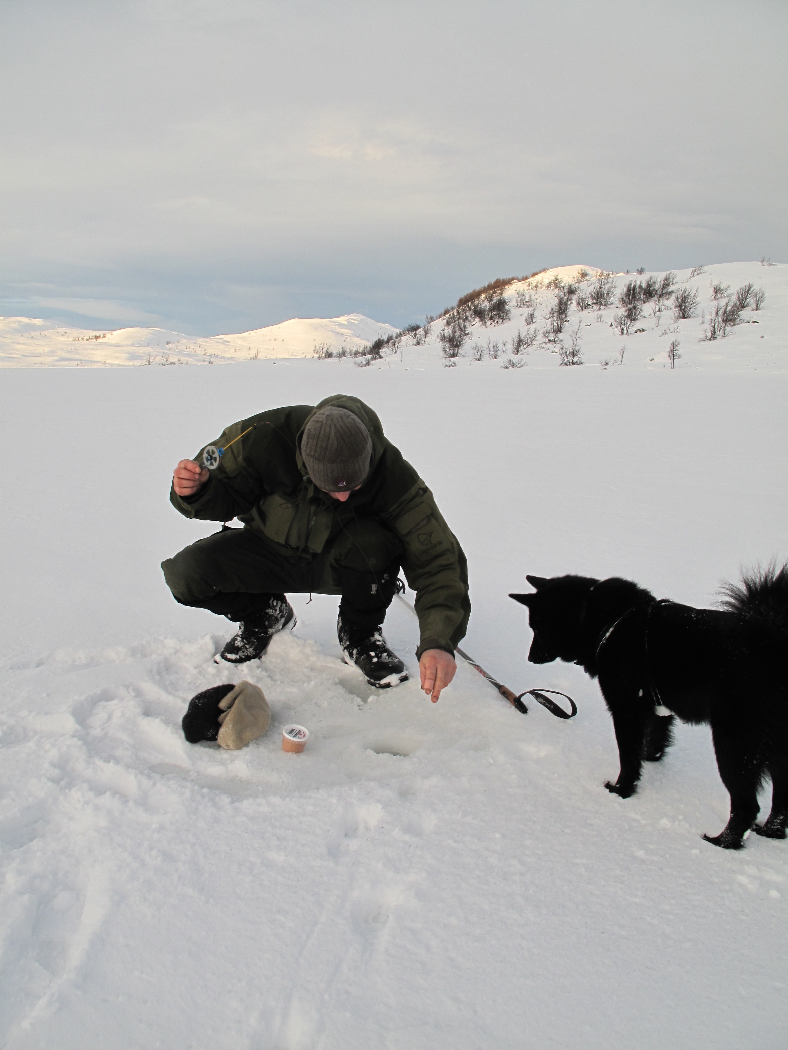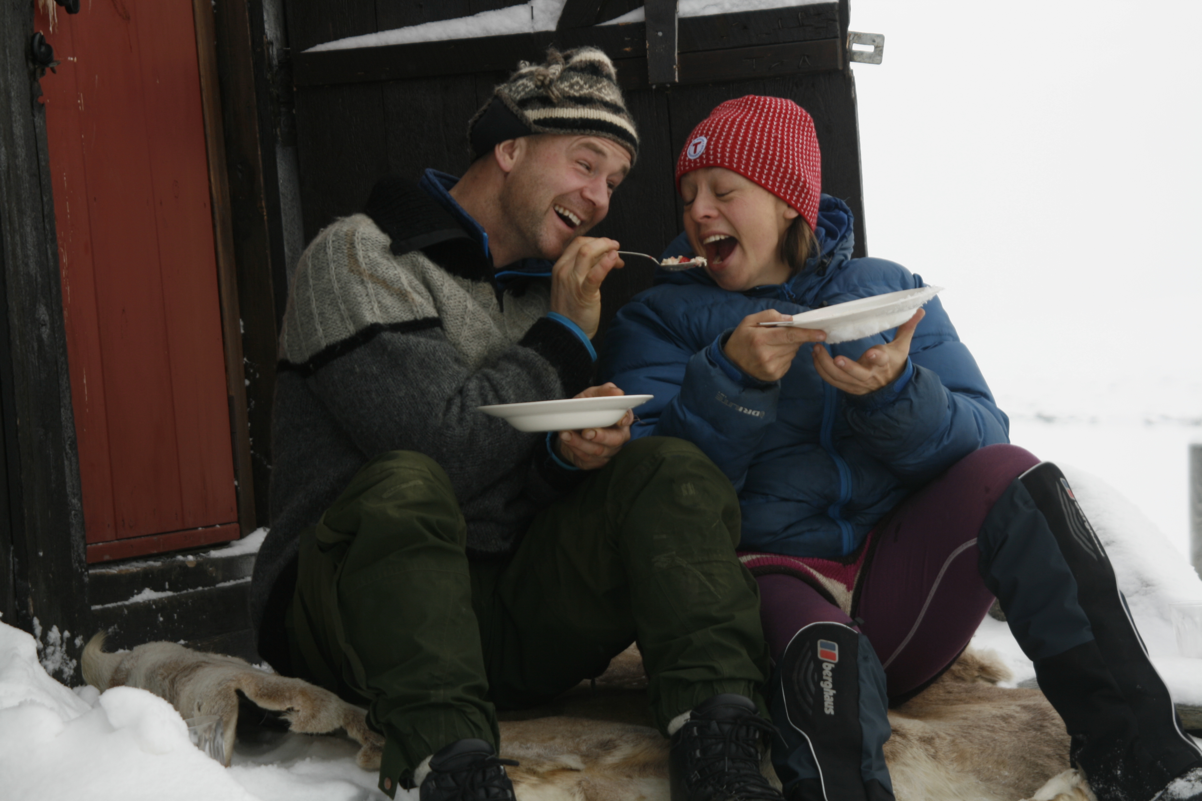 På Megrunnsbua ble vi nyttårsaften og første nyttårsdag. Nyttårsaften laget vi tradisjonen tro pinnekjøtt på primus med poteter, kålrabistappe og stekt flesk som tilbehør. Og i år ble det kirsebærkompott til dessert! Vi så ikke noe «tillaget» fyrverkeri, men himmelen serverte oss de mest fantastiske farger og lyseksplosjoner litt tidligere på kvelden. Første nyttårsdag blåste det godt og vi ble rundt hytta, fisket på isen, gikk på tur opp mot Megrunnskampen og fikk kaffebesøk av en trivelig hundekjører. Utpå ettermiddagen blåste det kraftig opp og på kvelden var det en vindstyrke godt over fornuftig og ferdes ute i. Det ble litt av en ekspedisjon bare å komme seg til utedoen. Men dette været gjorde det bare ekstra godt å sitte inn i en god, varm og koselig hytte.
