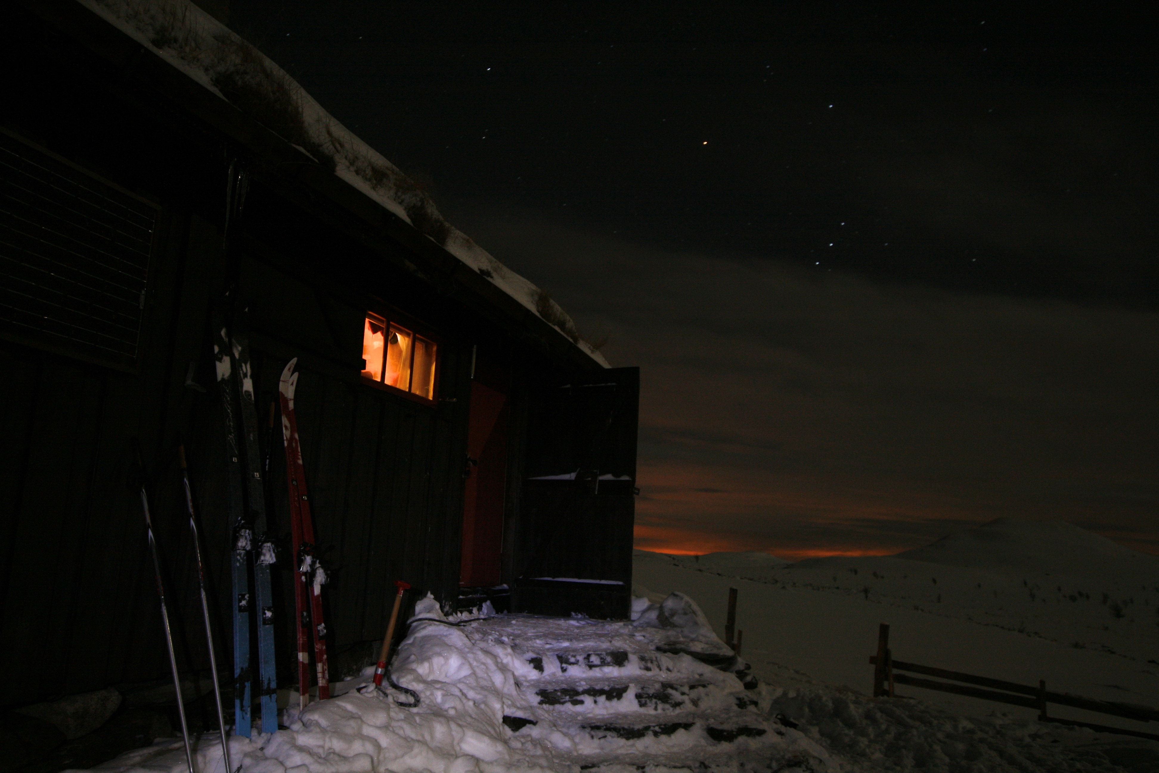 Vi kjørte Gudbrandsdalen sørover fra Trondheim tidlig 3. juledag. Det var vindstille, fint og kaldt (minus 15-20 grader). Ved Vinstra tok vi av fra E6 mot Skåbu. I Skåbu henta vi nøkkel til Svarttjønnholet etter beskrivelse fra bestillingskvitteringen og kjørte videre et kvarters tid ned Espedalen og parkerte ved Espedalen Fjellhotell. Klokka var blitt nærmere to da vi startet og det var en time til det var mørkt. Heldigvis hadde noen gått før oss oppover lia mot Venlisetra, så det var ikke så tungt å gå i all løssnøen. Men sporene stoppet ikke langt fra Venlisetra og det var enda 3 km til dagens mål, Tonebu, noe vi brukte rundt to timer på da snøen gikk opp til lårene og ga etter for hvert skritt… Tonebu er ei dagsturhytte mye brukt av gjester på Espedalens hoteller. Men fullt mulig å overnatte. Det var imidlertid dårlig med ved og det tok en stund fra gradestokken gikk fra minus 12 grader inne til godt opp på plussida. Men vi fikk nå varmen og sov godt i stua!