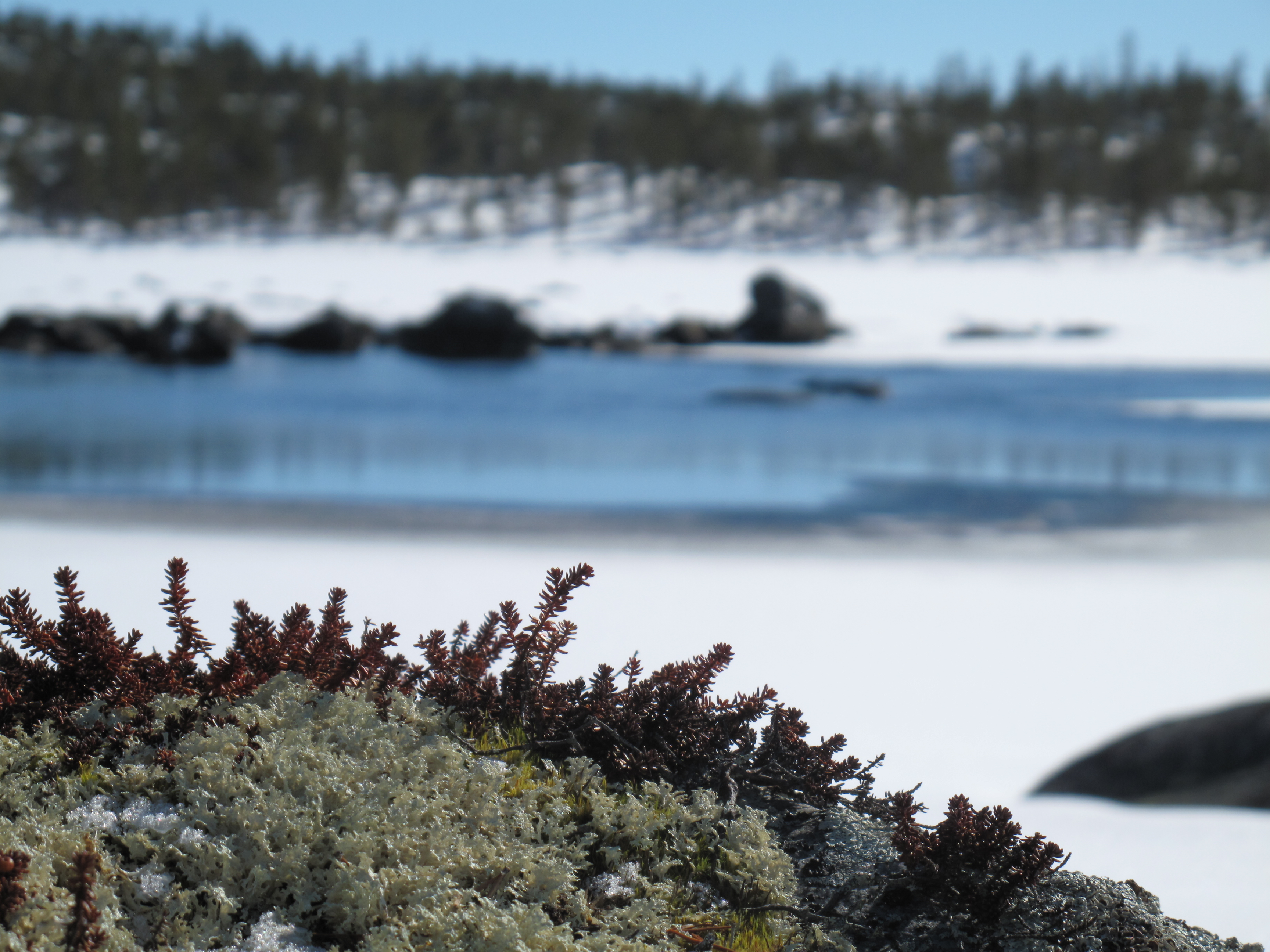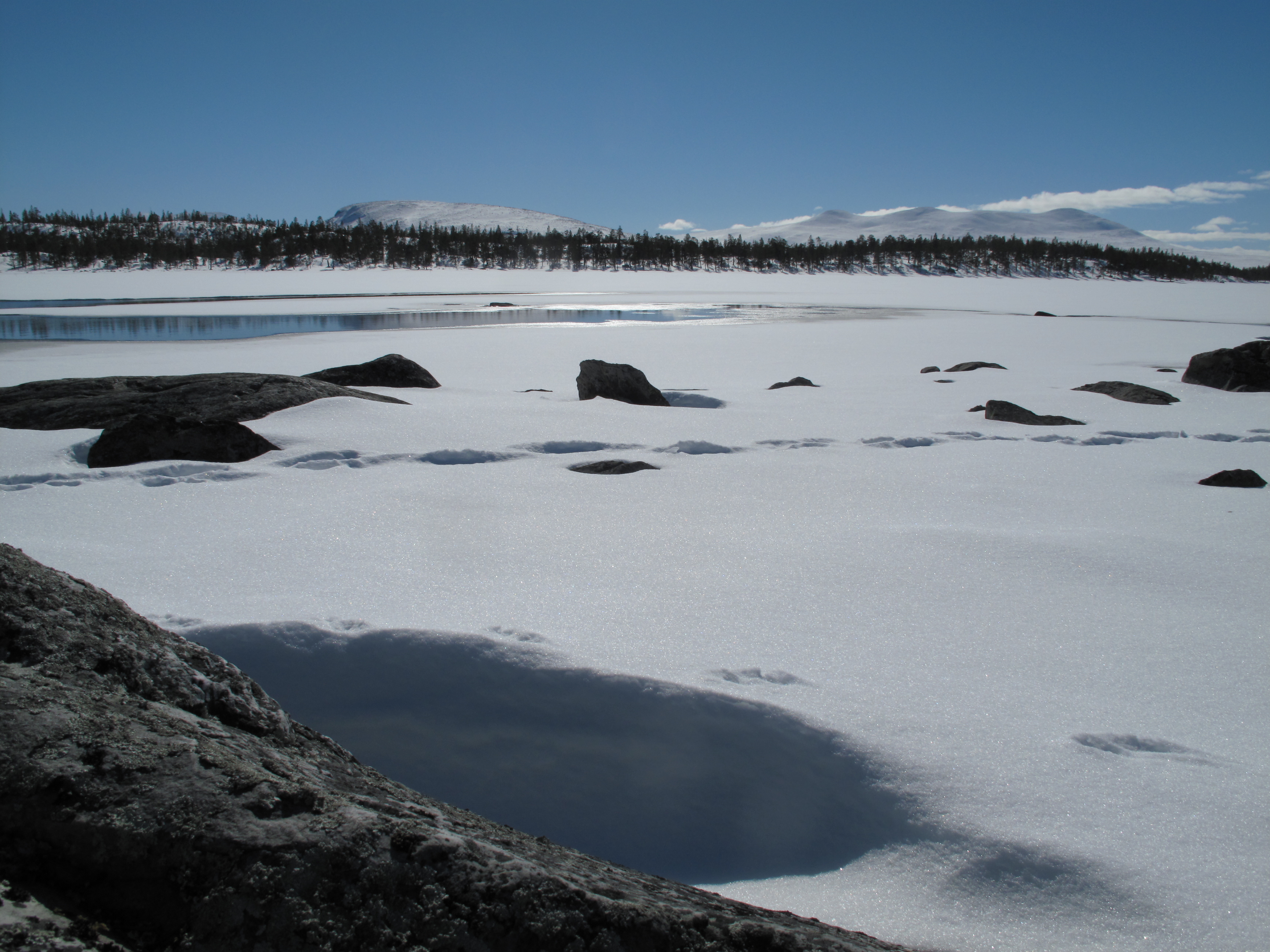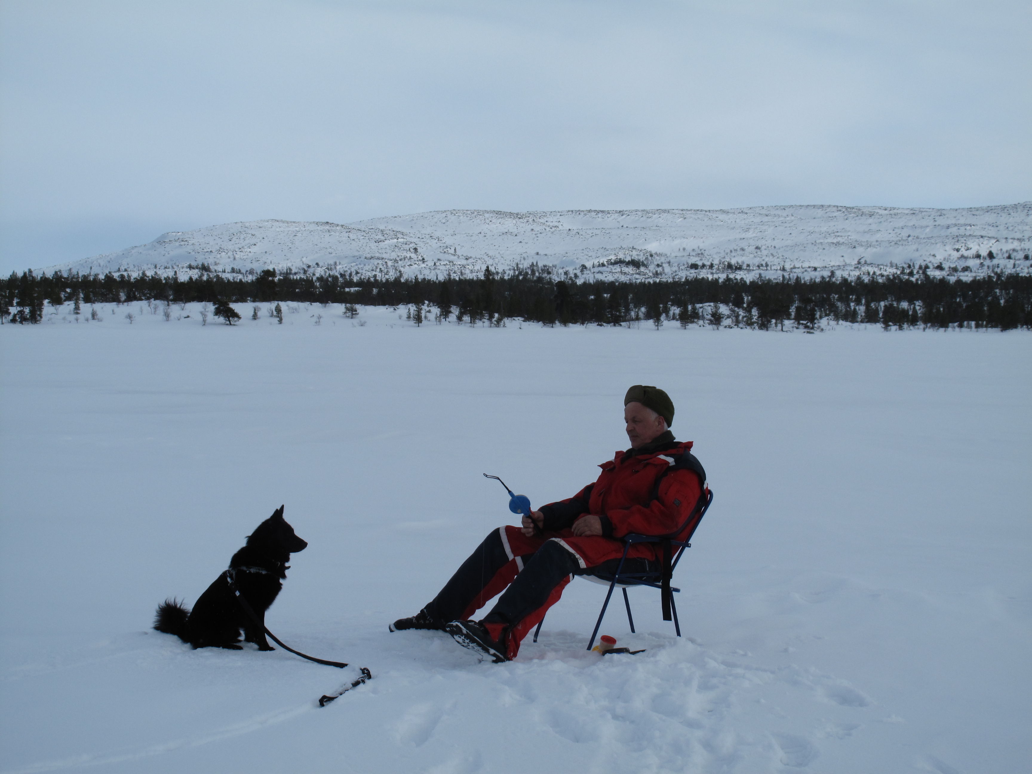 Værskiftet kom natt til mandagen. Det ble plutselig varmegrader, lummert, råtten snø og tungt føre. På kartet så det ut som en tilsynelatende grei tur vestover til Gjettjønna og videre til Halvortjønna, men denne etappen var tung og tidkrevende! Vi så litt mørkt på dagens etappe hvis det skulle fortsette slik. Vi hadde gått 4 km og hadde ca 16 igjen… Heldigvis fant vi scooterspor på Halvortjønna og dagen var reddet. Sporene gikk videre nordvestover mot Ljøsnåvollen, men dreide mer vestover et par km før Ljøsnåvollen. Vi fulgte sporene gjennom nydelig furuskog og tok lunsj rett før vi kom ned til Feragen, ca halvveis over vannet fra «Øya» innerst i østvika. Fra nå av ble både været og føret bare finere og finere og etter en god og lang lunsj tok vi fatt på siste etappe – 8 km på flatt vann over Feragen. Med litt vilje og en god porsjon tålmodighet kom vi til slutt over, og kom frem til sluttdestinasjonen rett før avtalt tid med Åge som kom og hentet oss med bil. Nok en herlig påske over.