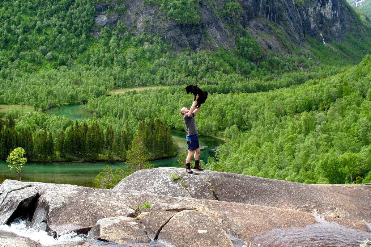 Siste dagen endret været seg og sola kom fram og skinte og det ble en nydelig dag. Vi satte kursen sørvestover til vi traff stien som gikk fra Storskoghytta mot Litlerivatnet. Etterhvert gikk vi på en egg og så utover Storskogdalen – et mektig skue. Mektig var også den over 100 meter høye fossen som rant fra vest i Litlerivatnet og ned i Storskogelva.