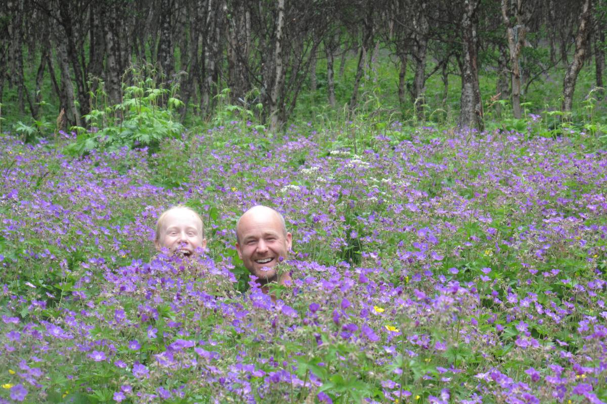 Siste dag gikk for det meste i skogen. Vi tok følge med myggen og stien var mye våt, myrete og gjørmete. Det var likevel et nydelig område med massevis av blomster. Det var likevel godt å komme fram til bilen til slutt. Vi vasket oss i bekken, skiftet tøy, satte på lydboken om Pym og kjørte 7-8 timer direkte sør til Søgne for videre sommerferie.