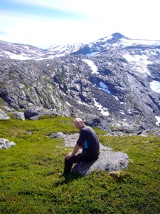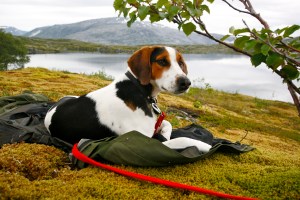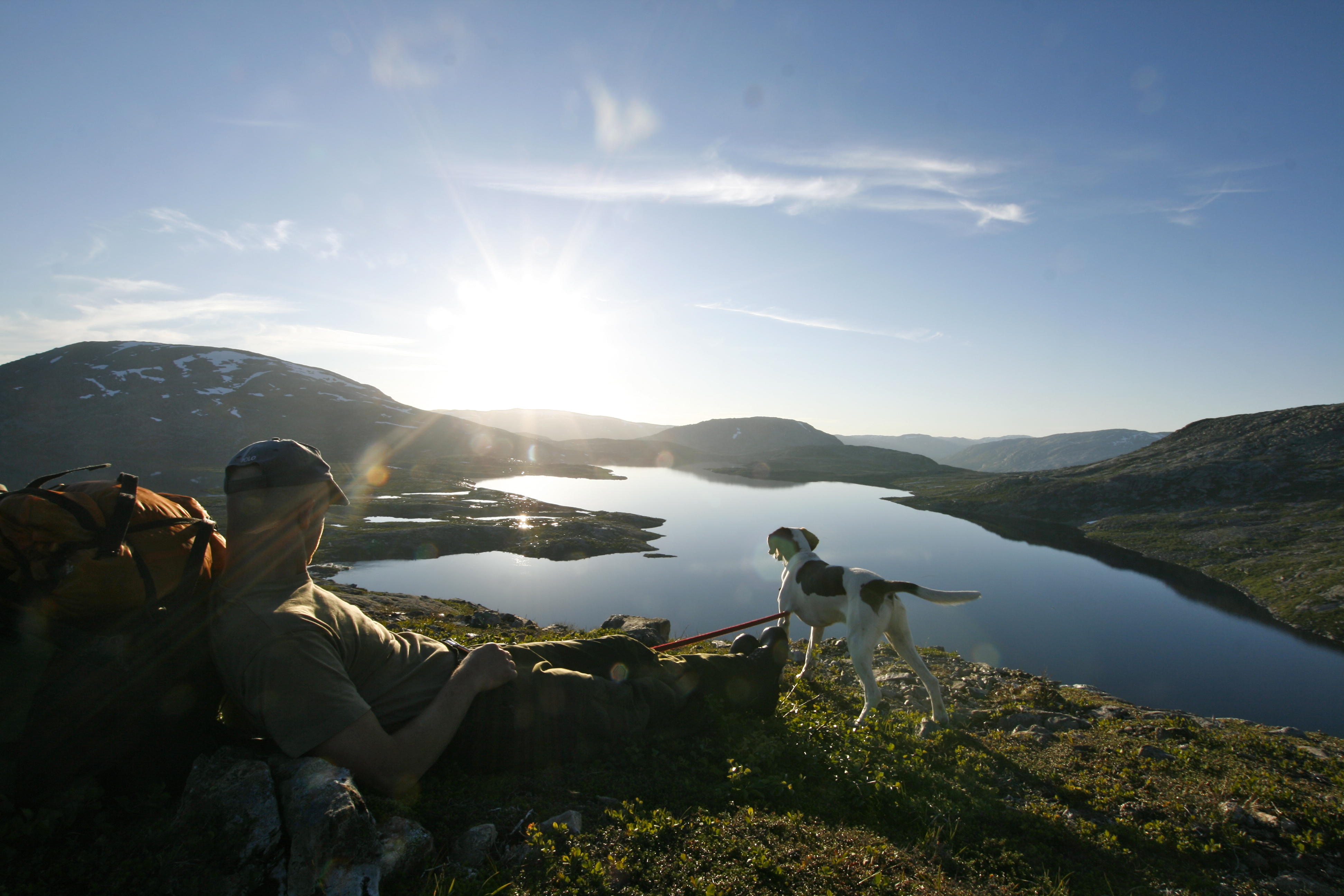 På vei fra Middagsfjellet med Lauvvasstind i bakgrunnenIkke så verst sted å ta en liten dukkertNede igjen ved gamma var Karo glad for å se ossGamma i kveldssol