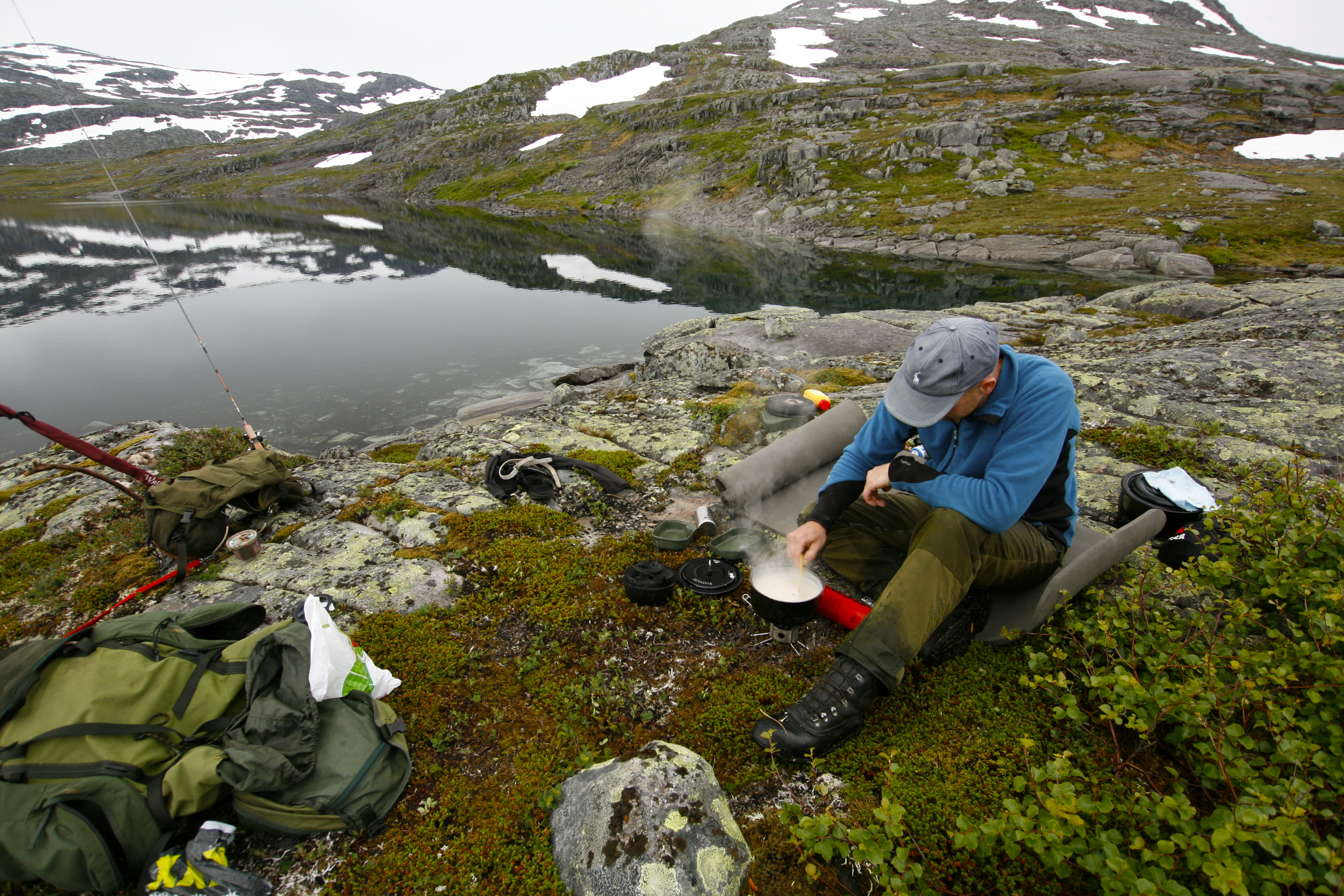 En fantastisk morgenMidt i det vakre fjellriketPannekakesteking fra soveposen skal ikke undervurderes.Deilig frokost med pannekaker......og kaffe