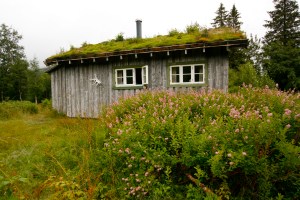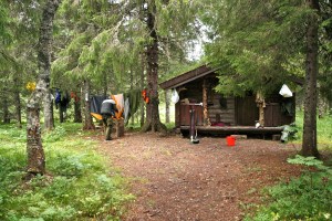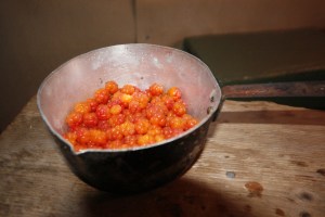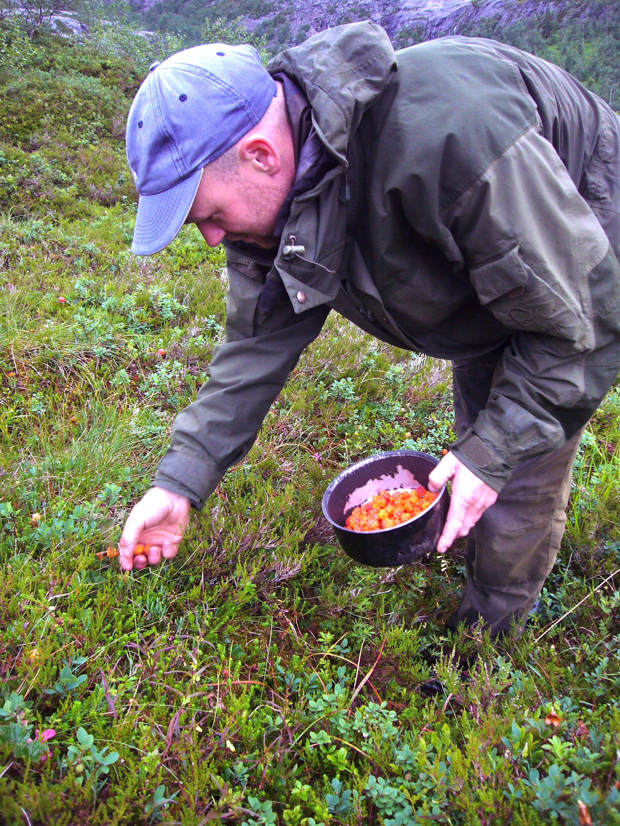 Vi fulgte ryggen og fant en tydelig sti ned til koia. Rett før vi var framme fant vi ei multemyr med mange modne multer. Så vi satte fra oss sekkene, fant noe å plukke i og fikk nok multer til to store porsjoner dessert! Da vi kom tilbake var det bare å pakke ut og henge opp alt det våte – stort sett det meste – før middag og himmelsk dessert.