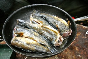 Lars Erik gjør klar en sen lunsj på båletStekt egg og bacon på bål