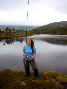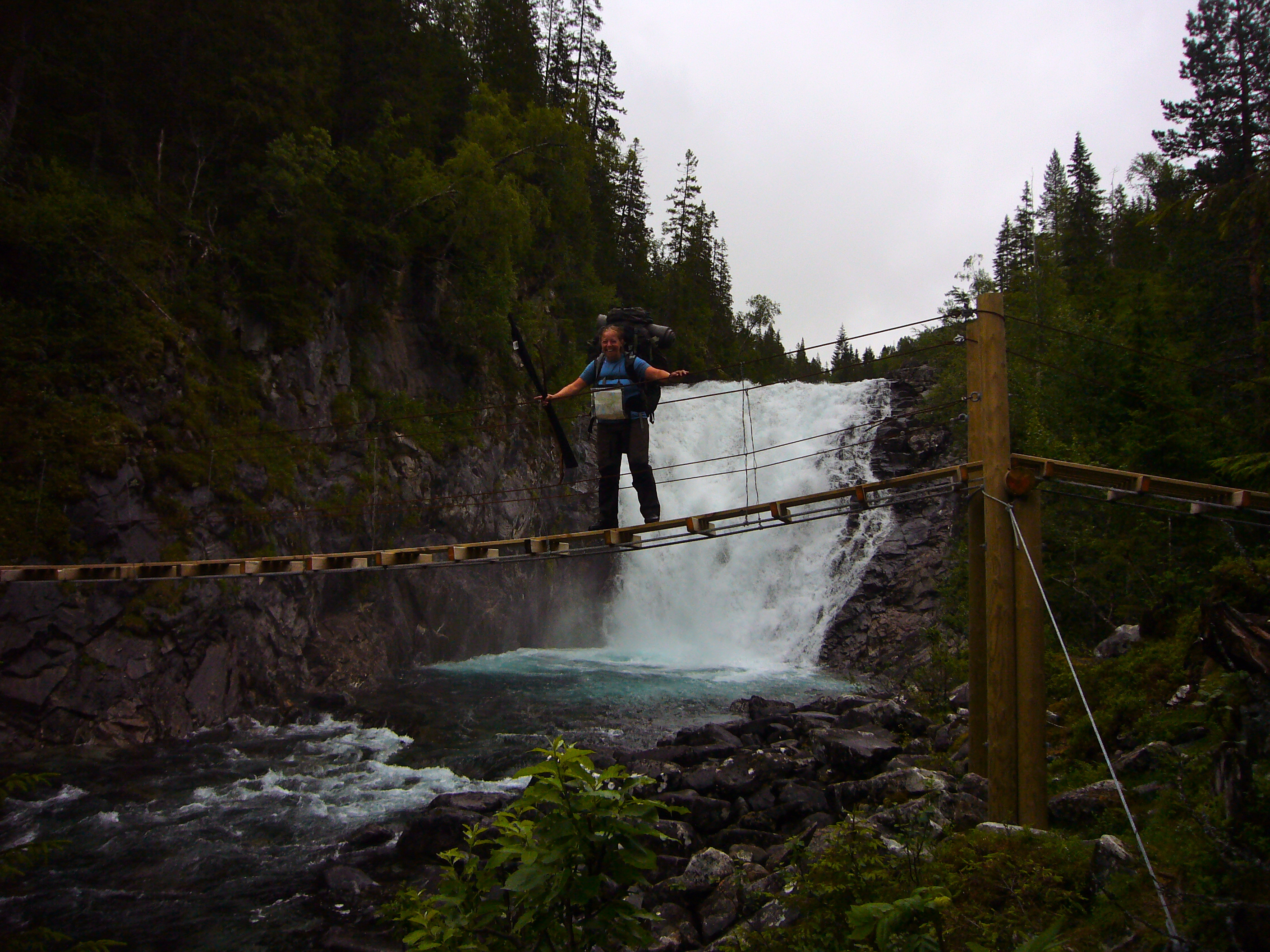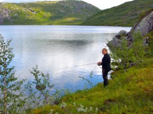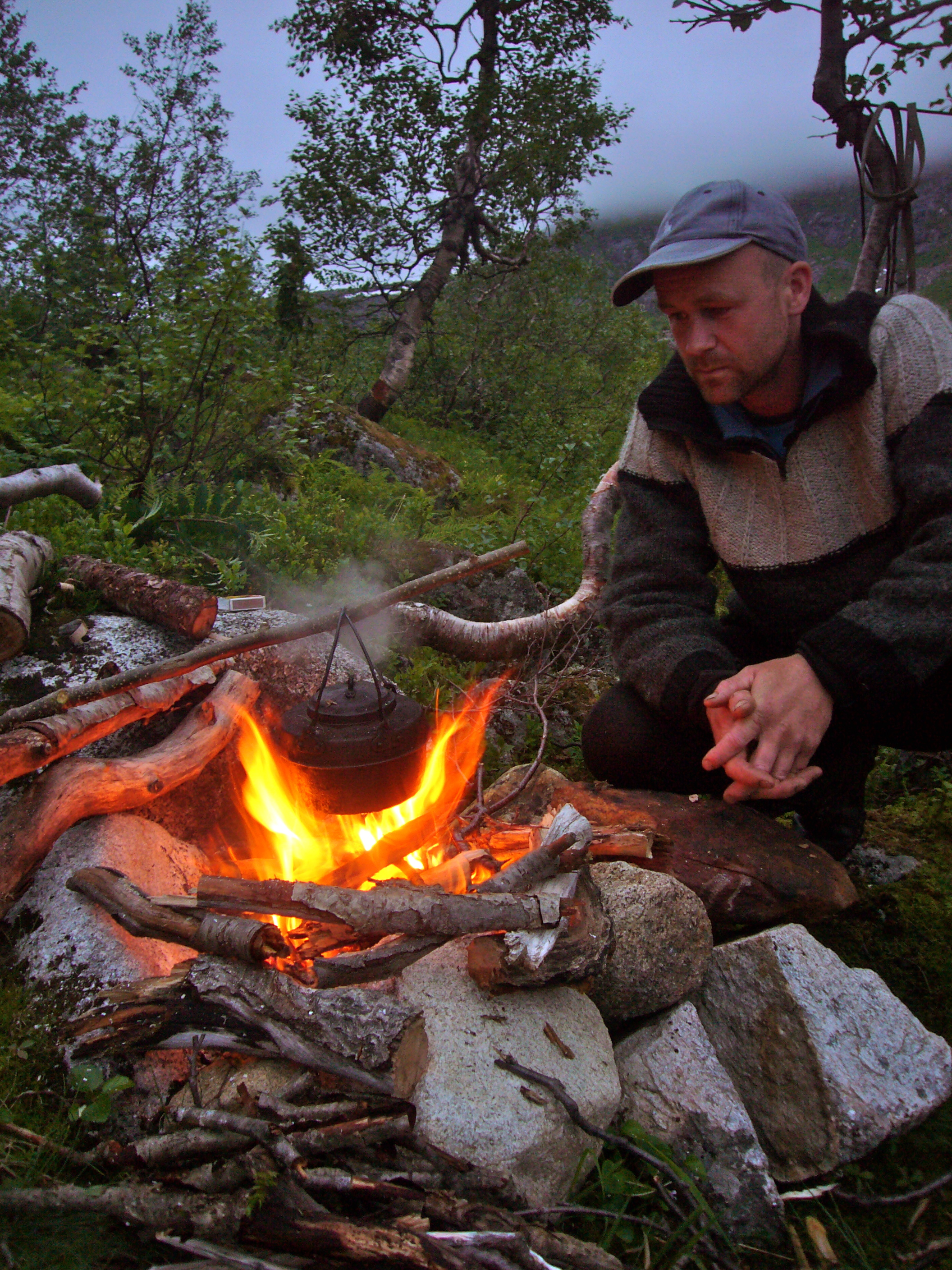 Litt lettere vær i dag og lang og god morgen også i dag. Er luksusen det med sommerdager i nord – døgnet har ikke mange mørke timer, så dagene er lange og ingenting haster. Lars Erik fikk med seg litt mark fra området til agn. Fra hytta fulgte vi godt oppgått sti 500 meter nedover til vi krysset Breidvassfossen over en flott hengebro. Deretter bar det bratt oppover på god sti til vi var oppe på flatene ved Lomtjørnan. For et fantastisk område, Lomsdalen! Skydekket lå på 5-600 meter (altså 2-300 meter over oss), men temperaturen var god og det var lettgått terreng mellom de spredte furuene, svabergene og småvannene. Vi slo oss til for lunsj ved det største vannet, rett sør for Medheiforsen. På veien oppover kneika hadde vi funnet noen kantareller og før vi gikk fra koia hadde vi satt brøddeig som hadde hevet, så til lunsj ble det ferske rundstykker stekt på bål, med kantareller og bacon på! Det smakte fortreffelig og fraværet av fiskelykke og fiskelunsj ble nesten overskygget.