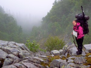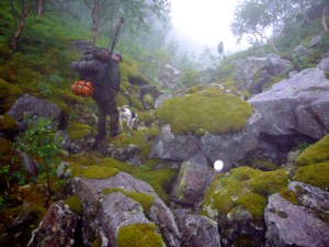En grå morgen, men frokostgrøten smaker nydeligKaro nyter lunsjpausen ved nedre Breivatnet like mye som ossPå toppen av steinrøysa ned StrompdalsbrotetI bregneskogen og juvet nedover mot StrompdalskoiaBak oss ser vi tåkeheimen vi kom ned gjennom…Himmelsk dessert plukket rett utenfor Strompdalskoia