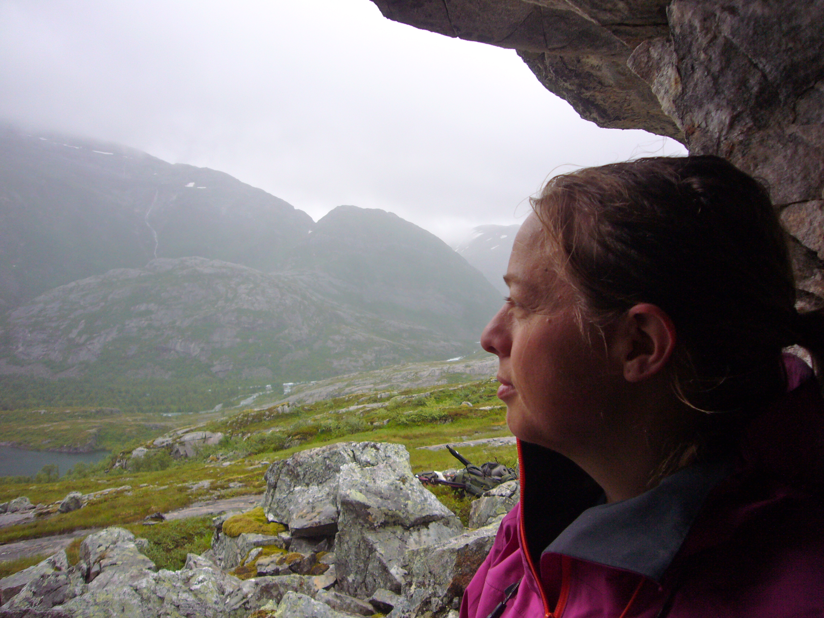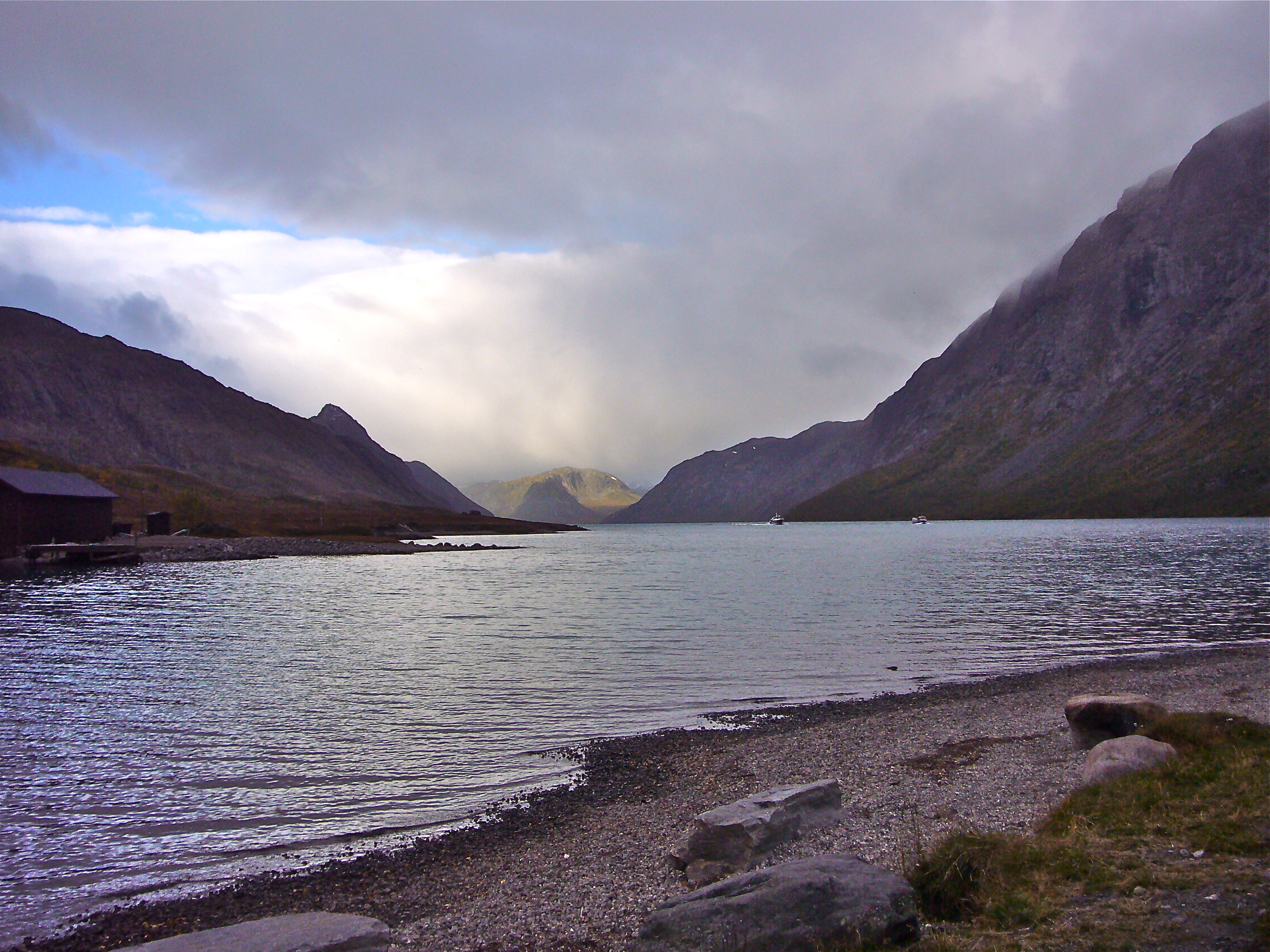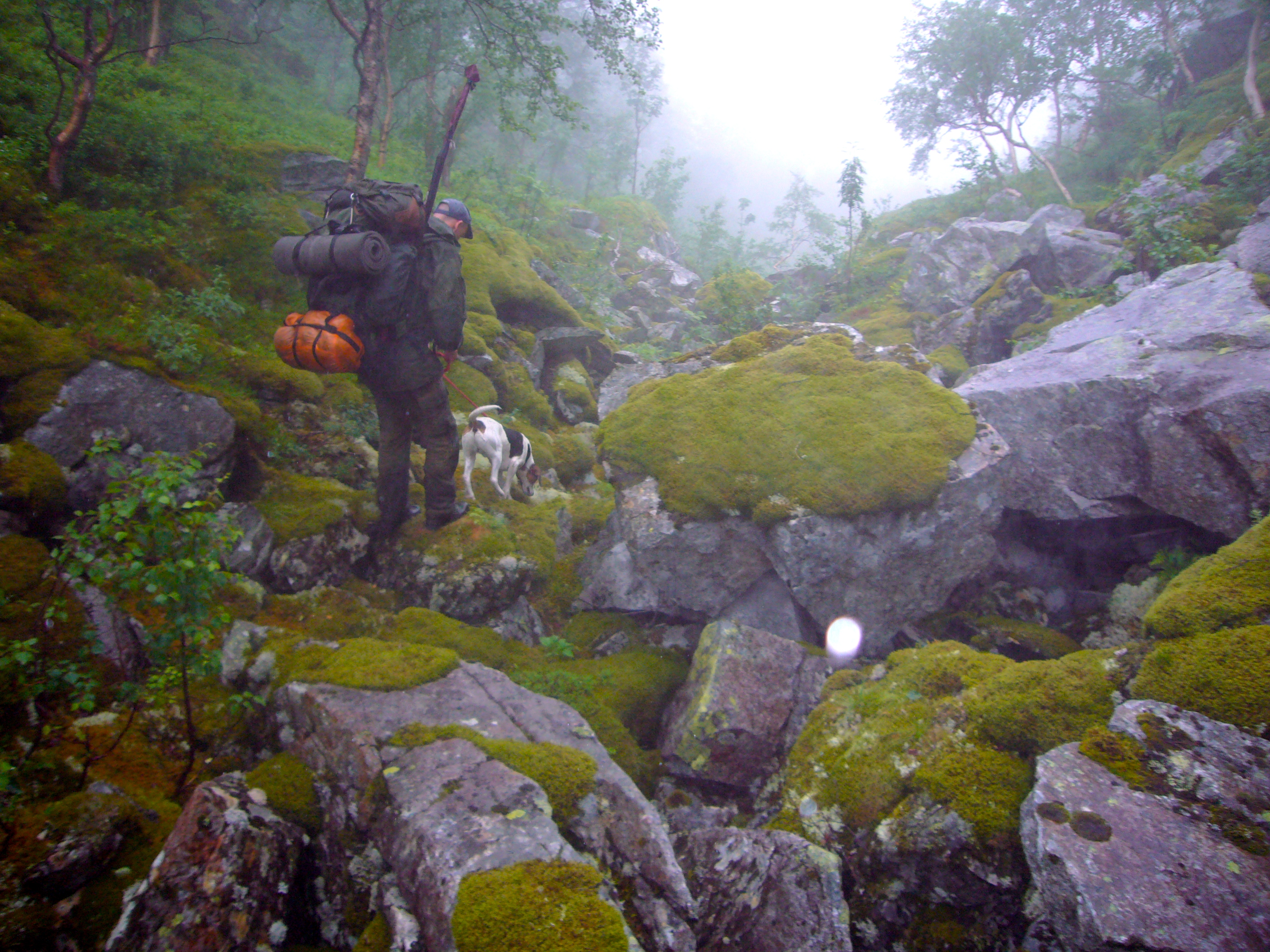 Planen i dag var å gå opp Grunnvassdalen – en bratt og ganske krevende, steinete tur så det ut som. Men etter at det hadde regnet jevnt hele natta og også morgenen og skydekket lå på 5-600 moh la vi om ruta og bestemte oss heller for å gå rundt Middagsfjellet og til Nedre Breivatnet og en gamme på nordsiden av vannet. Ruta ble lagt over Grunnvassheia og rundt Middagsfjellet på ca 3-400 meters høyde. Vi fikk igjen konstatert at kilometrene i Lomsdal – Visten kan være mer krevende enn de ser ut på kartet. Myr, lyngtuster, steinrøyser, svaberg, bjørkeskog og elver som varierer veldig i størrelse etter nedbøren siste døgnet. Flott er det, men ruta går i sikksakk for å finne det beste lendet å gå i. Rett før vannene på Medheia tok vi lunsj under en bitteliten heller, med utsikt over hele Lomsdalen. Nydelig! Regnet tok en pause og sola viste oss noen få stråler før den gjemte seg igjen og tåka overtok. Vi gikk sørvestover til vi kom til vannet på 310 moh, rundet dette og neste vann og gikk sørøstover mot Nedre Breivatn. Vi kom etter litt inn på en sti som førte oss til gamma på odden nordøst i vannet. Det har tidligere stått en samisk gamme (eller kåte) her, men denne er ødelagt. I 1990 ble det laget en tilsvarende ny for overnatting. Her er det god plass til to personer, men det går også med fire gode venner. Vi måtte tette litt på taket, men etter det ble den super å bruke og vi gikk inn og fyrte bål, laget middag og kaffe. I mellomtiden sluttet det helt å regne. Lars Erik tok en kveldstur med fiskestanga og kom tilbake med 4 ørret på 100-400 gram. Vi hang de opp under taket for røyking. Rundt midnatt kom månen fram over Brevasstinden i en liten glipe i skylaget – og det var ikke mindre enn fullmåne! Nydelig!