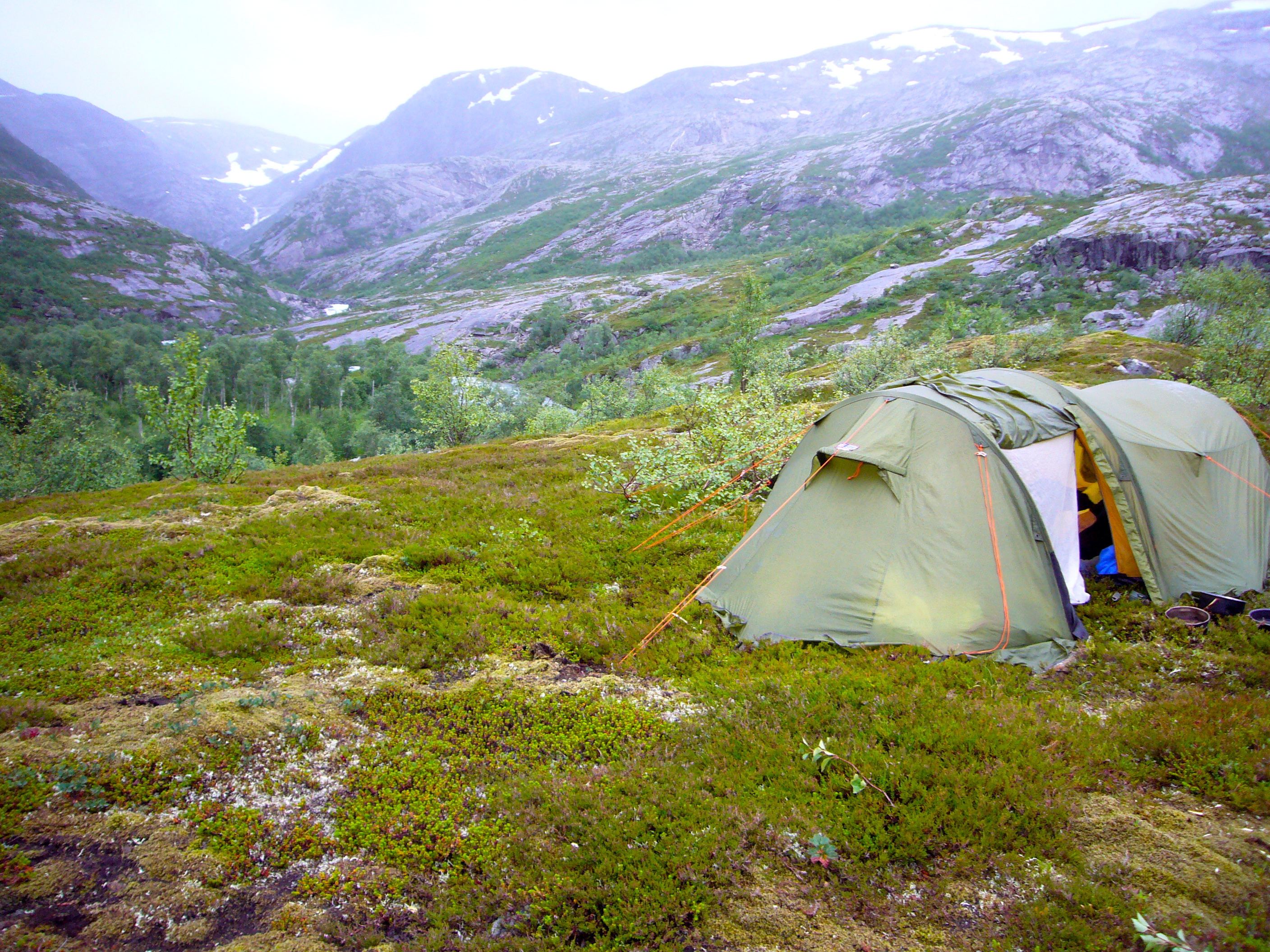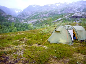 Teltet i forgrunnen og Grunnvassdalen i bakgrunnenMultemyra