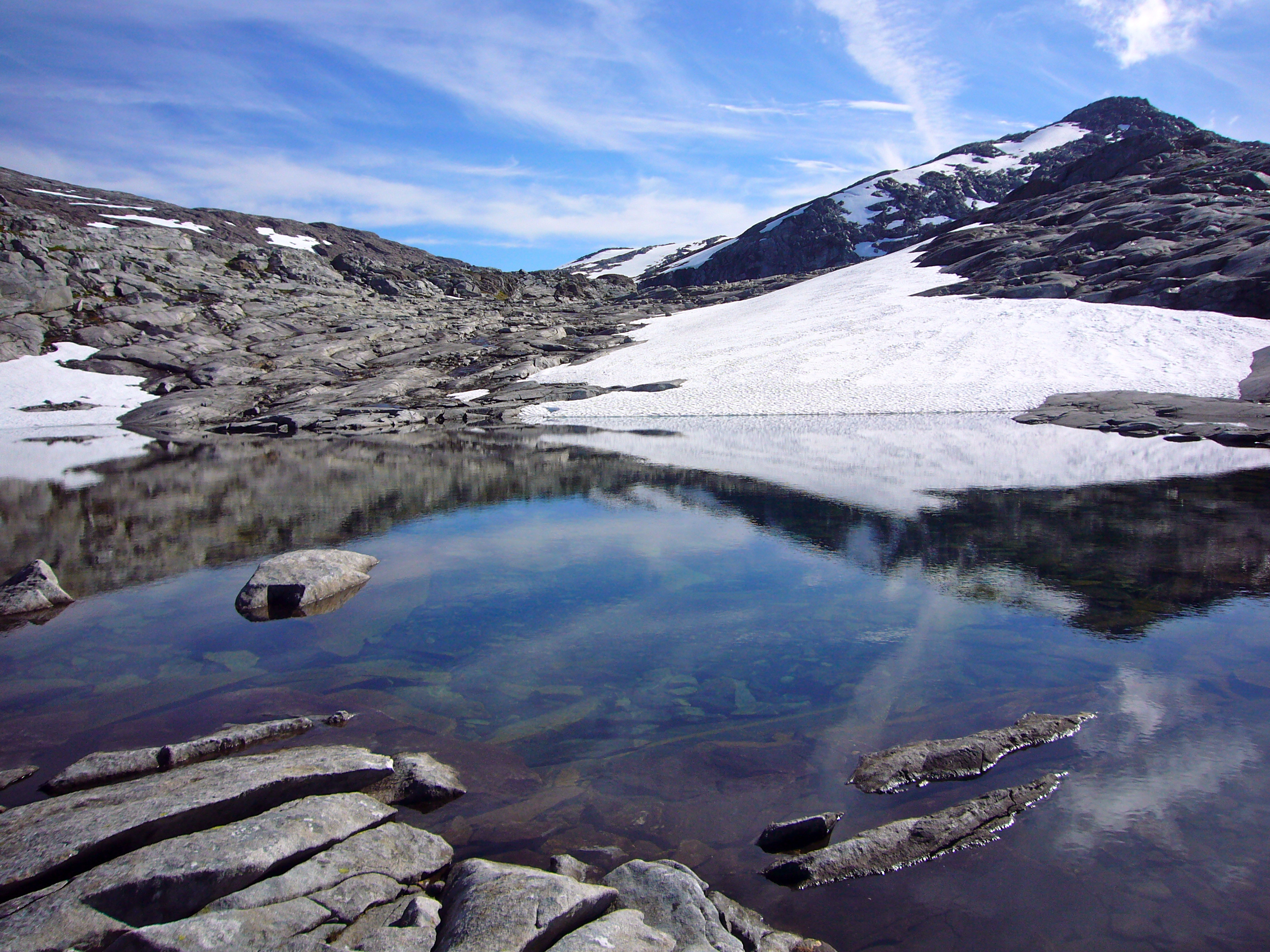 Ved vestre enden av øvre Bjørnstokkvann tok vi en lengre stopp og fant fram fiskestengene. Dette var første gangen jeg fisket med min nye – og første – fiskestang så det var en høytidsstund for meg (men fisken uteble til et senere vann…). Det ble to ørreter på Lars Erik, begge i elveutløpet. Deilig med nystekt ørret i sola før vi gikk videre i syv-åtte tida på kvelden. Vi fulgte stien, eller i alle fall traseen der det går en sti på kartet – den var ikke synlig i virkeligheten, men enkelt terreng å gå i om enn litt småkupert. Da vi kom på toppen av eggen mellom Bjørnstokken og nordre Snøfjellet fikk vi en fantastisk utsikt over Breivatnan og området mellom. Det var skyfritt og klokka nærmet seg ni. Vi ble sittende her og nyte utsikten en stund. Nedover mot flatene mellom øvre og midtre Breivatn hadde store svaberg som var flotte å gå på i så tørt og fint vær som vi hadde. Vi måtte vade over elva mellom øvre og midtre Breivatn og videre fulgte vi stitraseen og fulgte vestsiden av midtre Breivatn til odden som stikker ut nesten helt nord i vannet. En utrolig flott odde. Det var blikk stille og sola var akkurat gått ned. Vi måtte lete litt for å finne en teltplass som ikke var myr, men fant til slutt en flate med plass til 3-4 telt. Det var en herlig sommernatt, og det ble nok et lite fiskemåltid før vi la oss inn i teltet og rømte fra myggene.